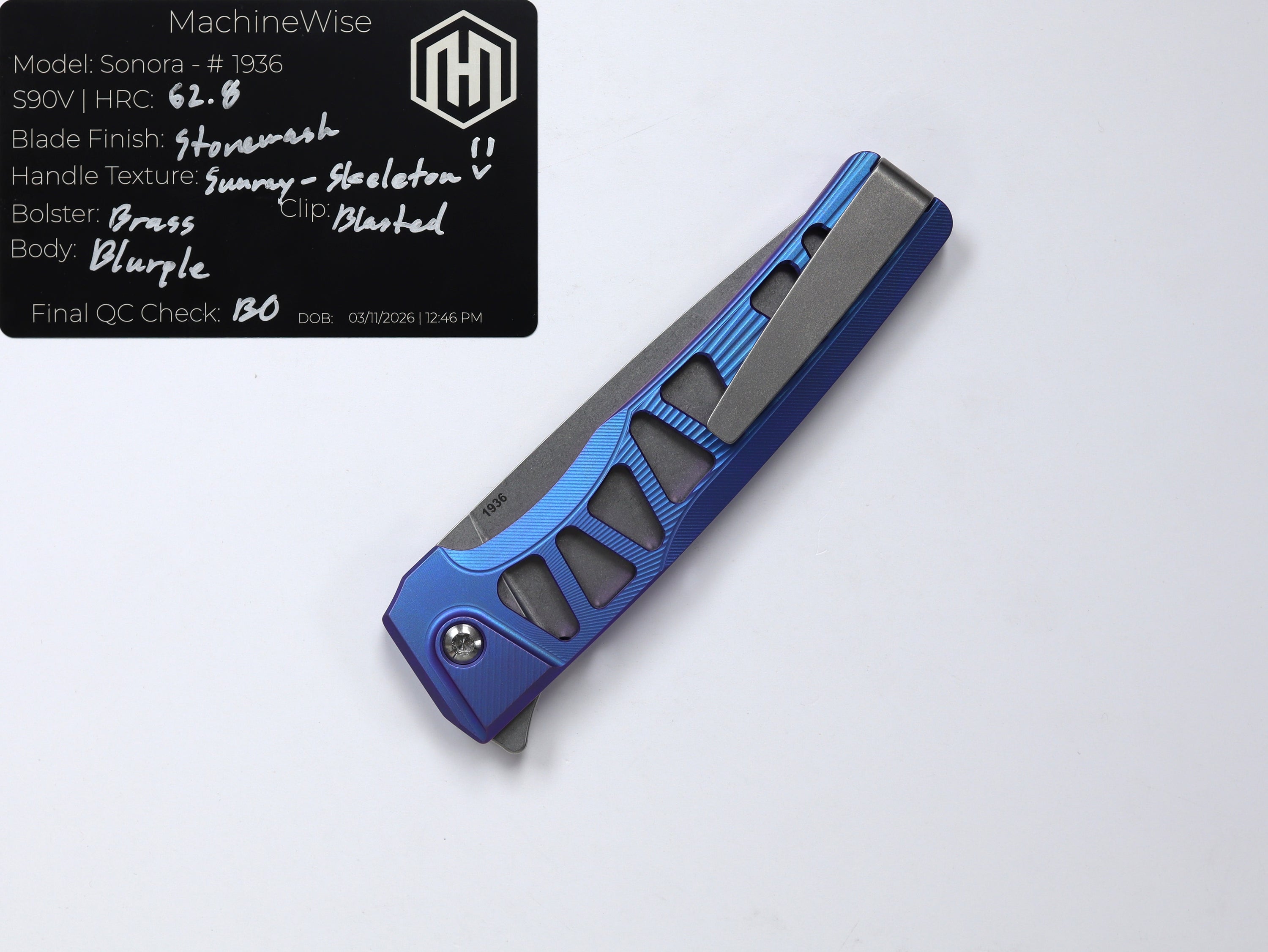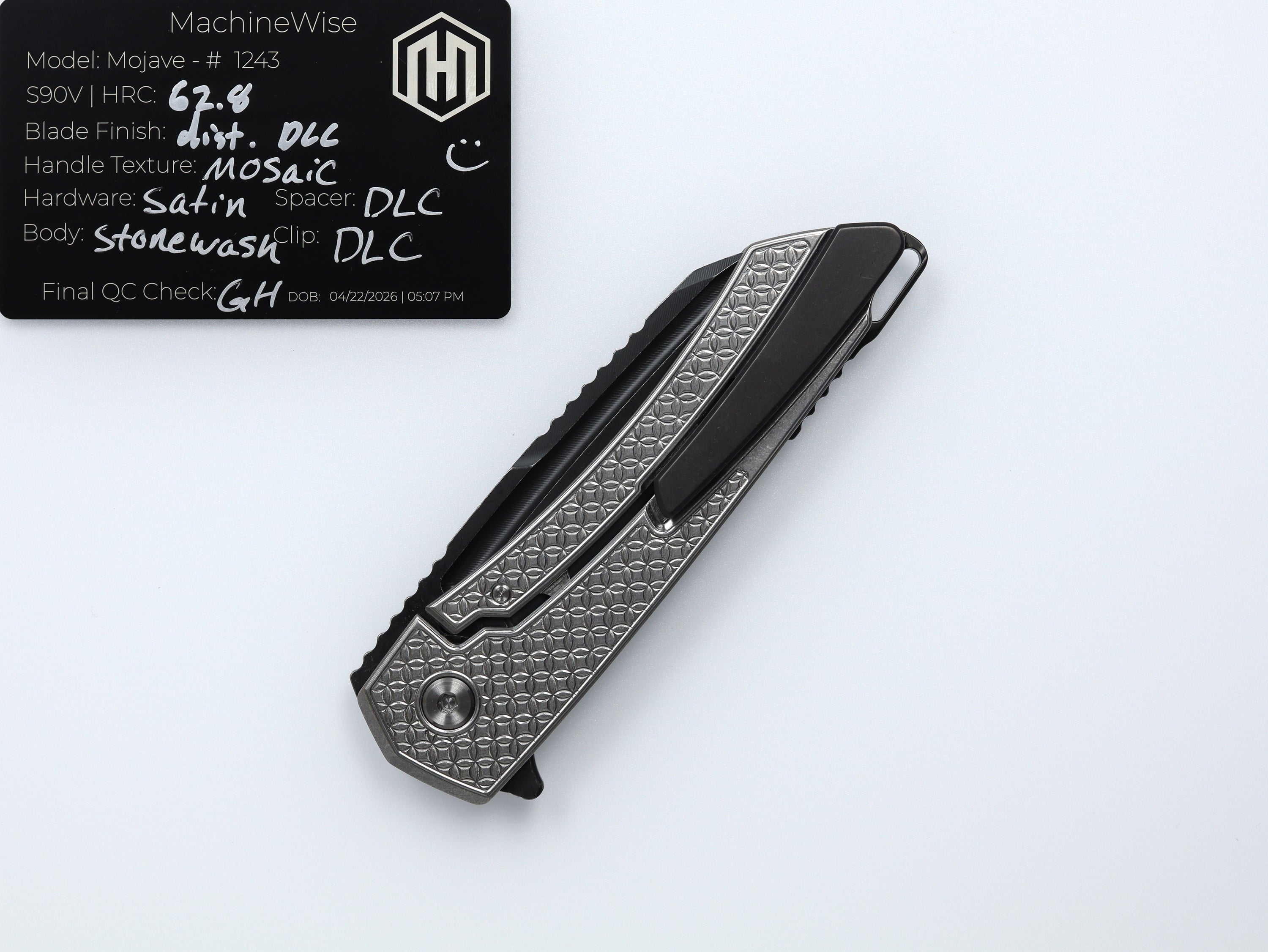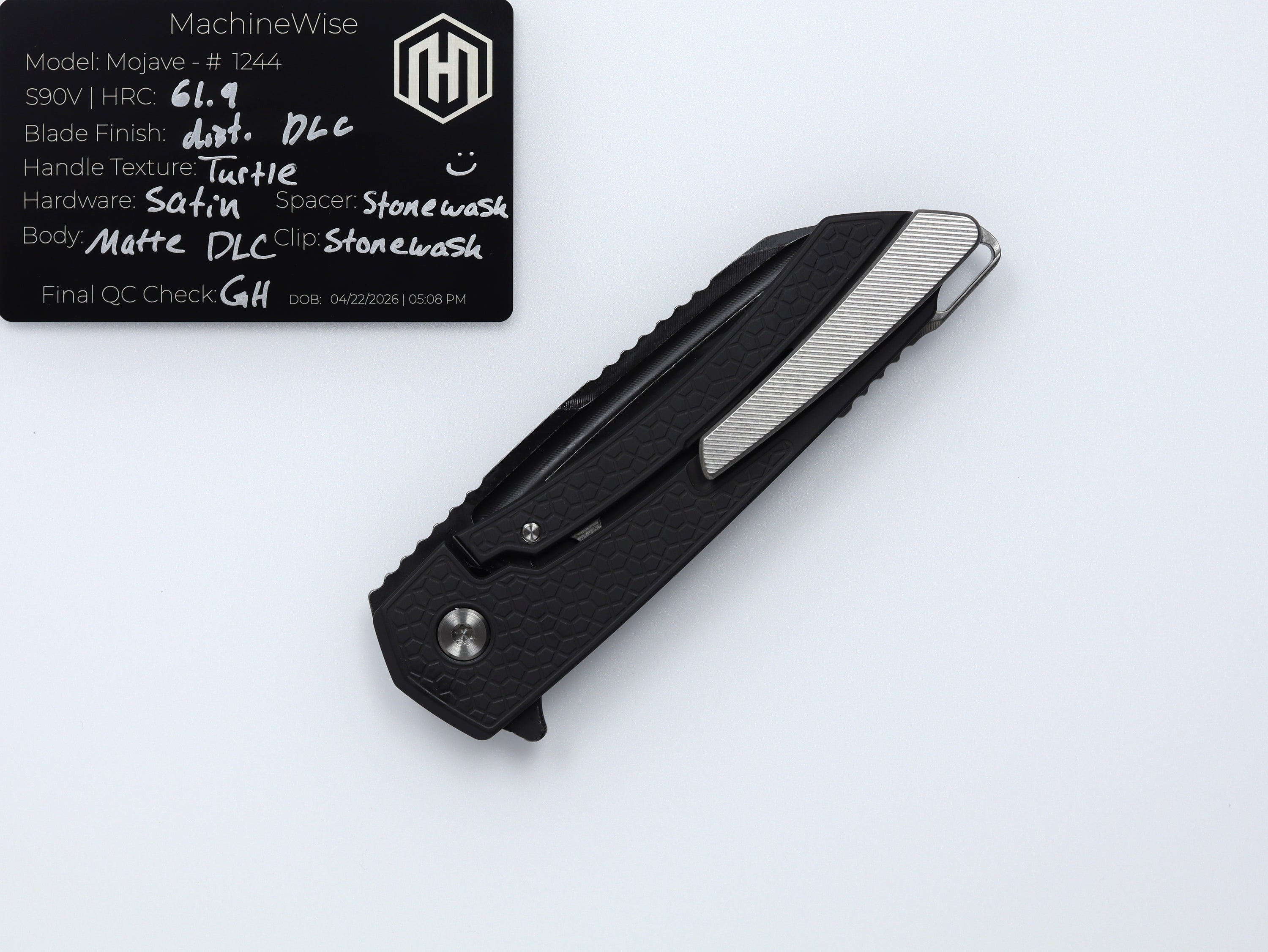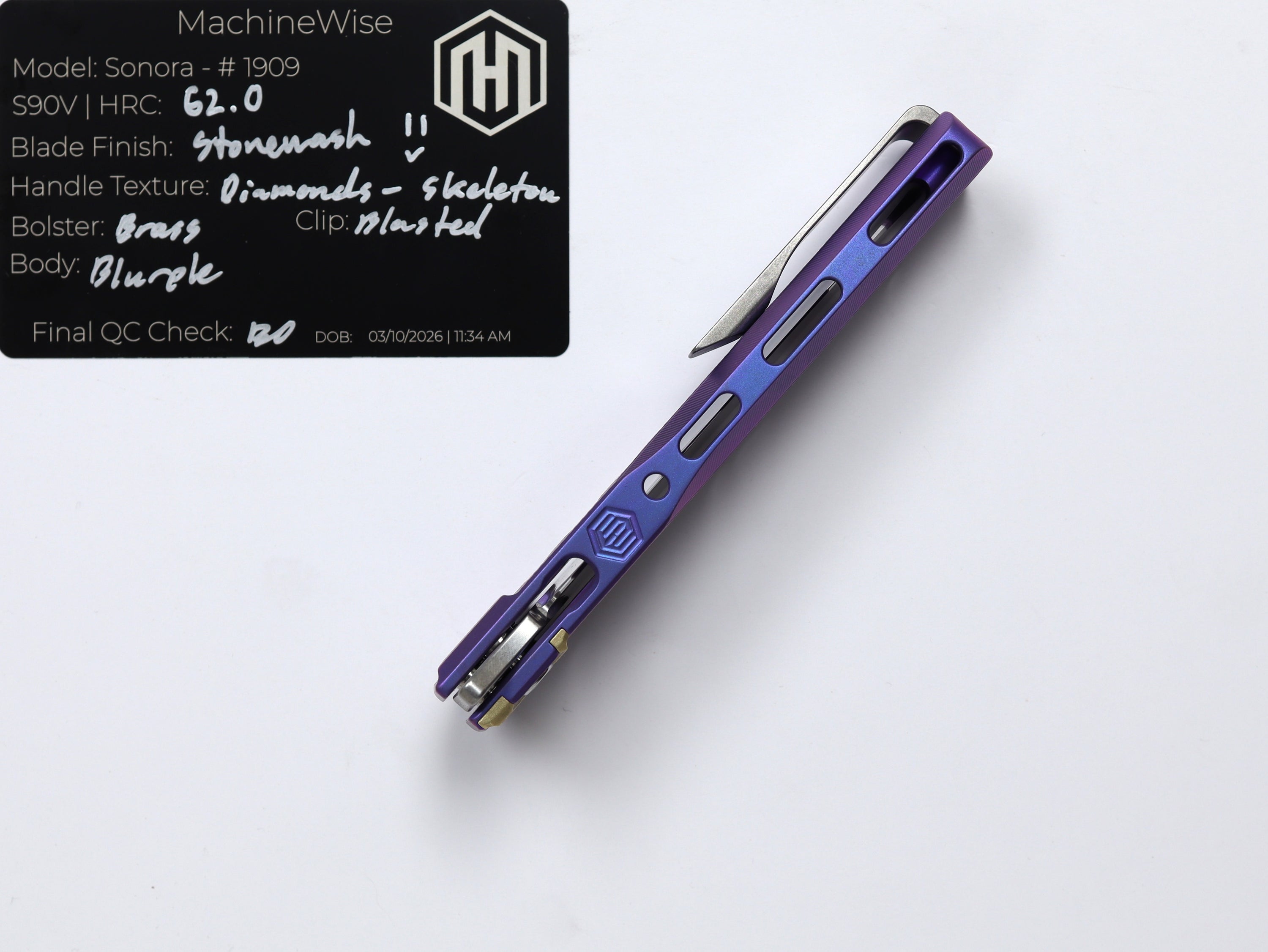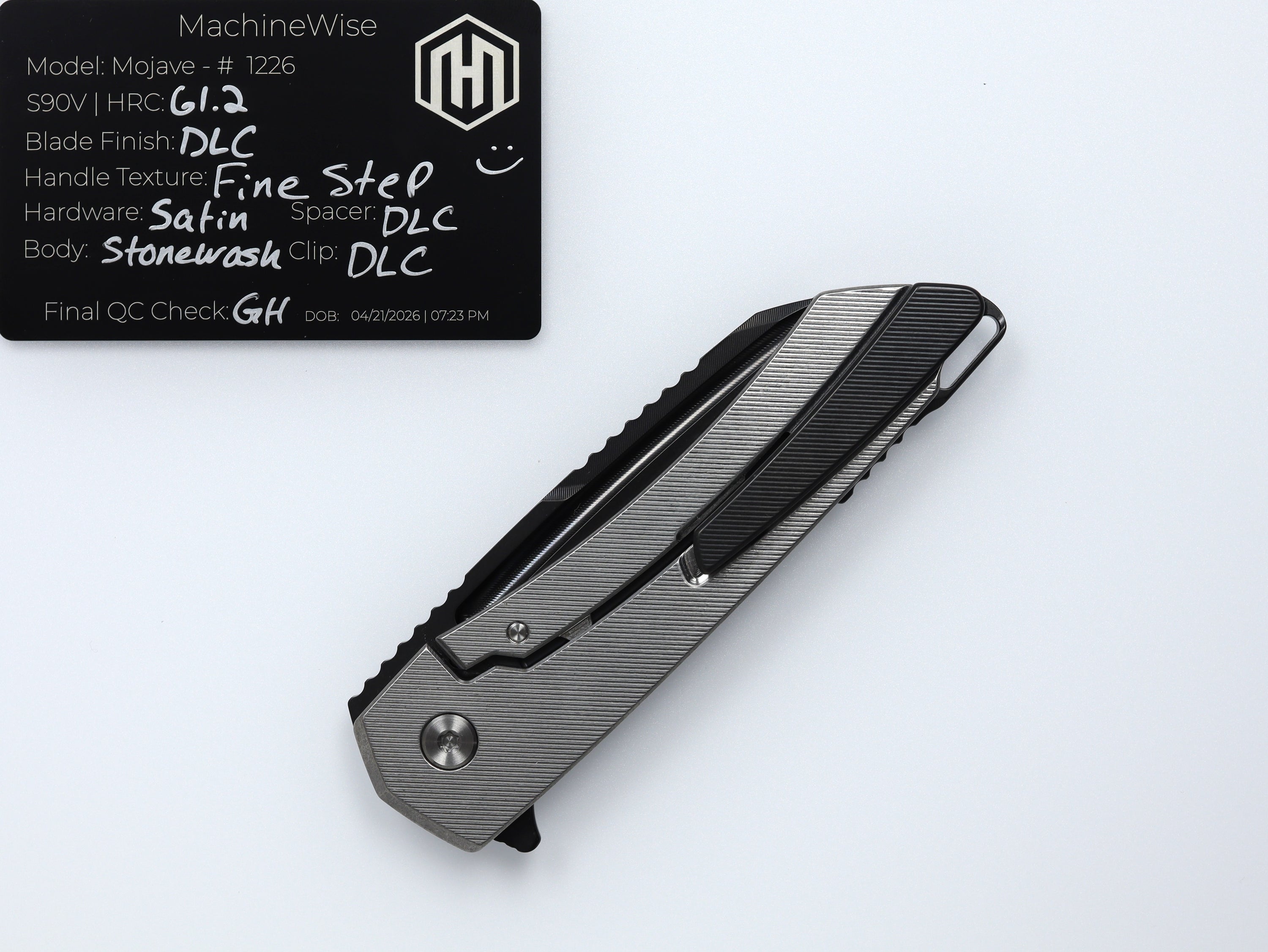 A button lock folder built in-house by the MachineWise team. Now available with DLC blades and skeletonized handles in the Custom Shop.