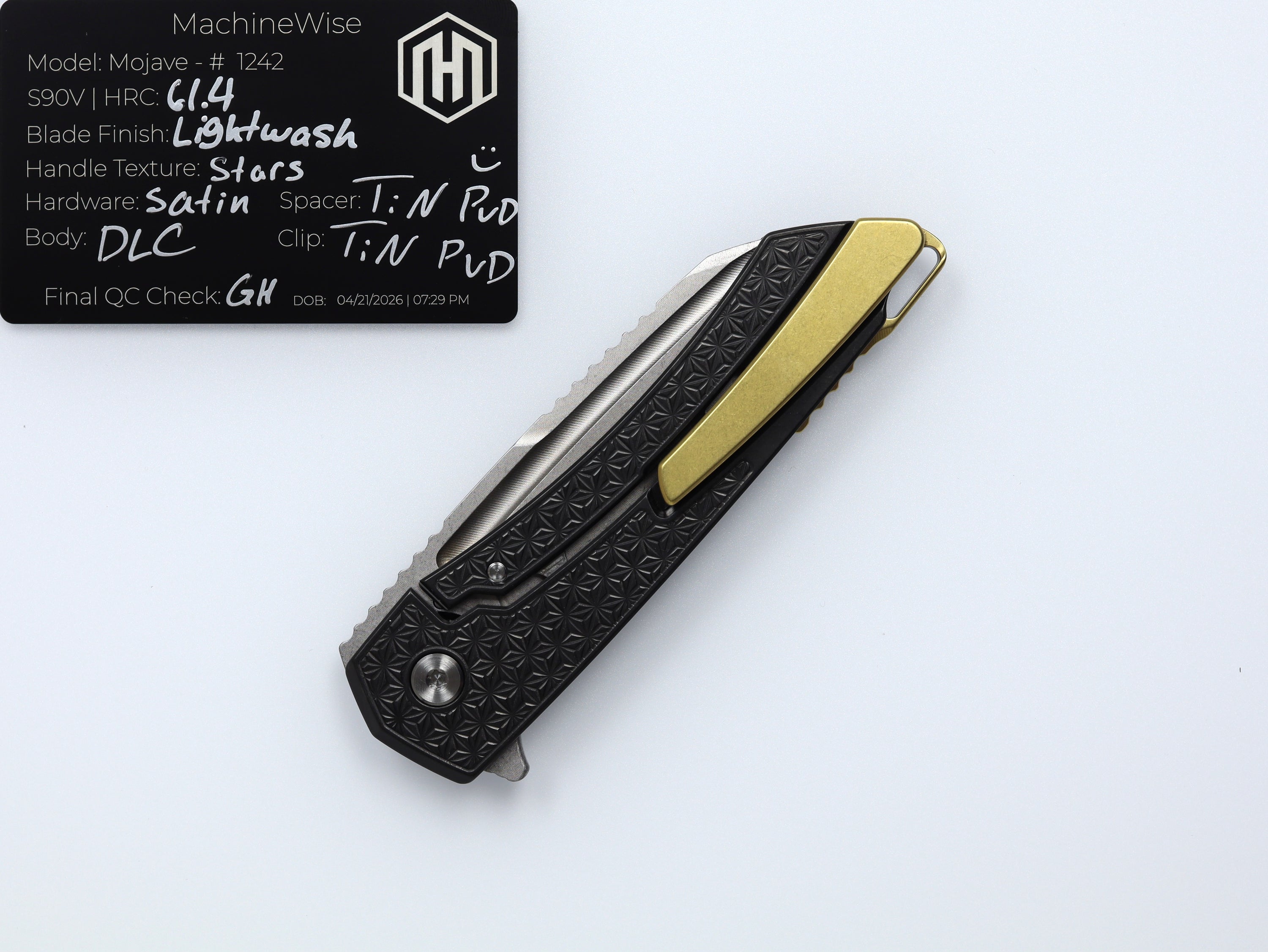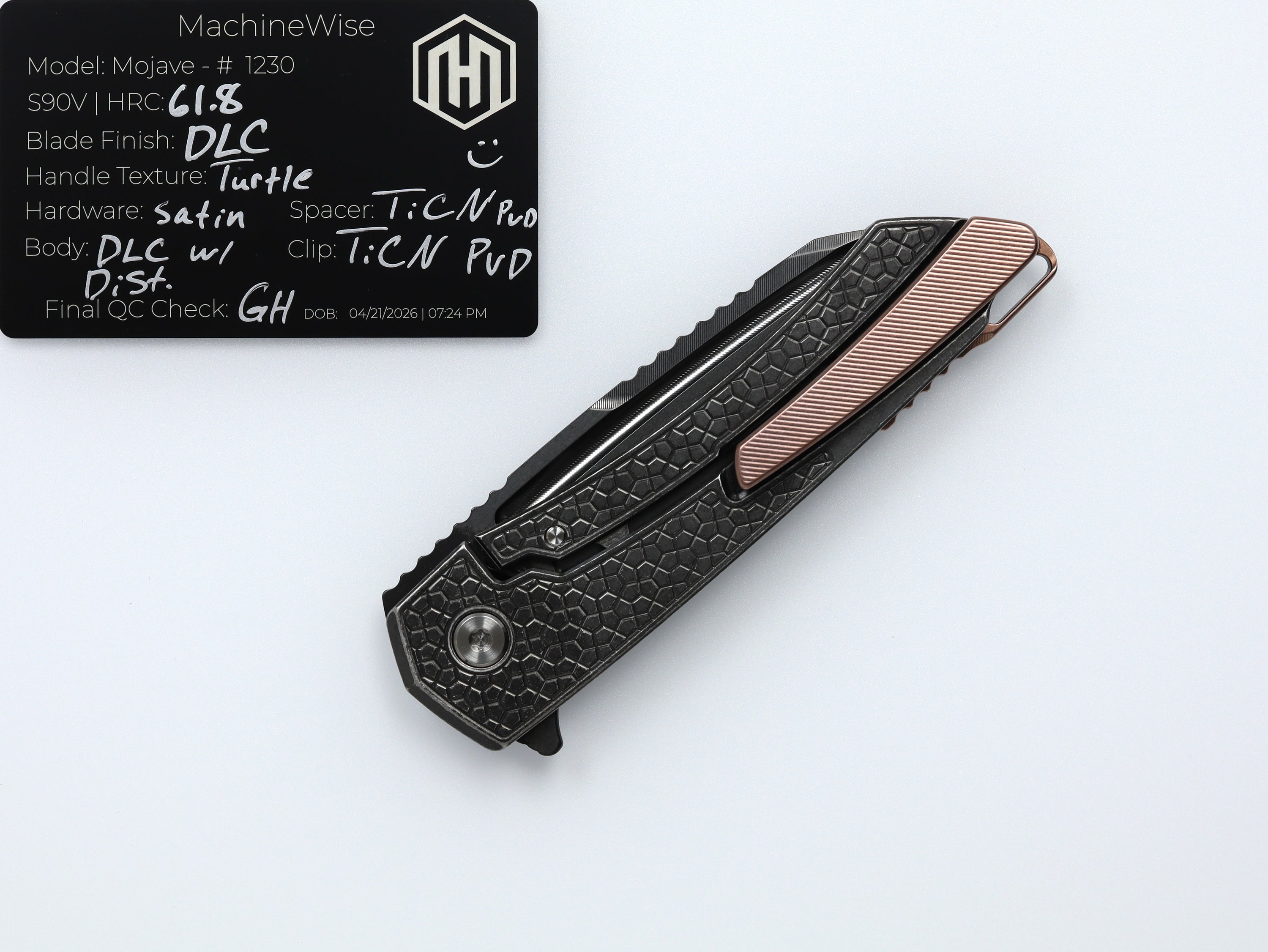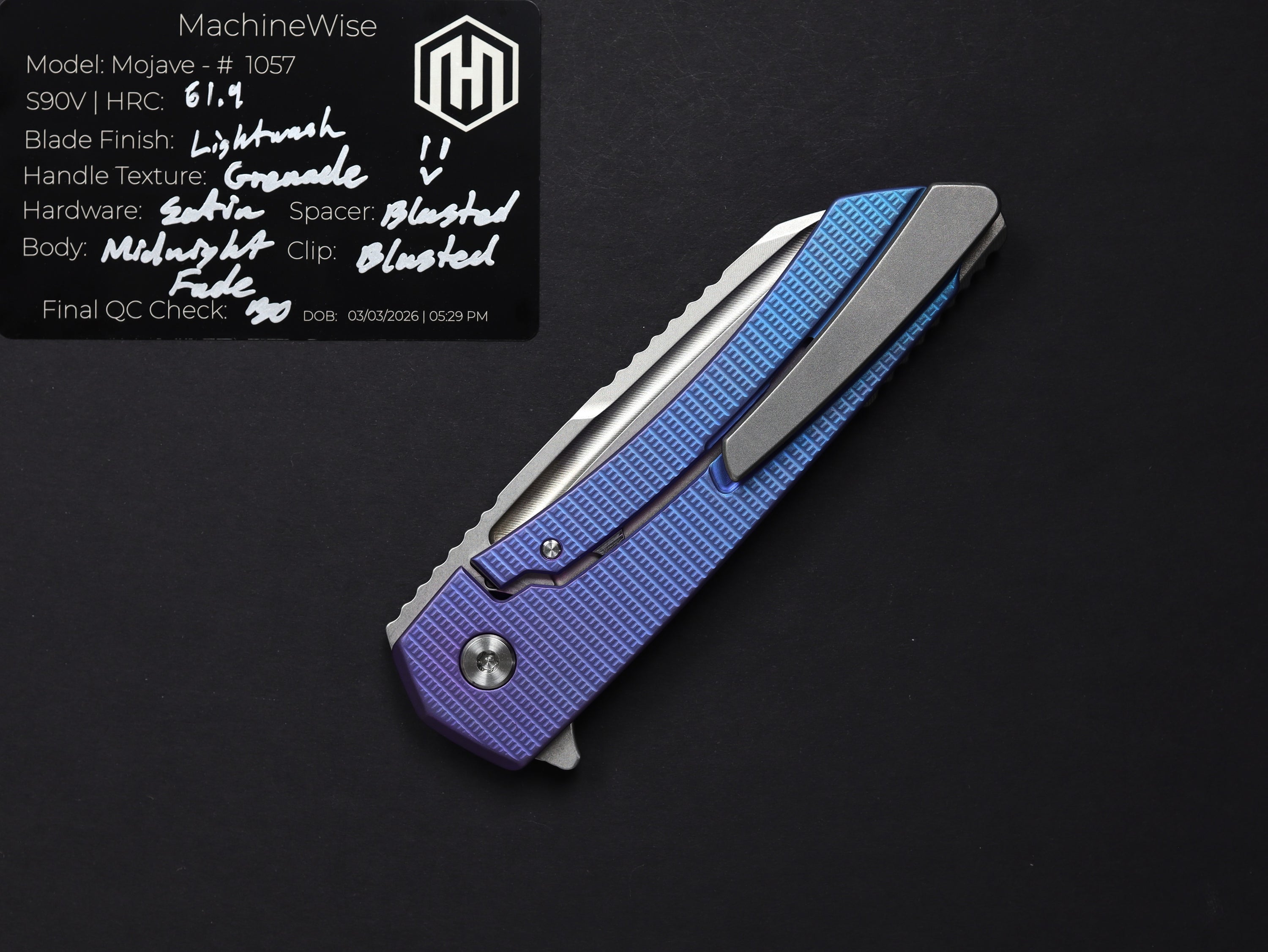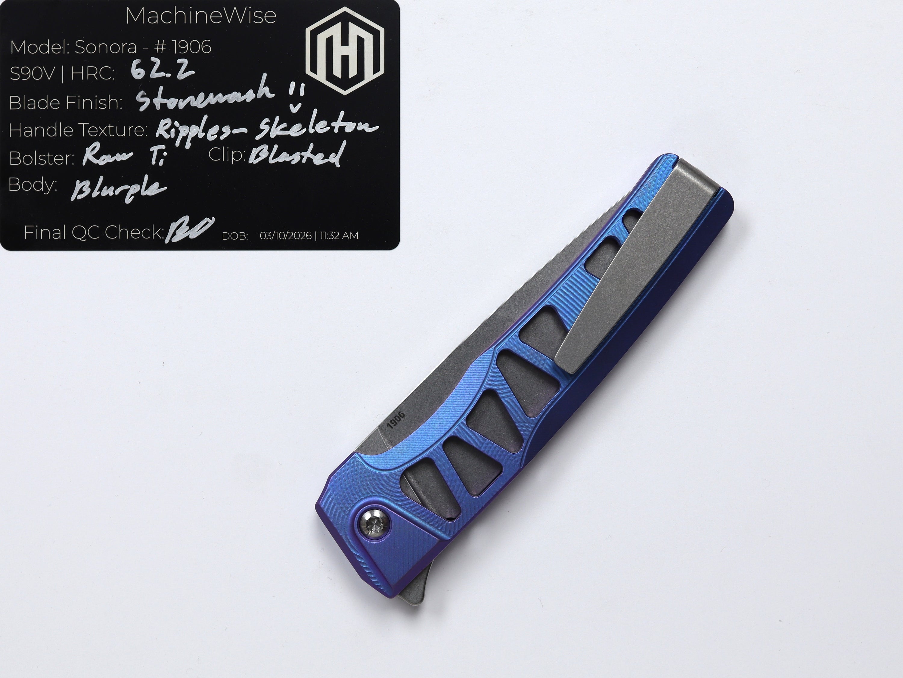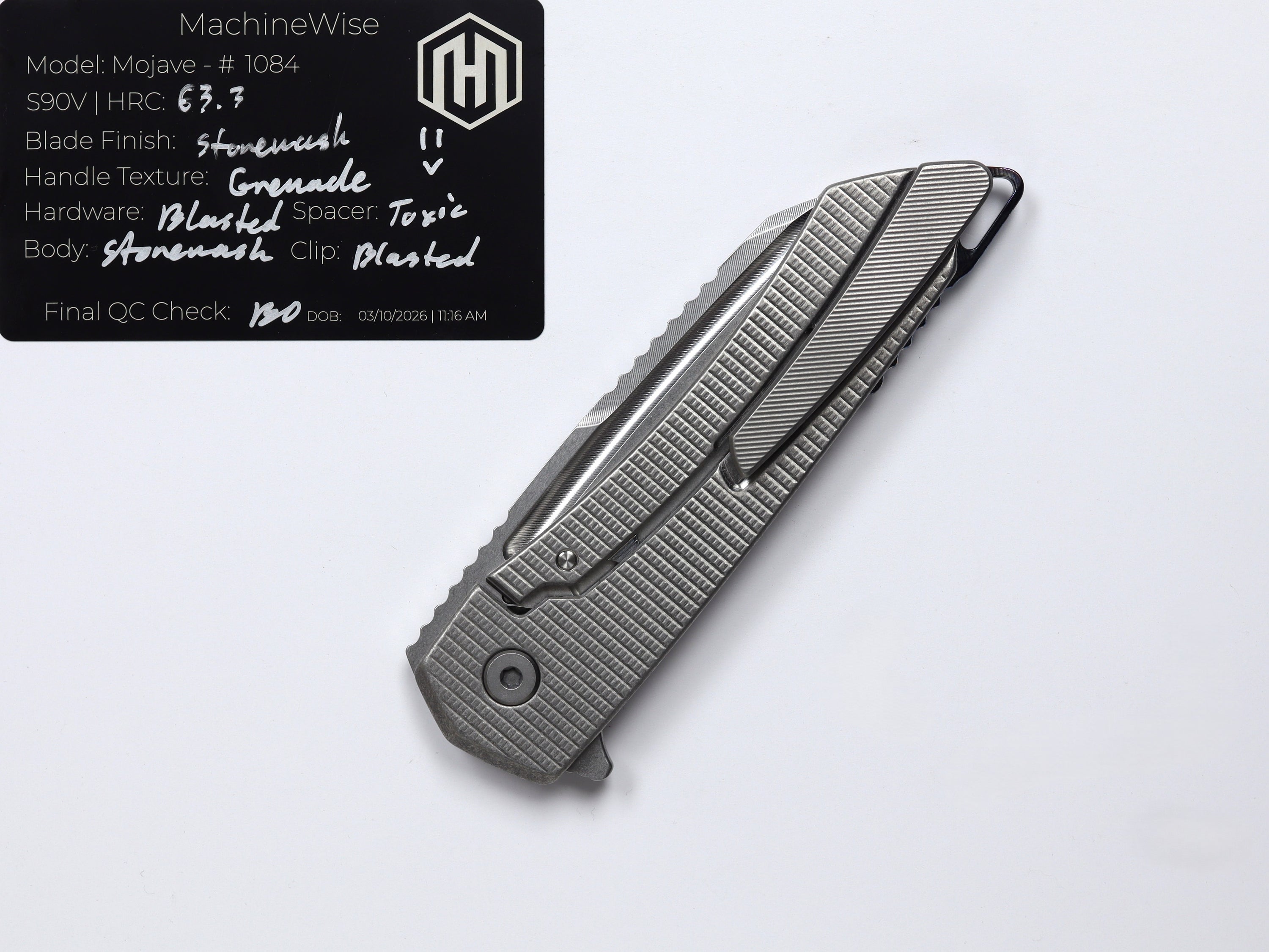 A button lock folder built in-house by the MachineWise team. Now available with DLC blades and skeletonized handles in the Custom Shop.