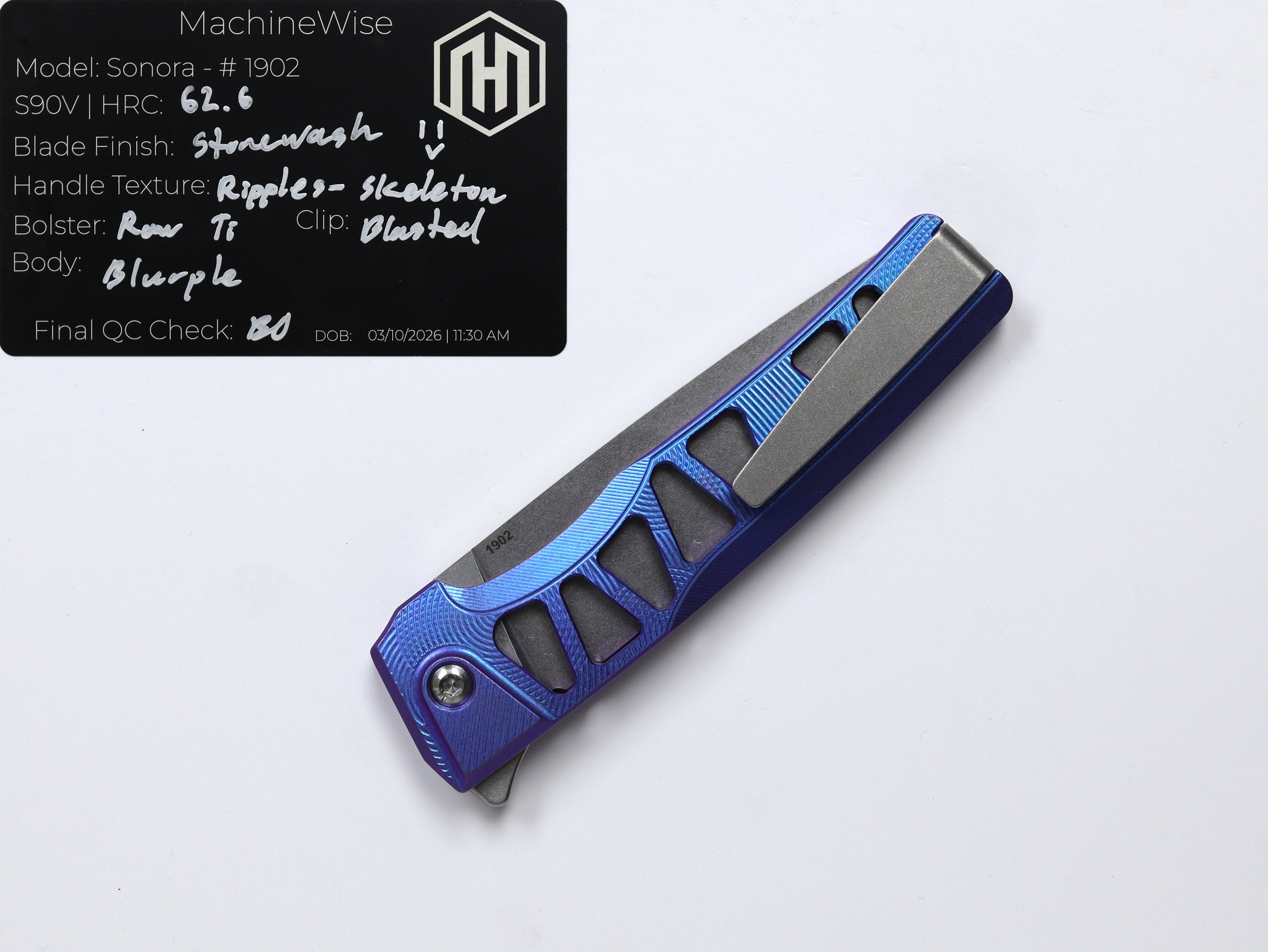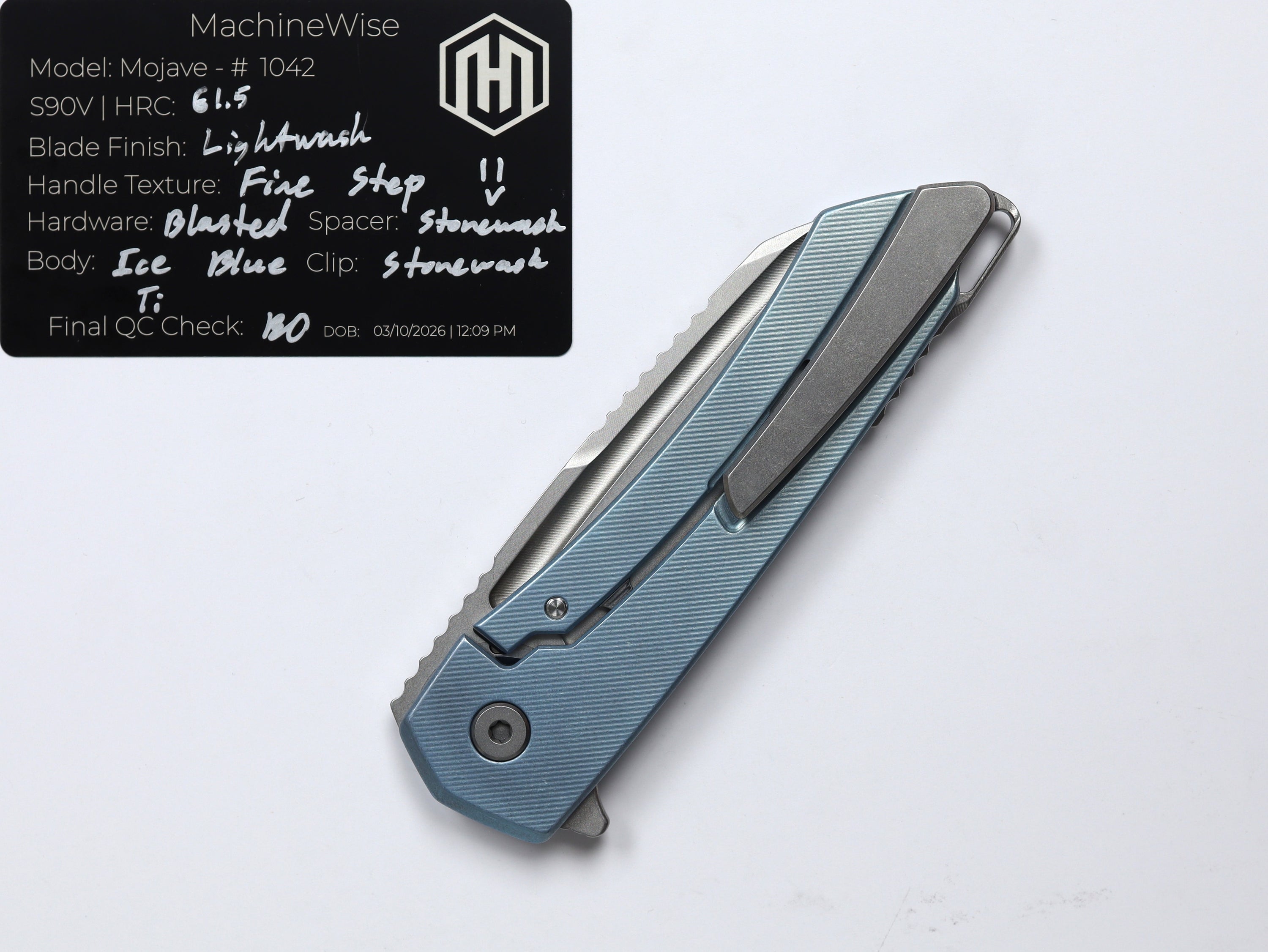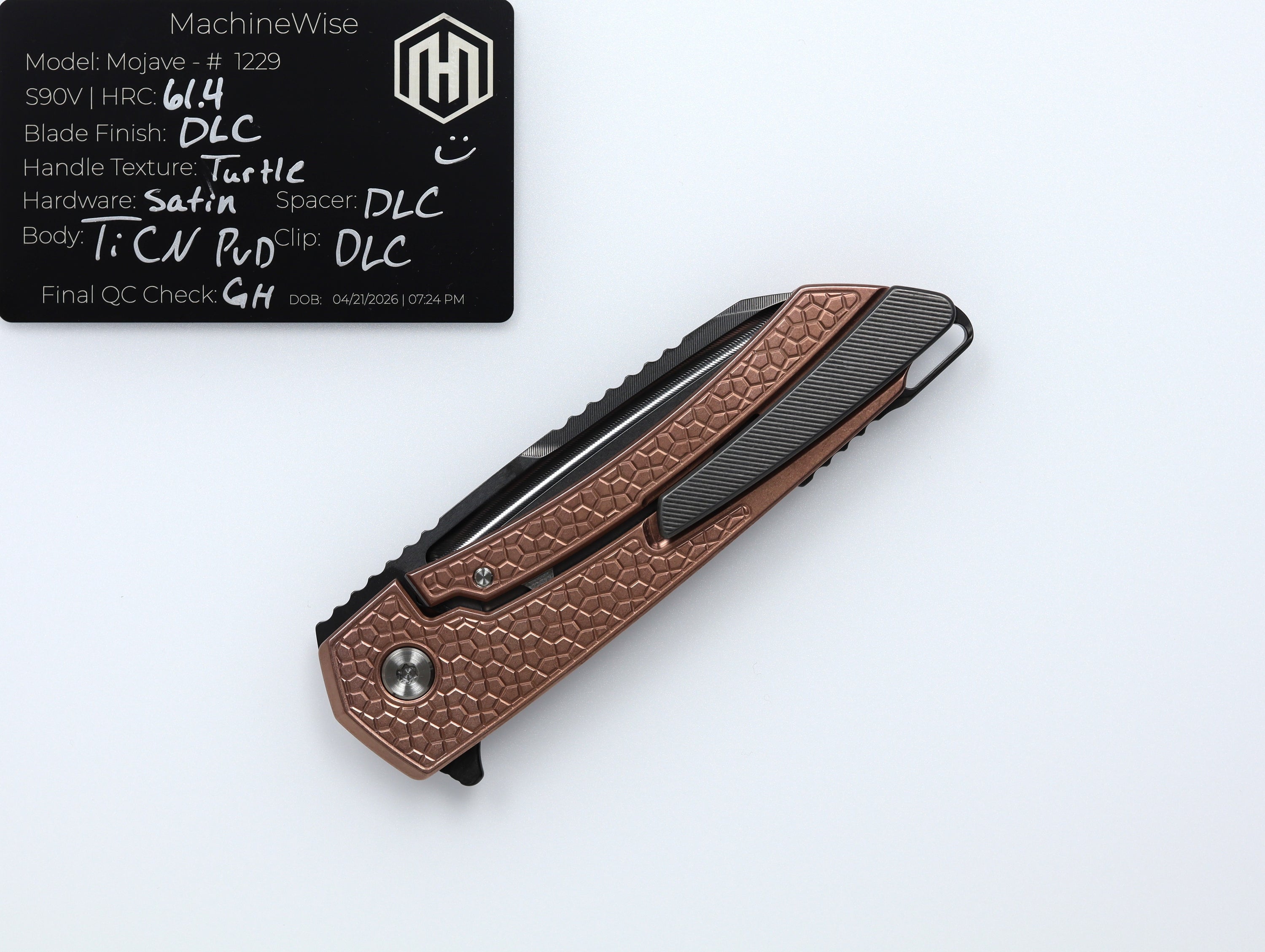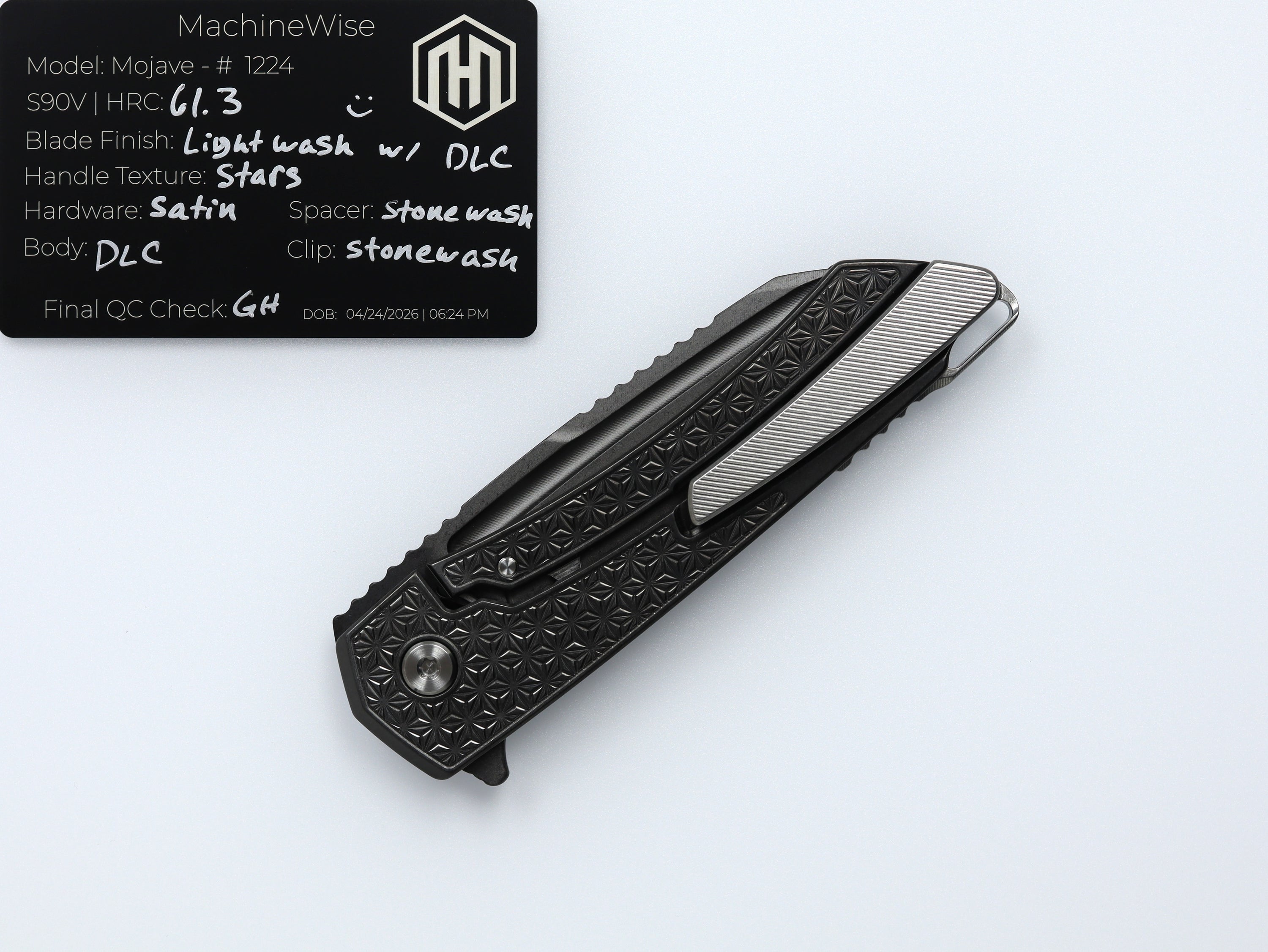 A button lock folder built in-house by the MachineWise team. Now available with DLC blades and skeletonized handles in the Custom Shop.