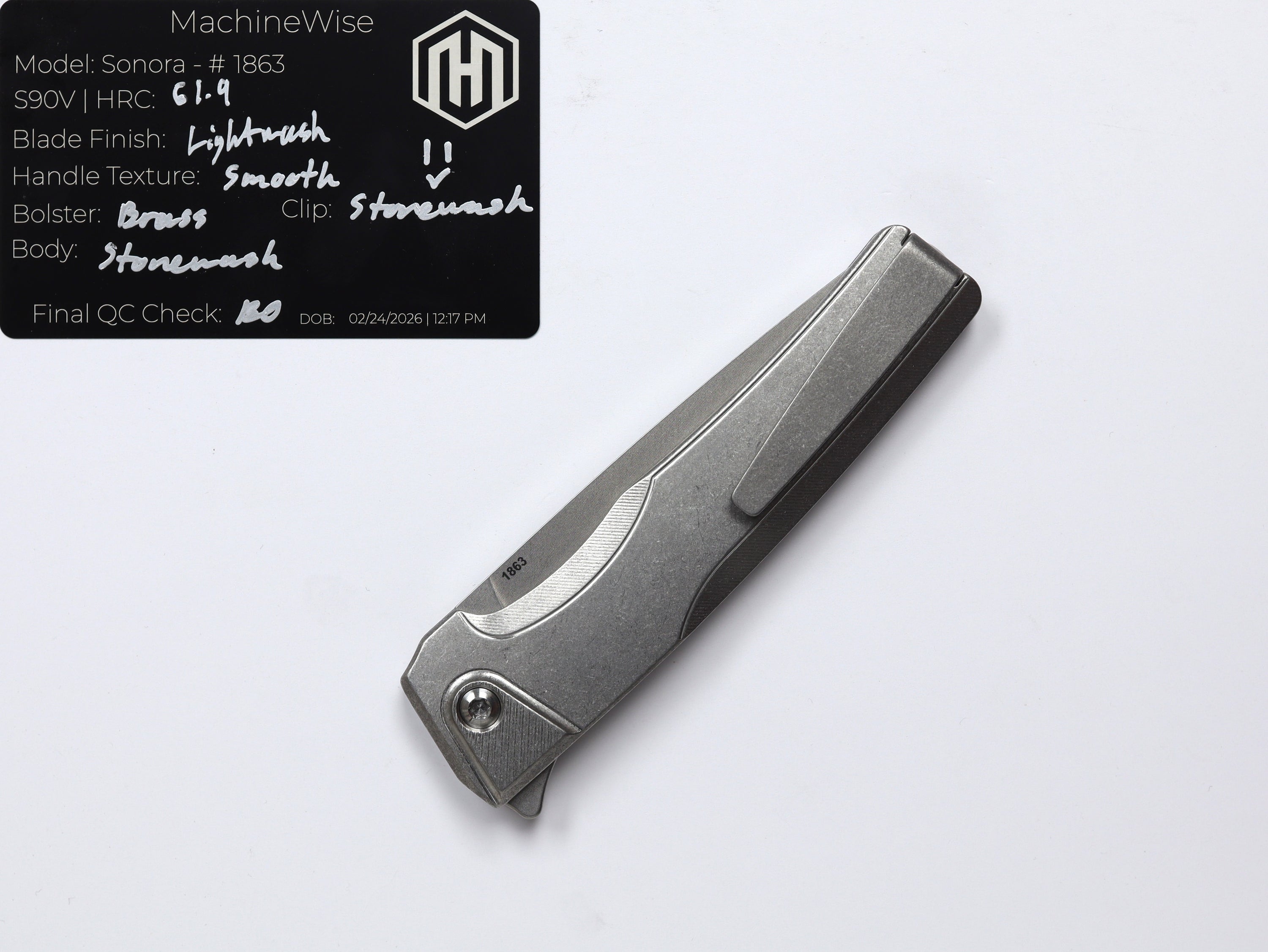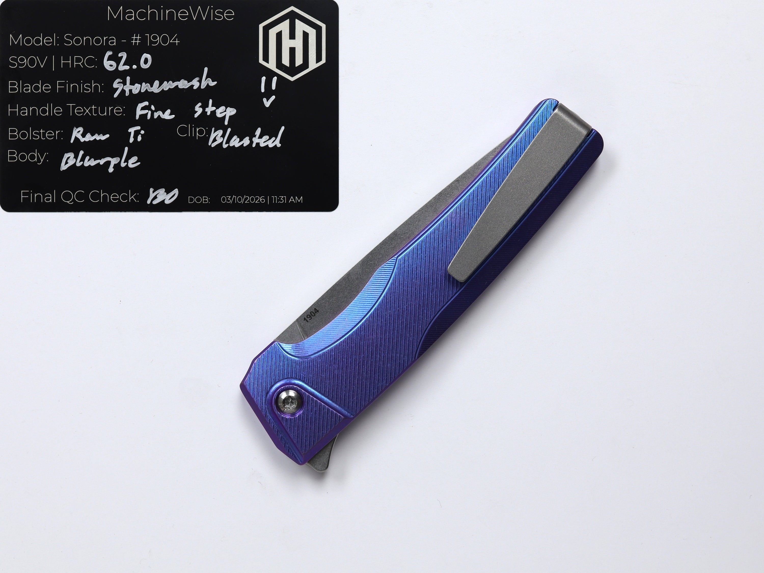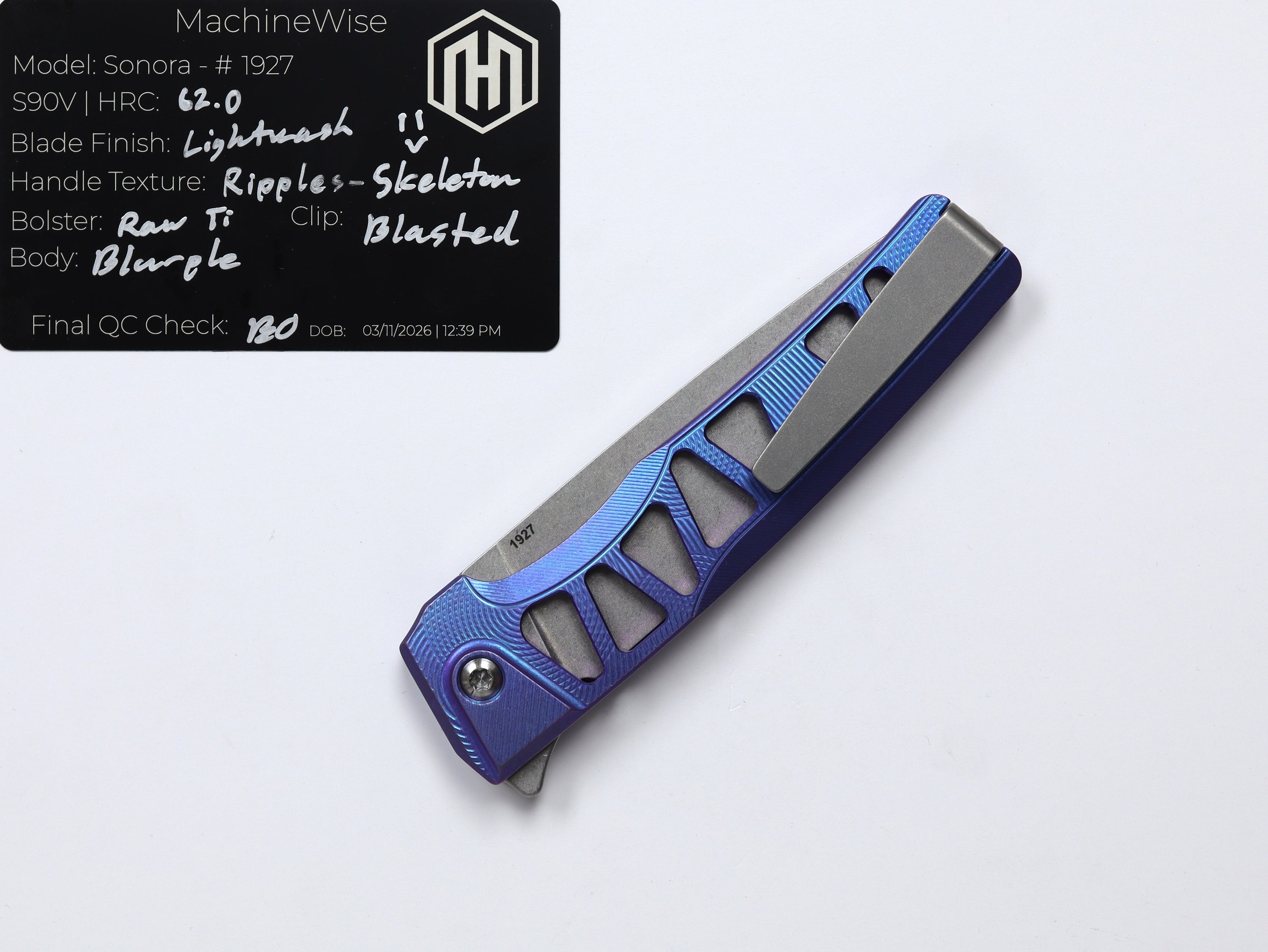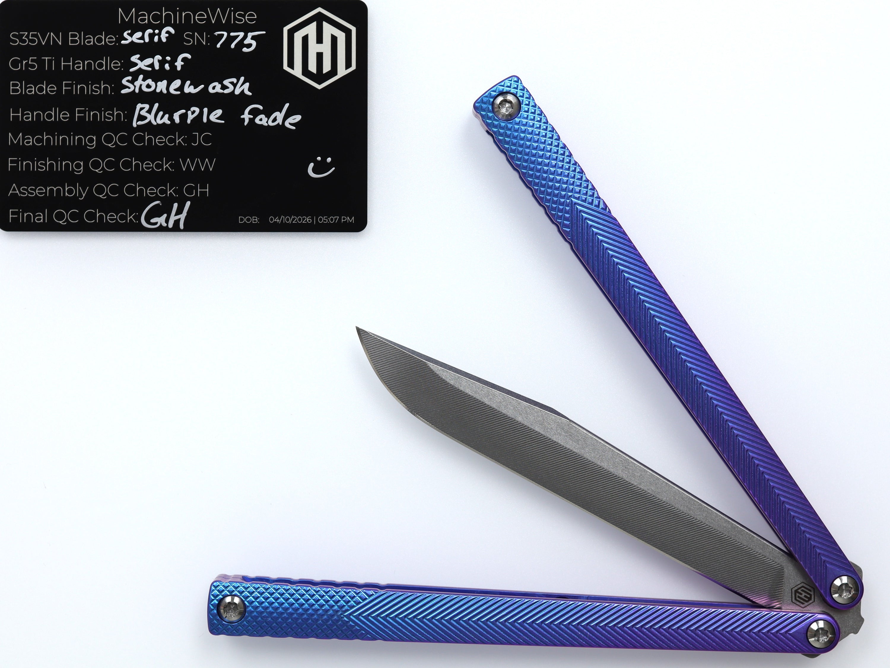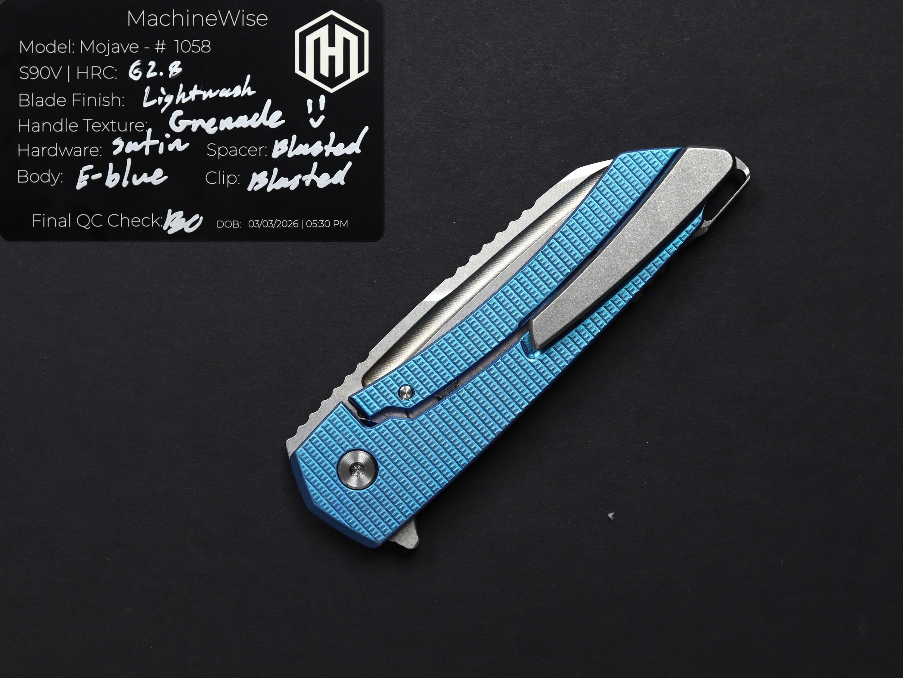 A button lock folder built in-house by the MachineWise team. Now available with DLC blades and skeletonized handles in the Custom Shop.