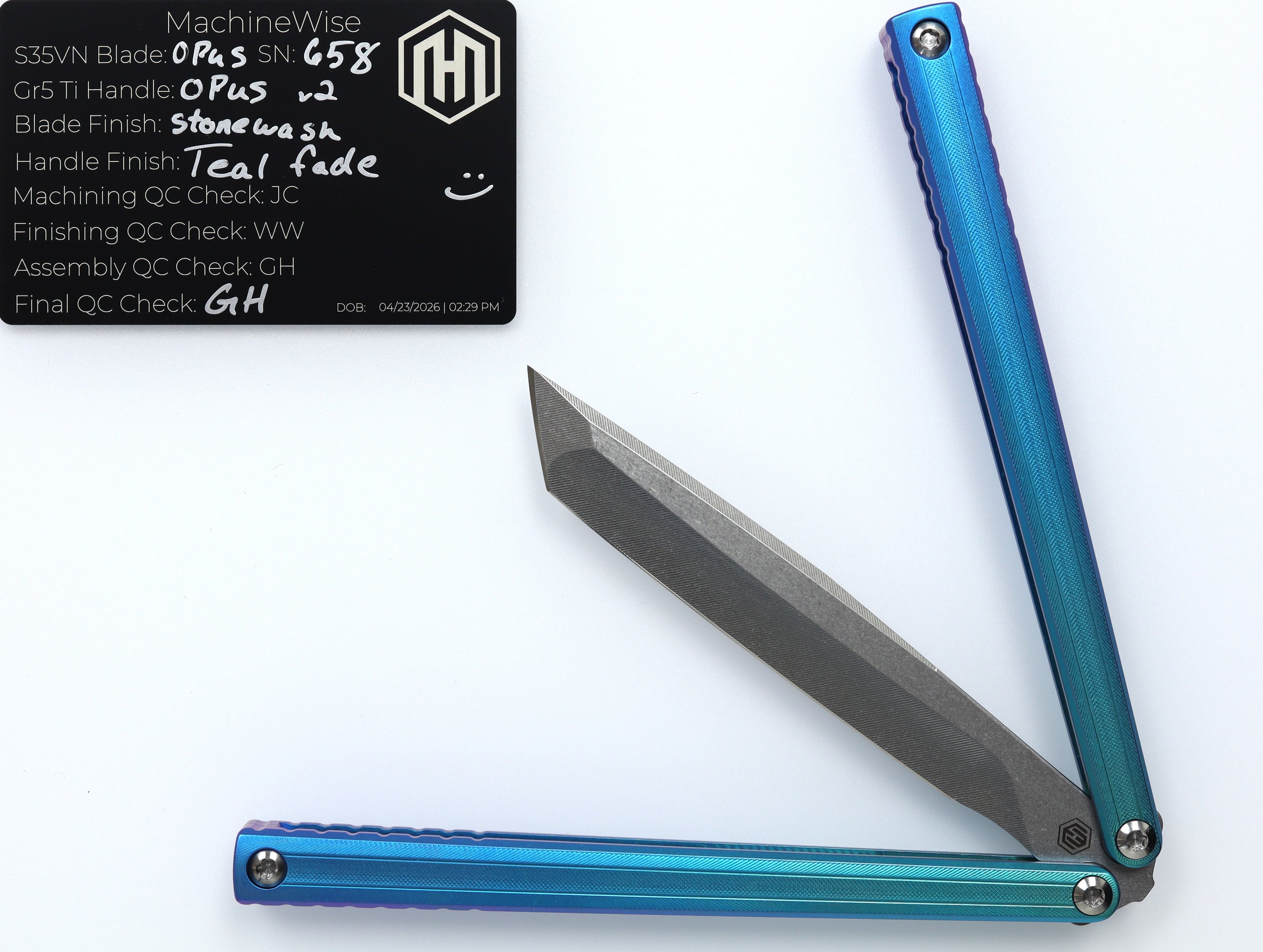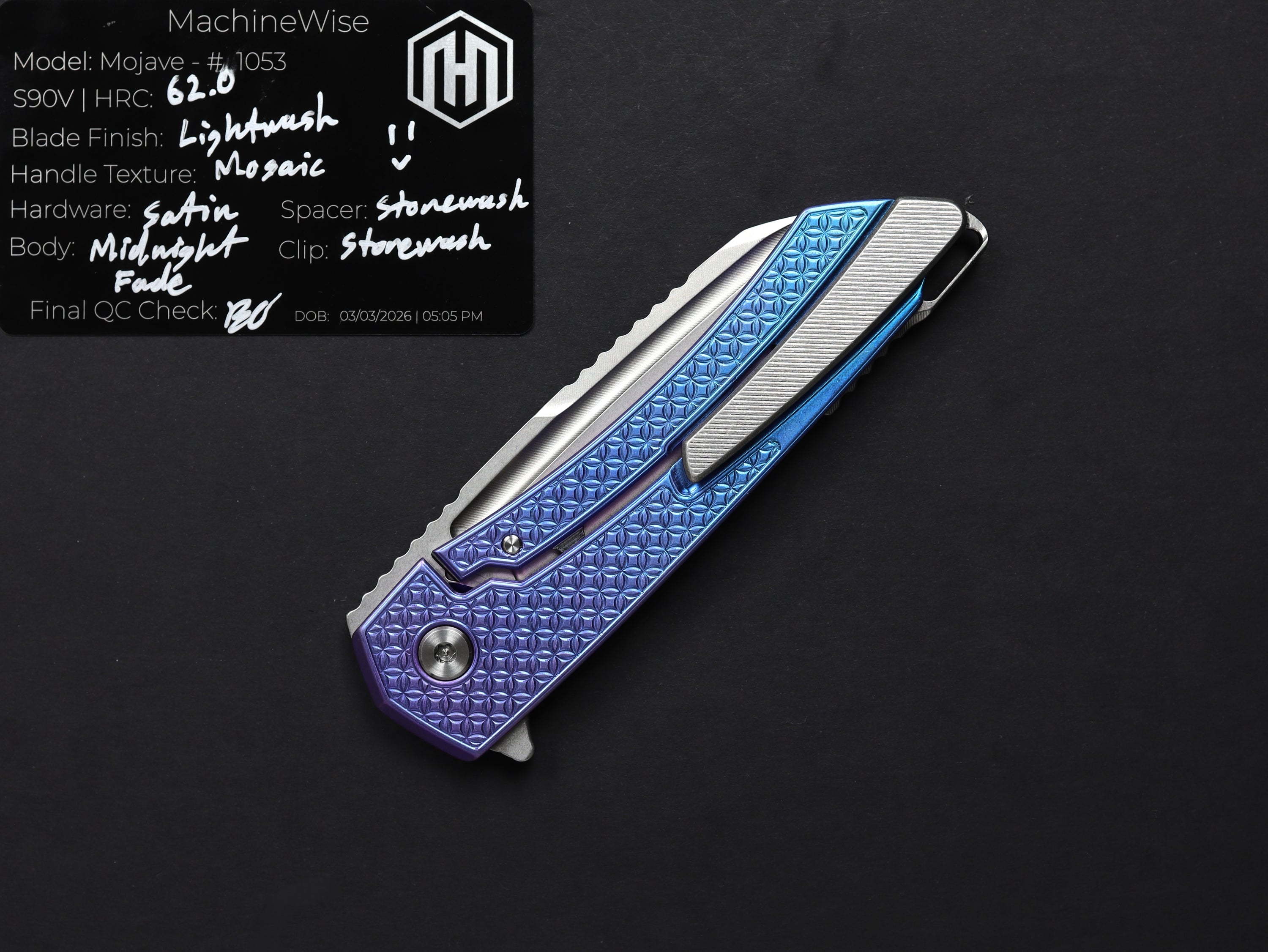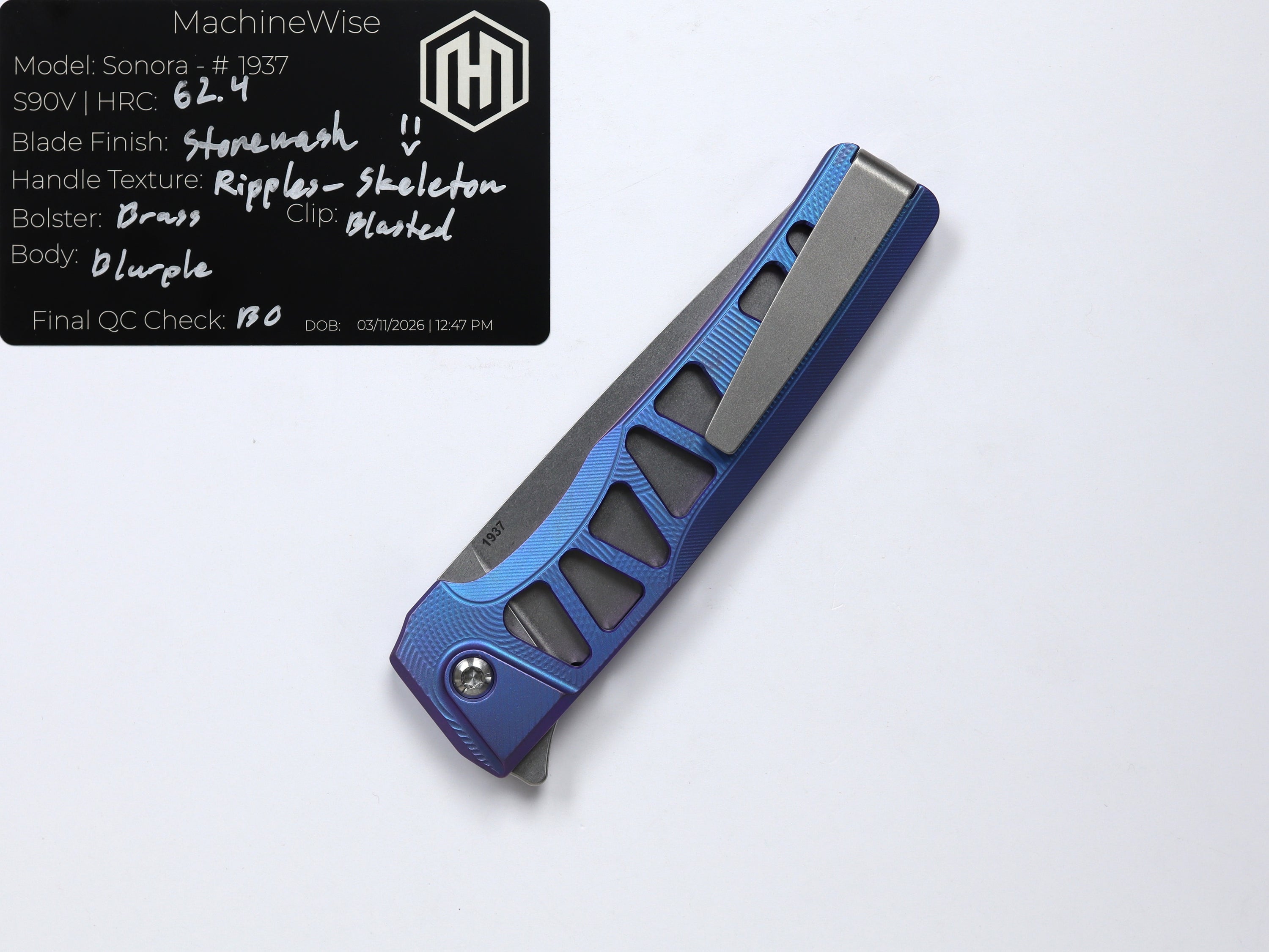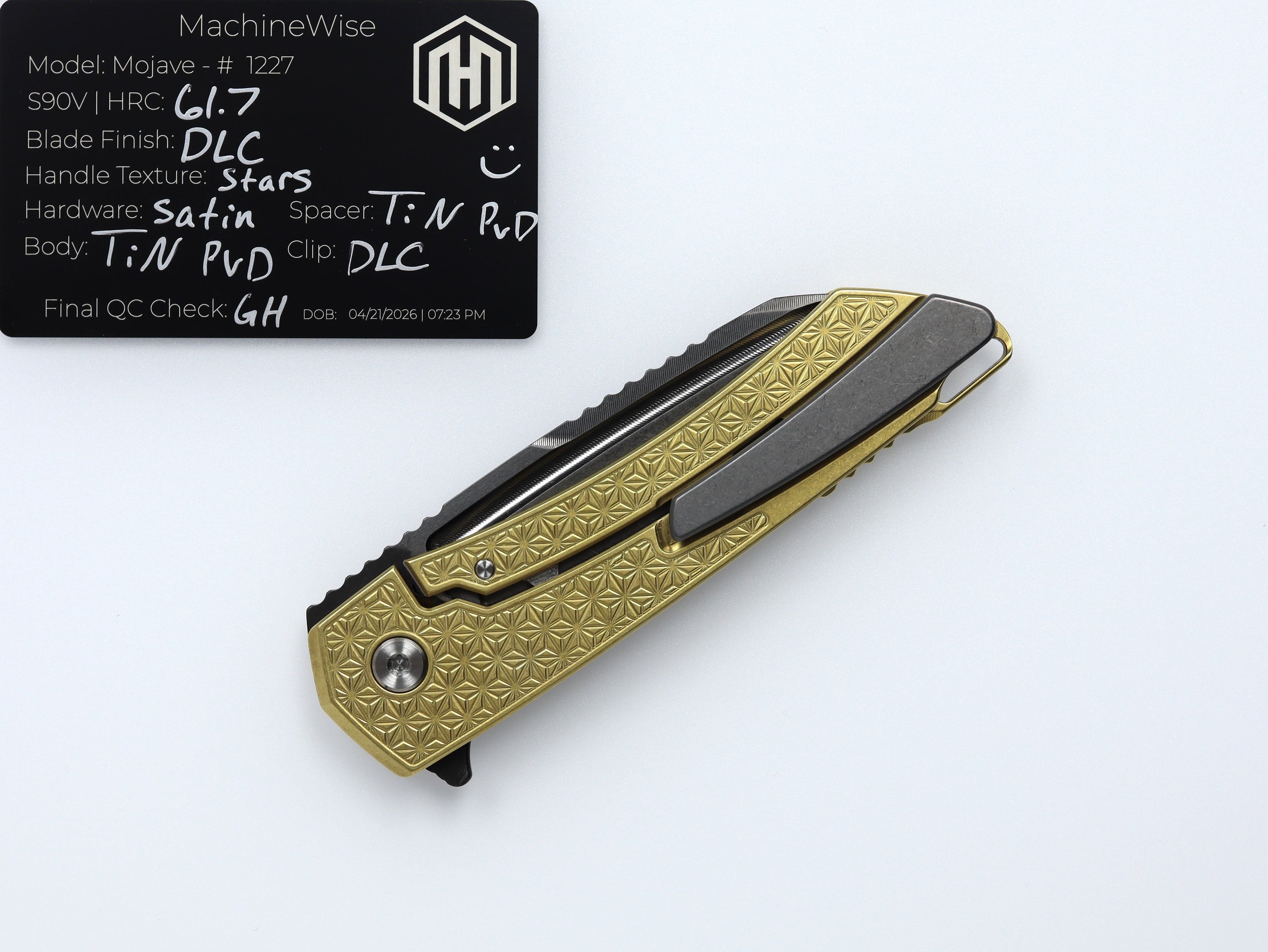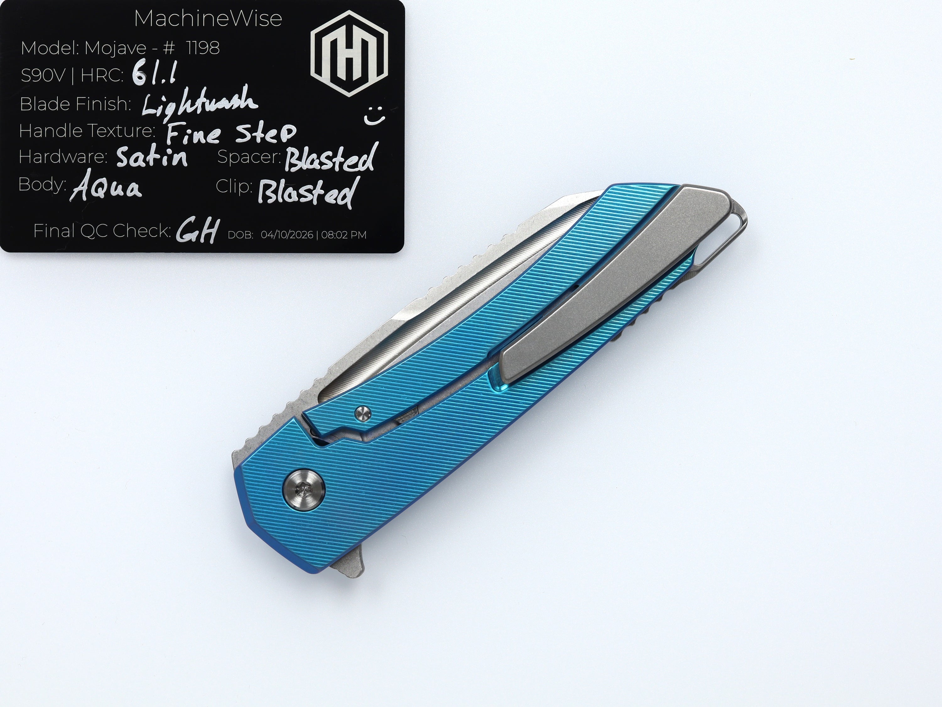 A button lock folder built in-house by the MachineWise team. Now available with DLC blades and skeletonized handles in the Custom Shop.