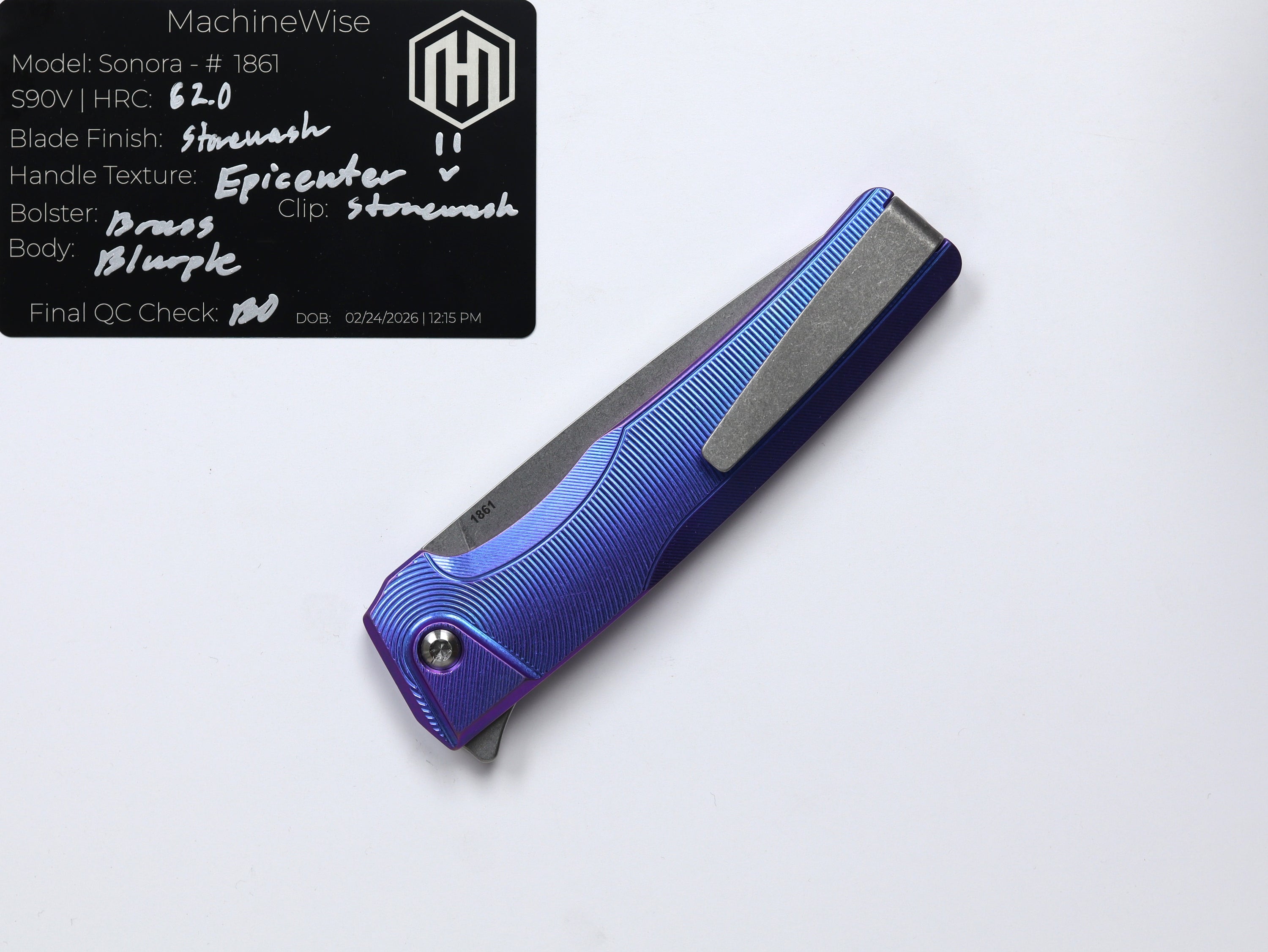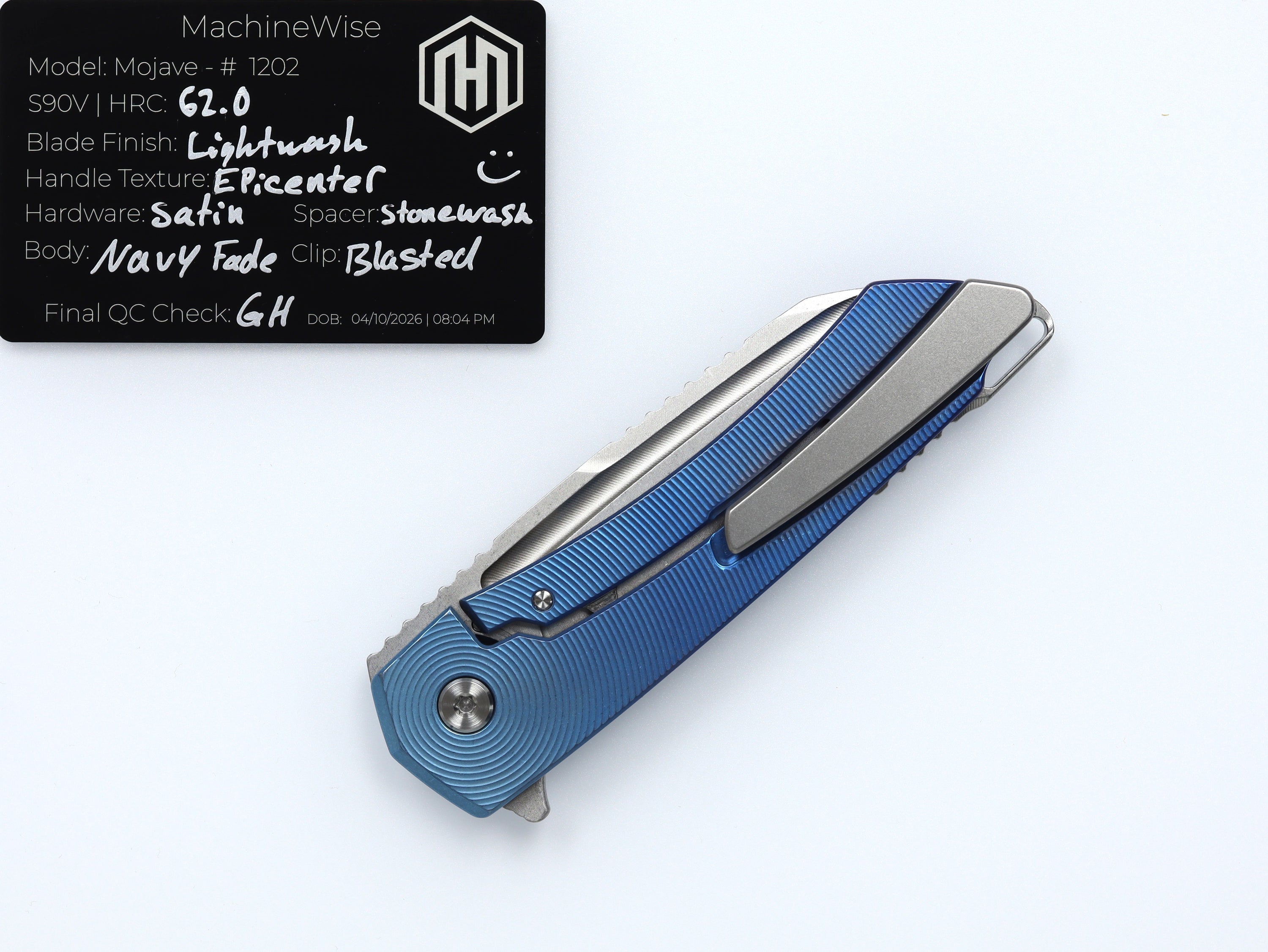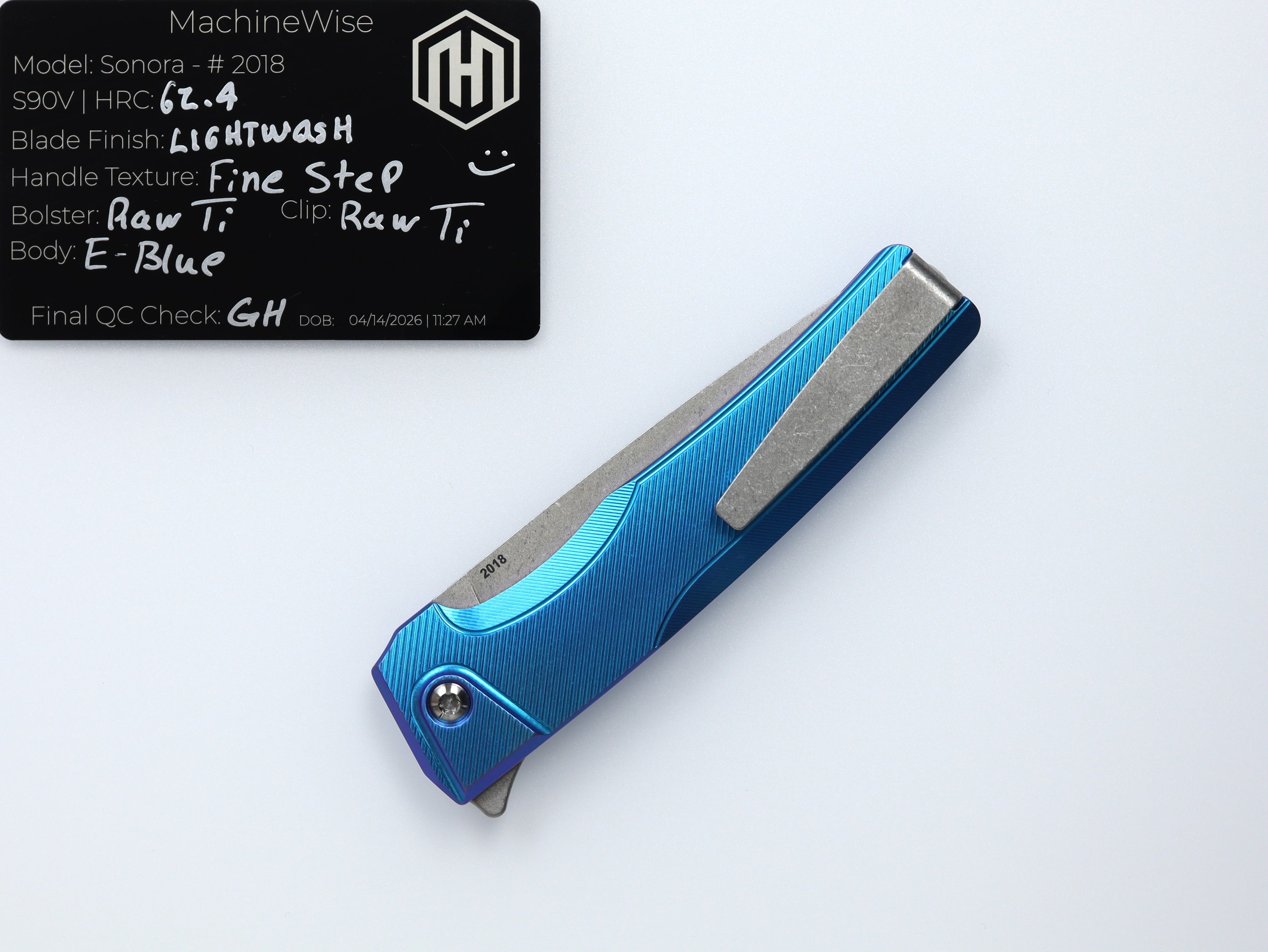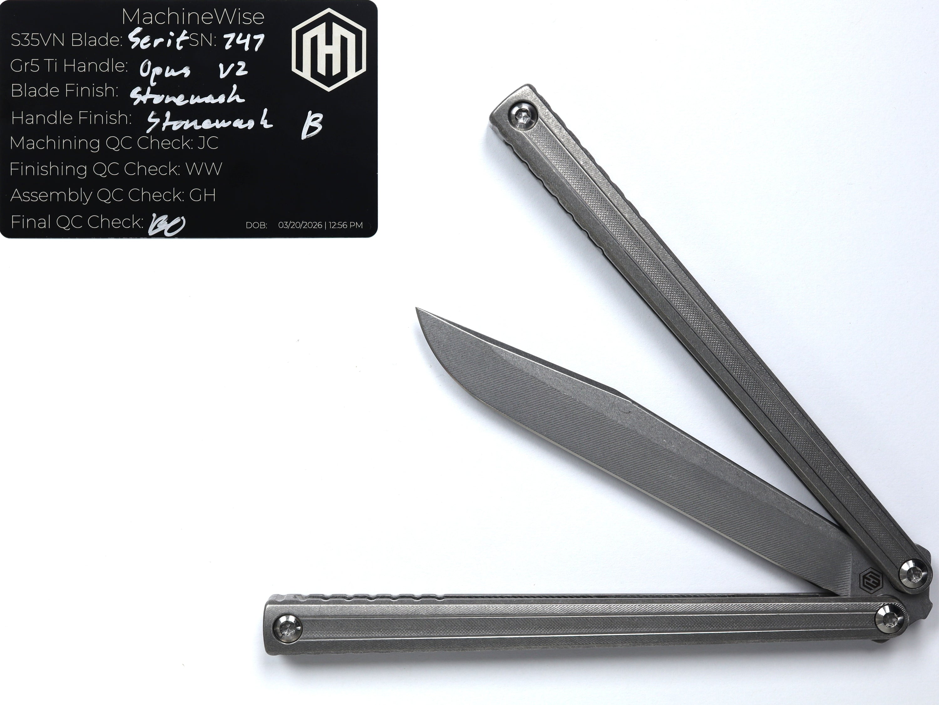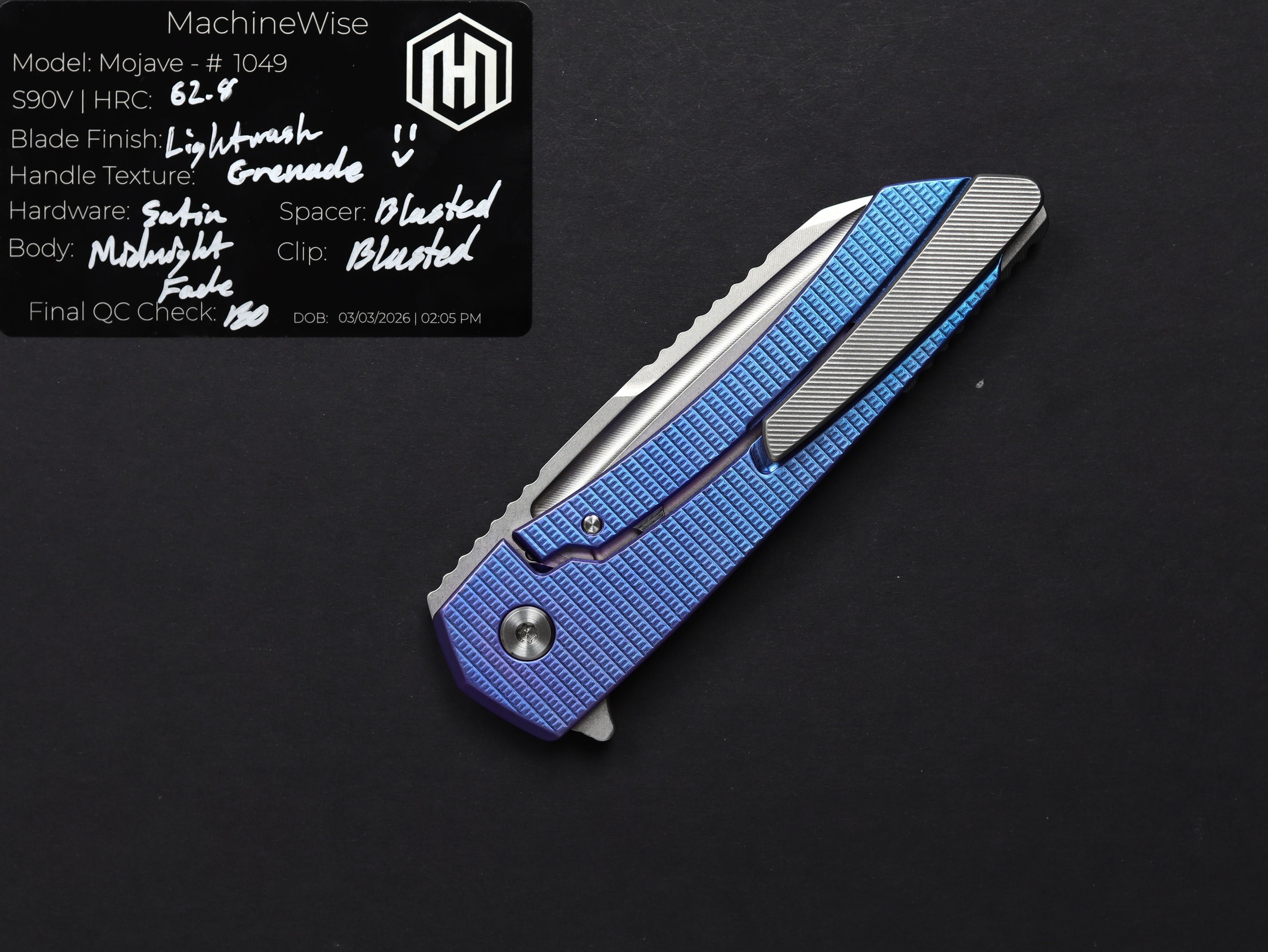 A button lock folder built in-house by the MachineWise team. Now available with DLC blades and skeletonized handles in the Custom Shop.