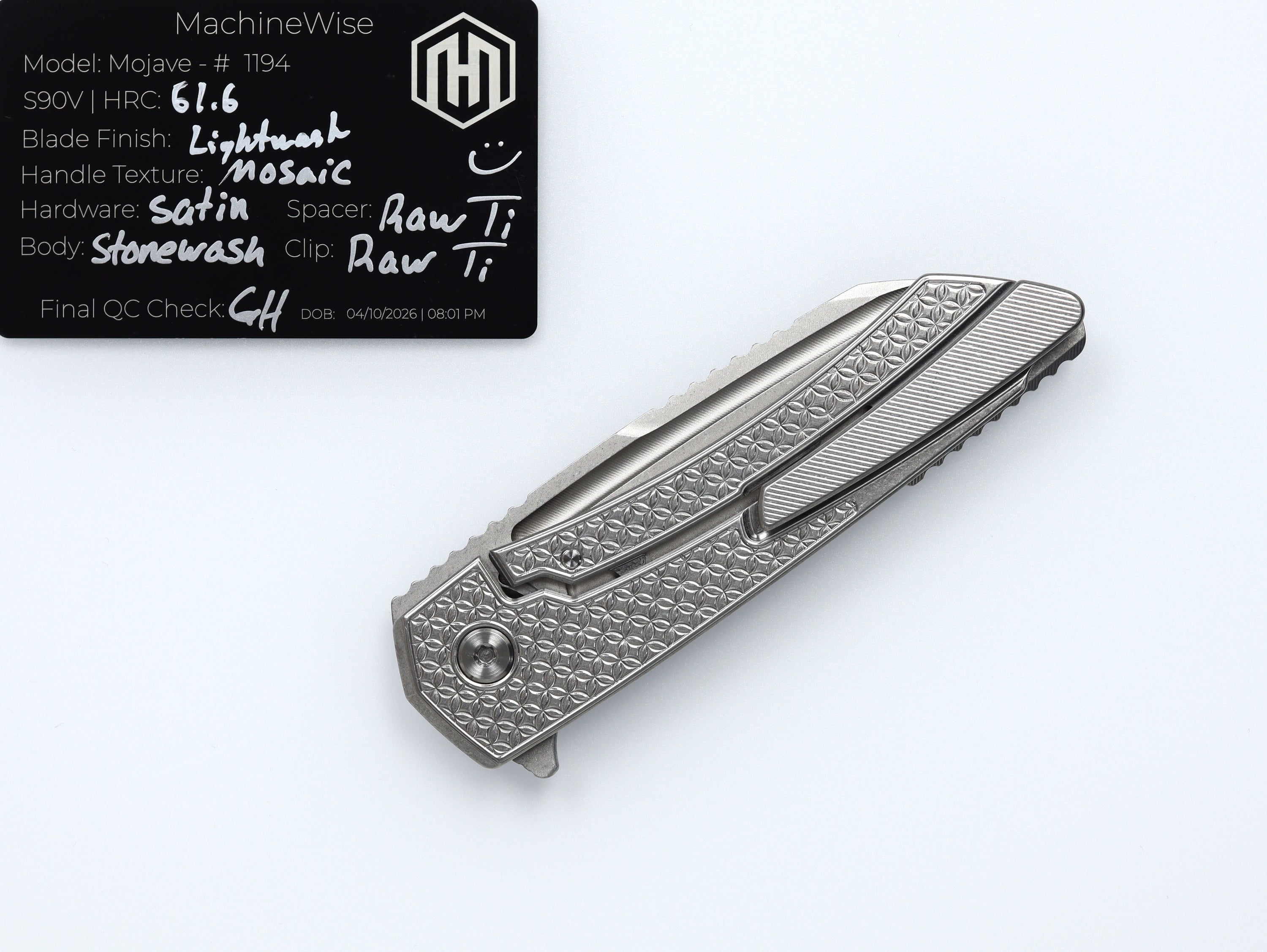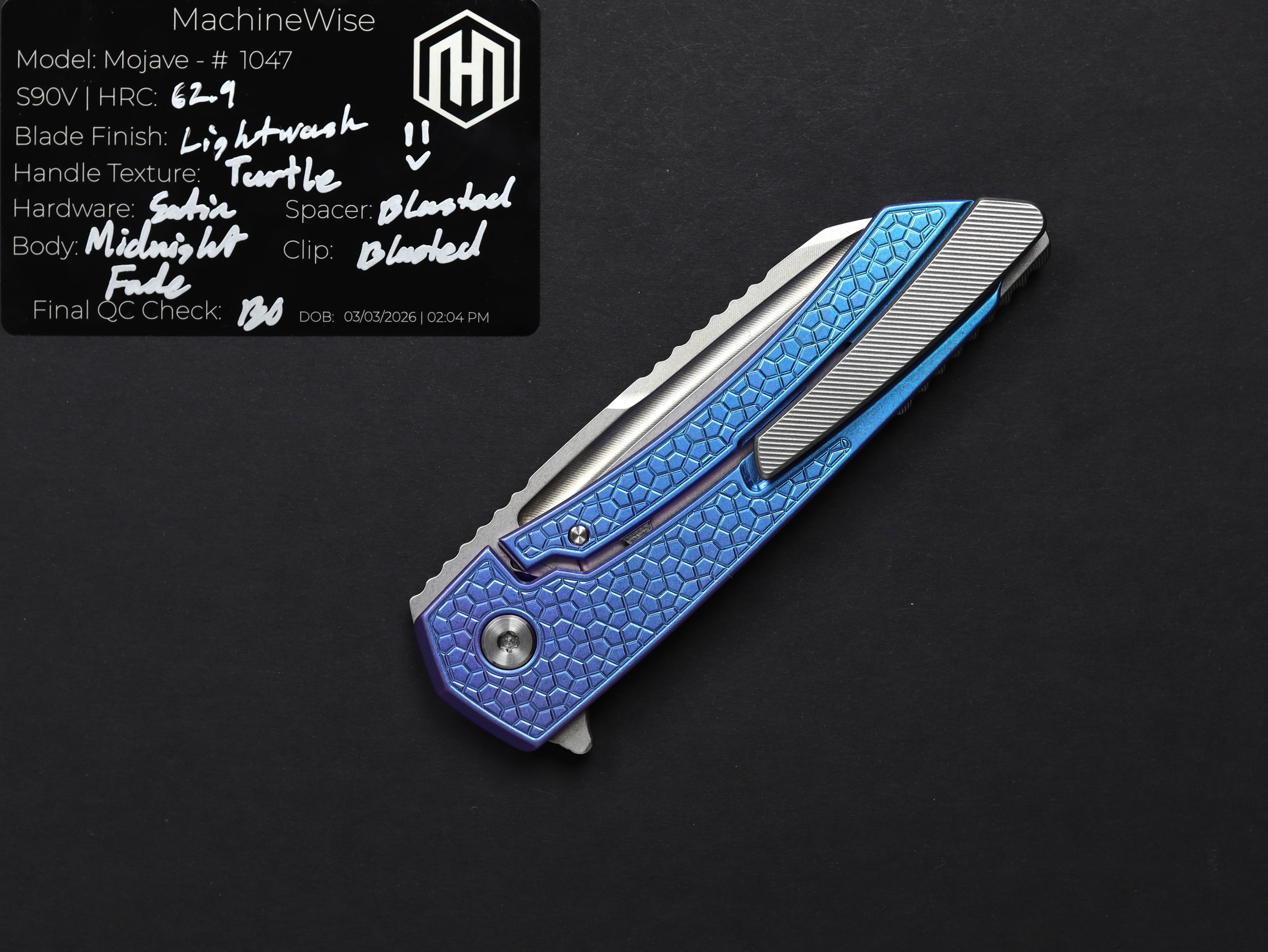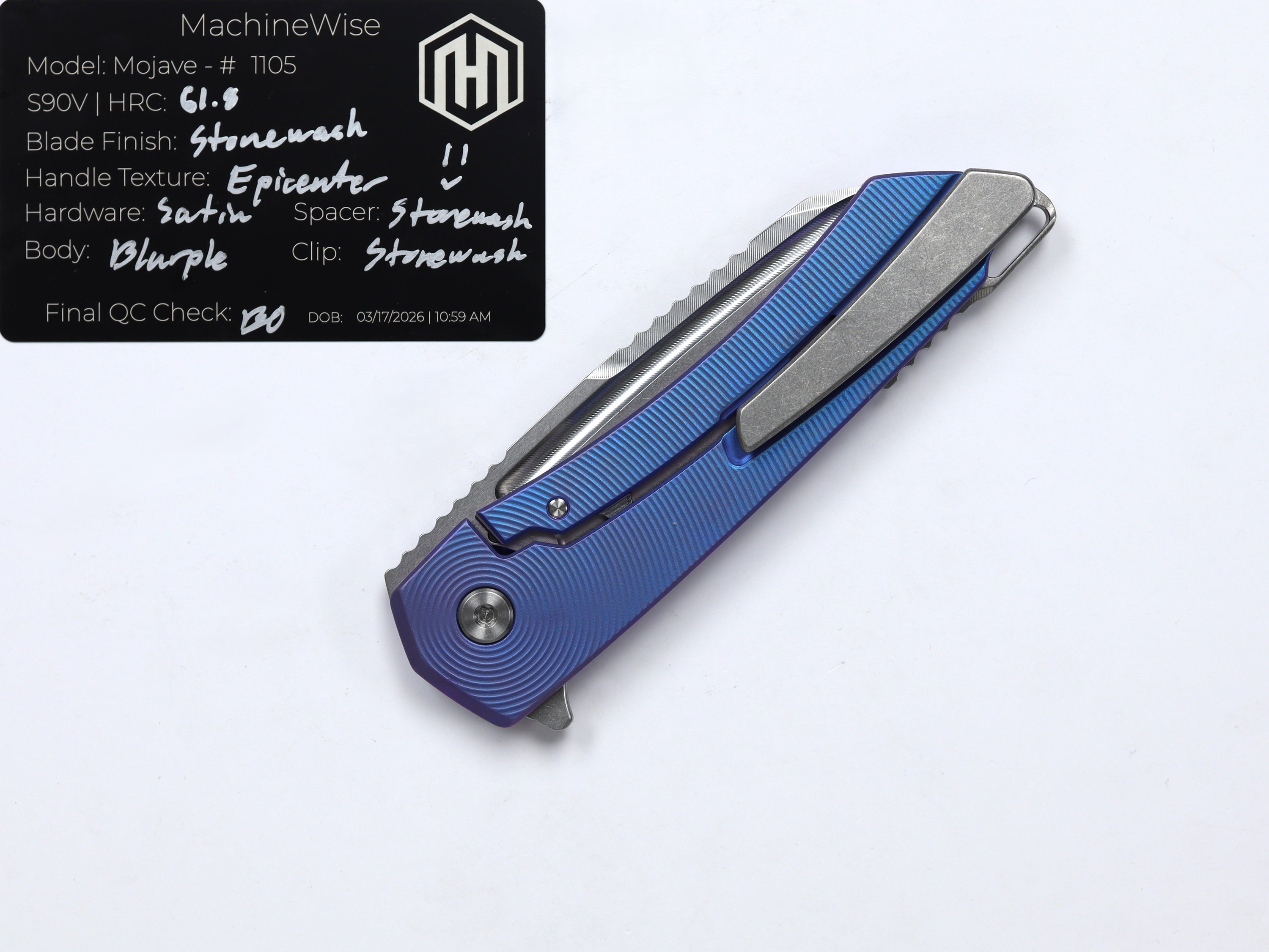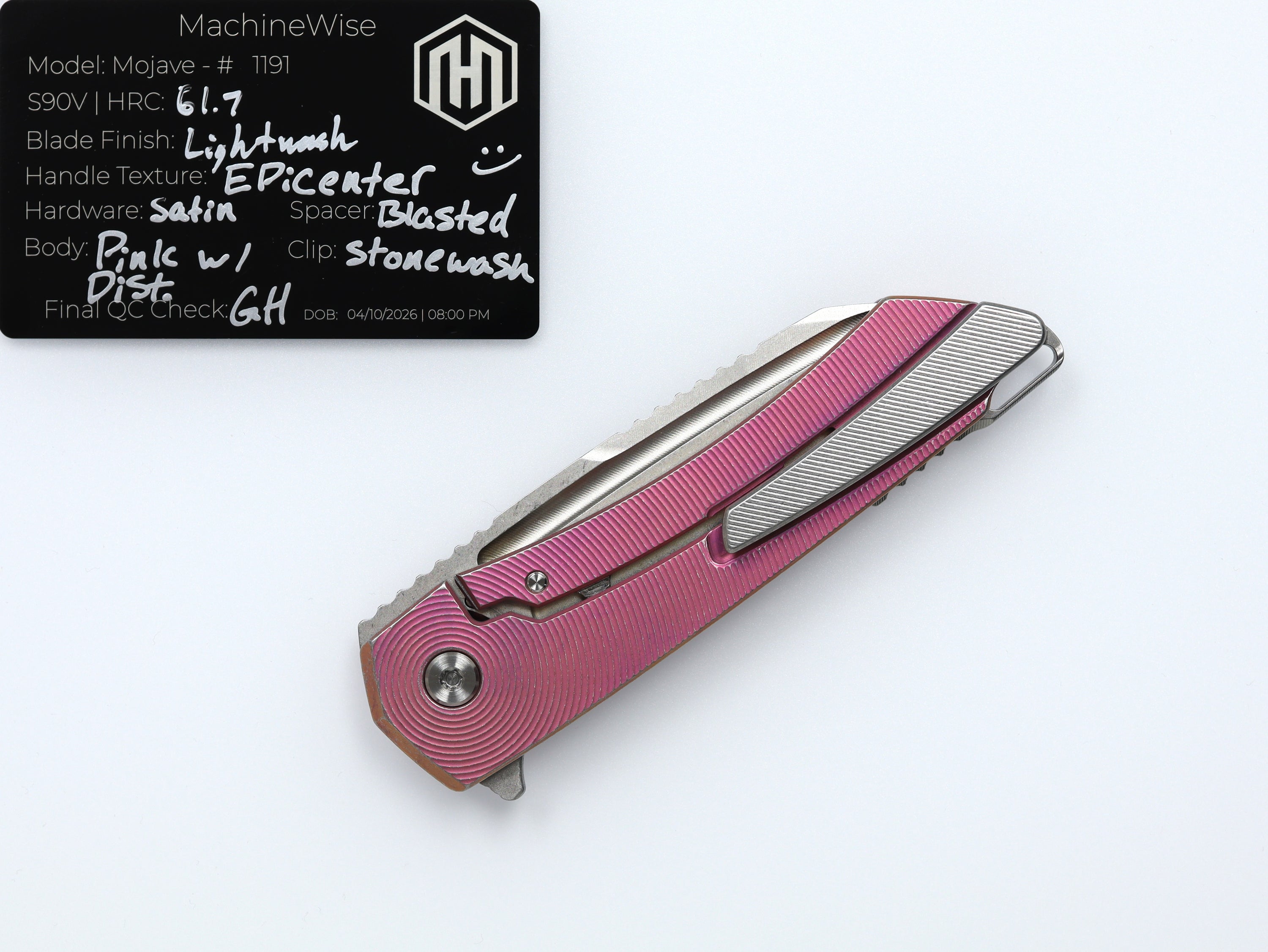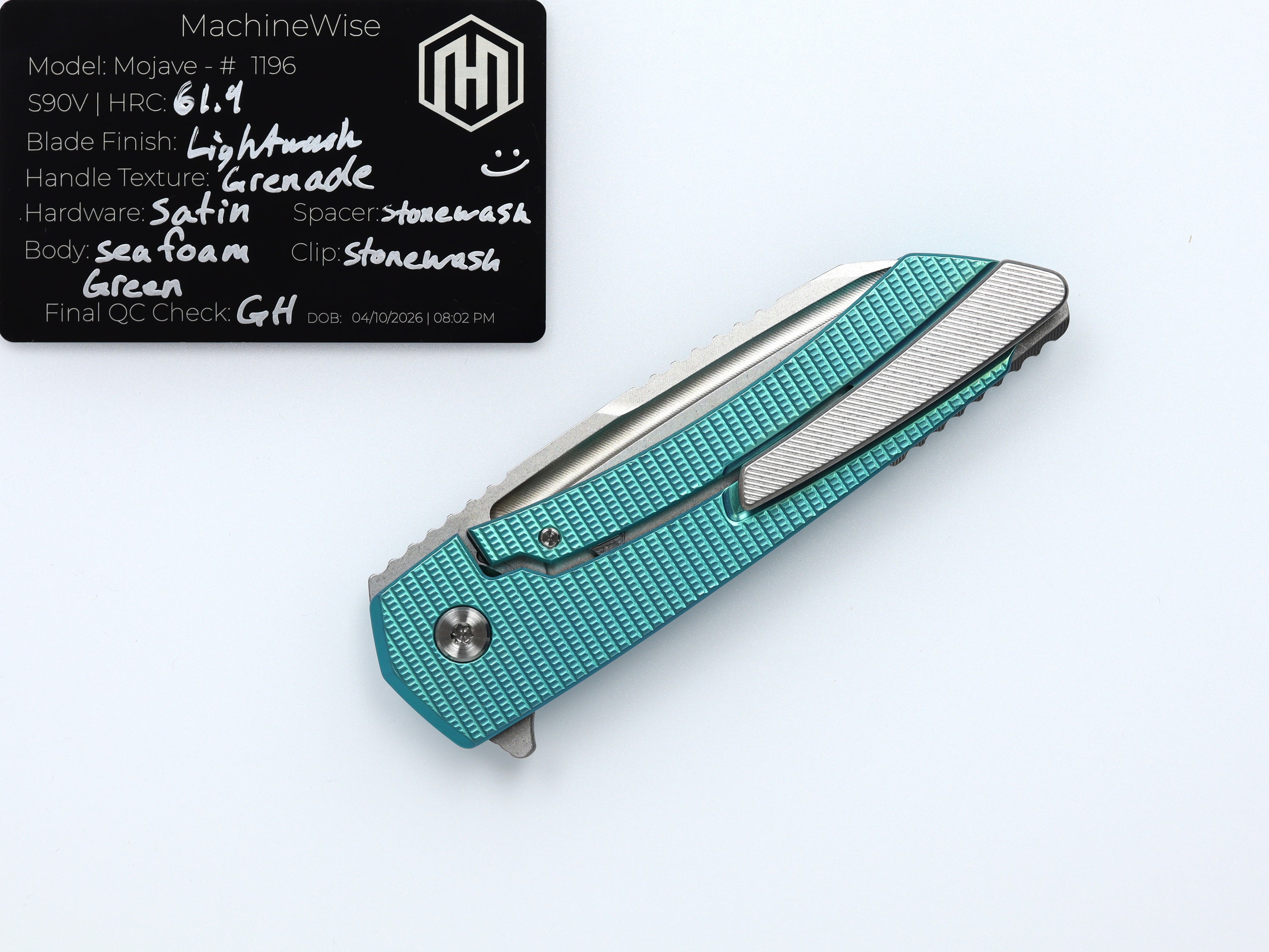 A button lock folder built in-house by the MachineWise team. Now available with DLC blades and skeletonized handles in the Custom Shop.