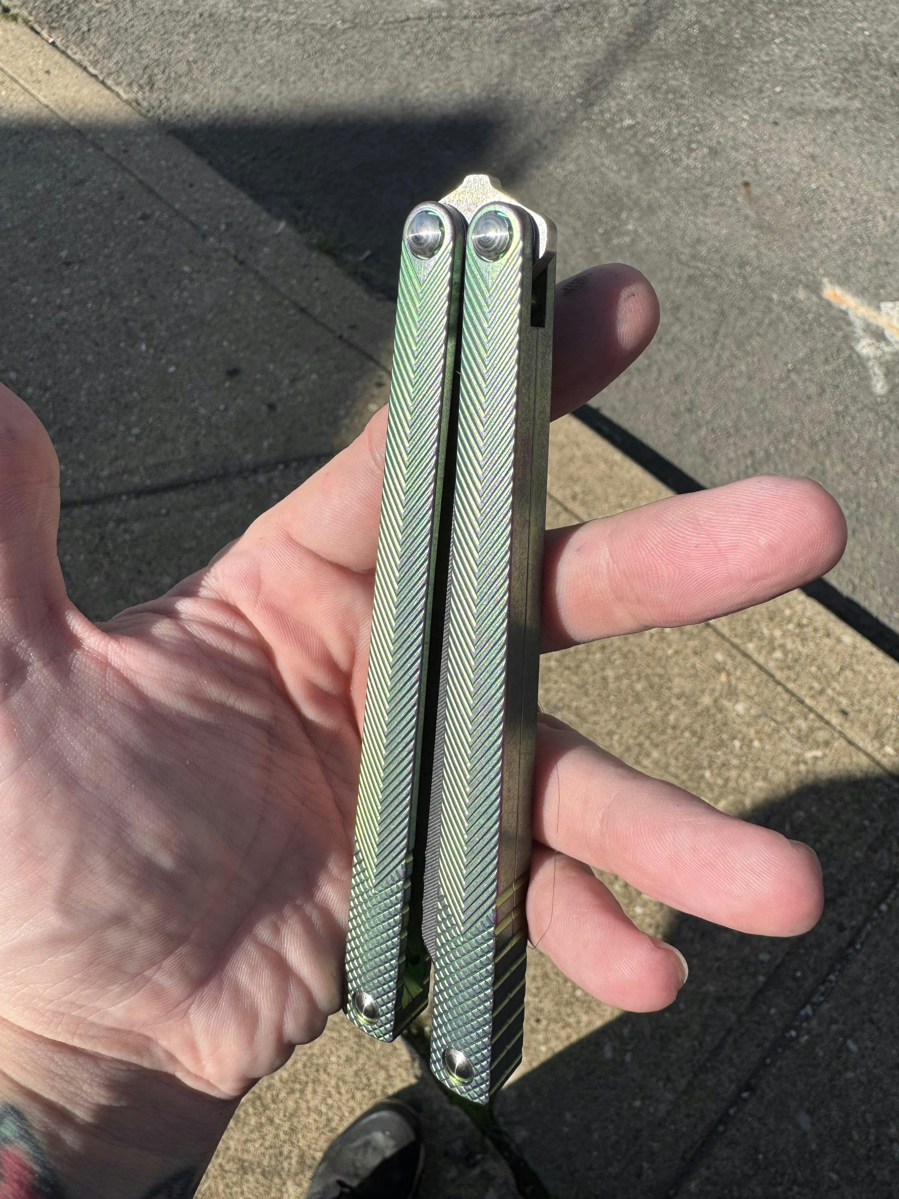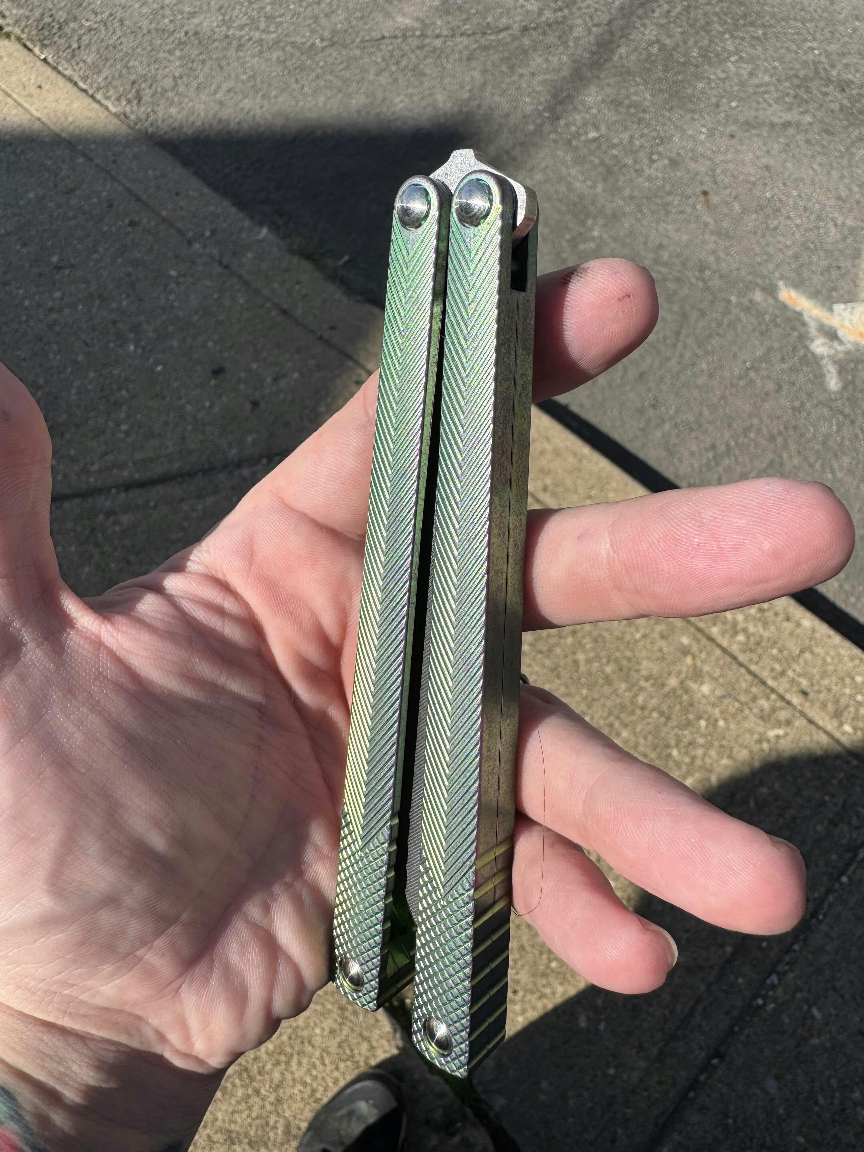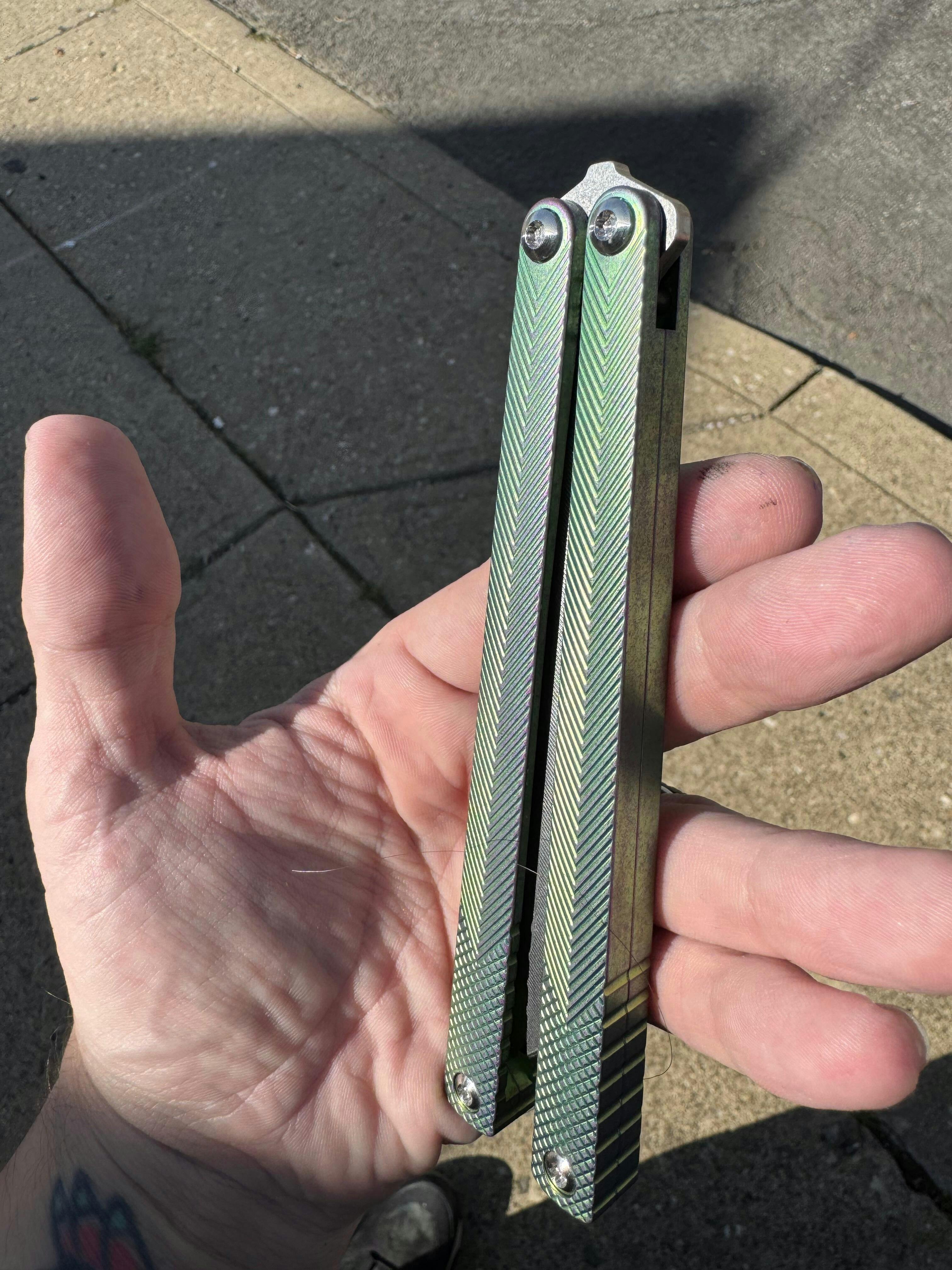 I got a beautiful custom anodized Serif with Pink to Blupurple center fade out. Living in Canada, I asked if Machinewise would do a Trainer blade since I can't carry a live edge or false edge with me. Machinewise was super accommodating and offered the trainer blade.