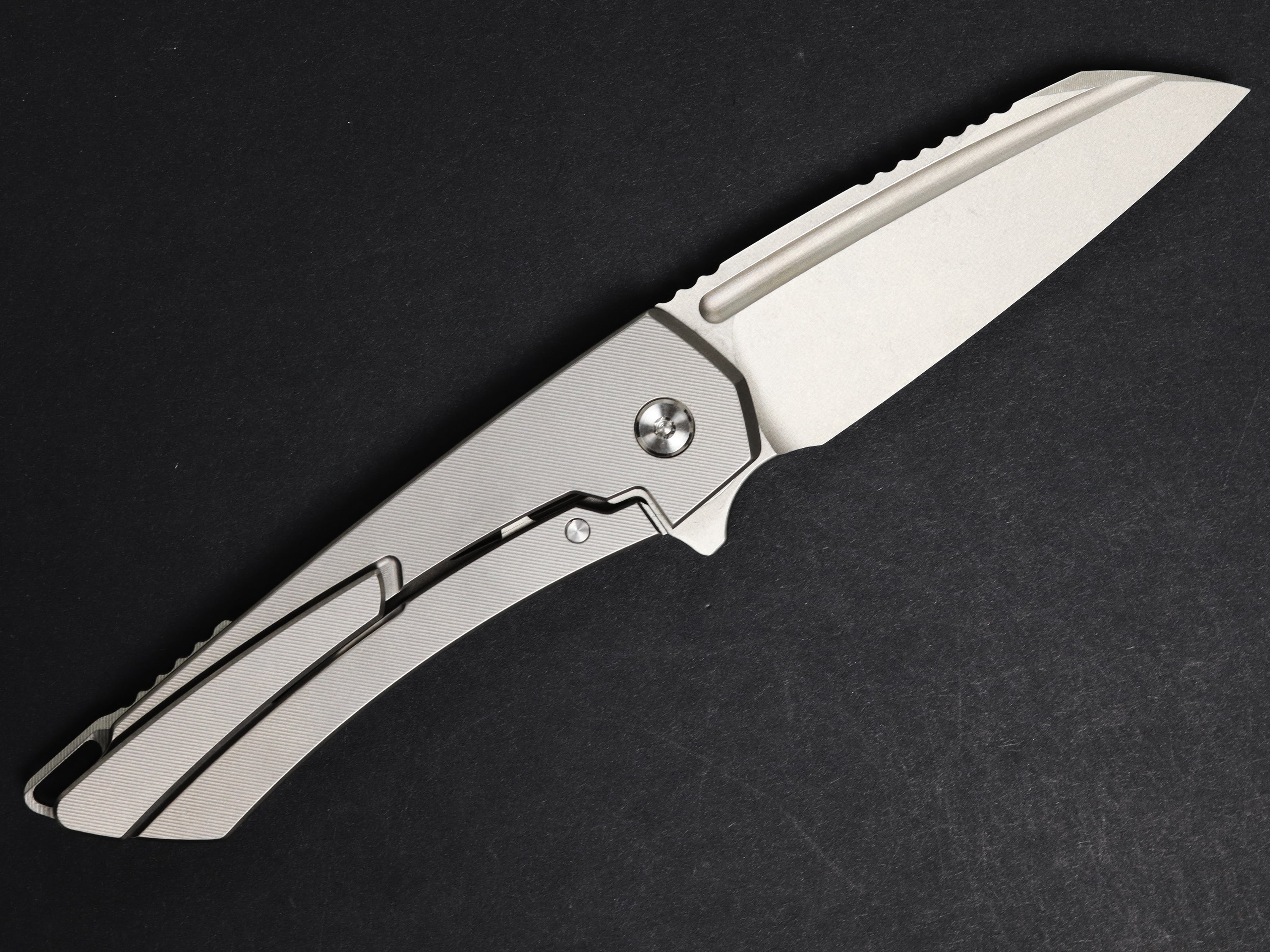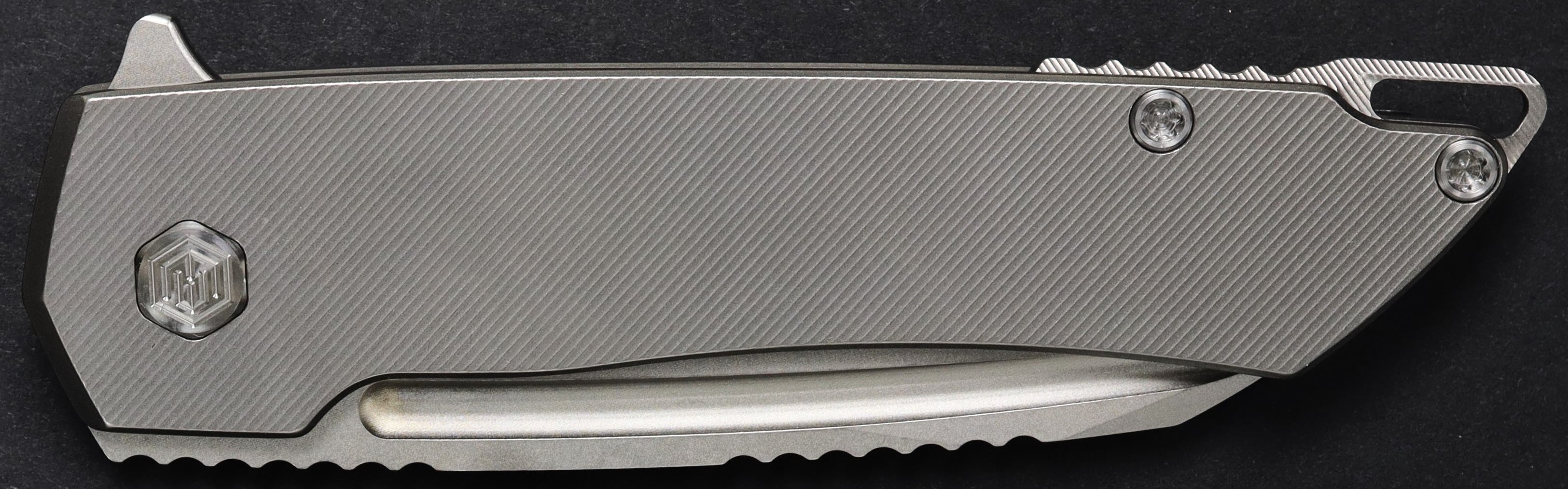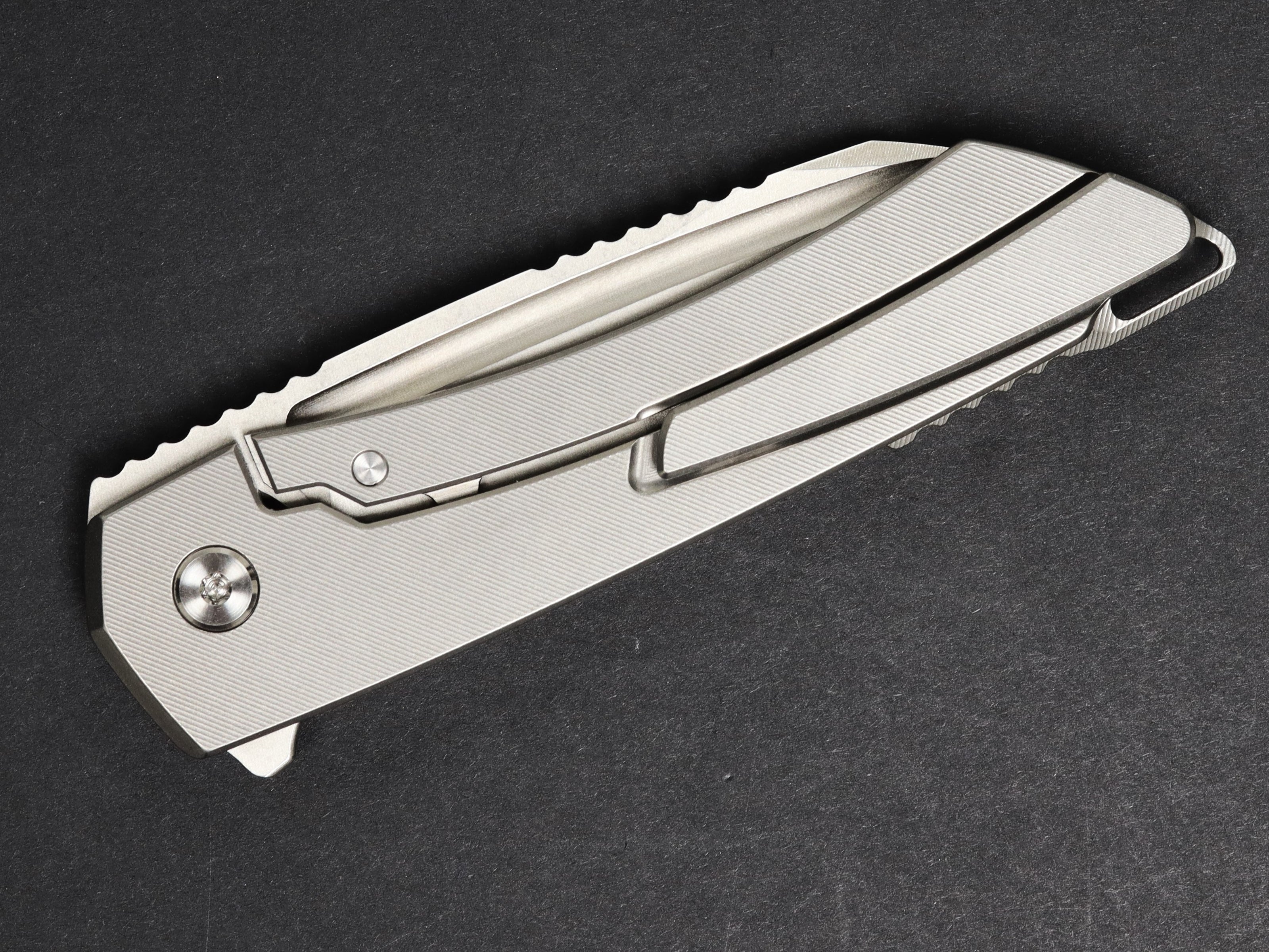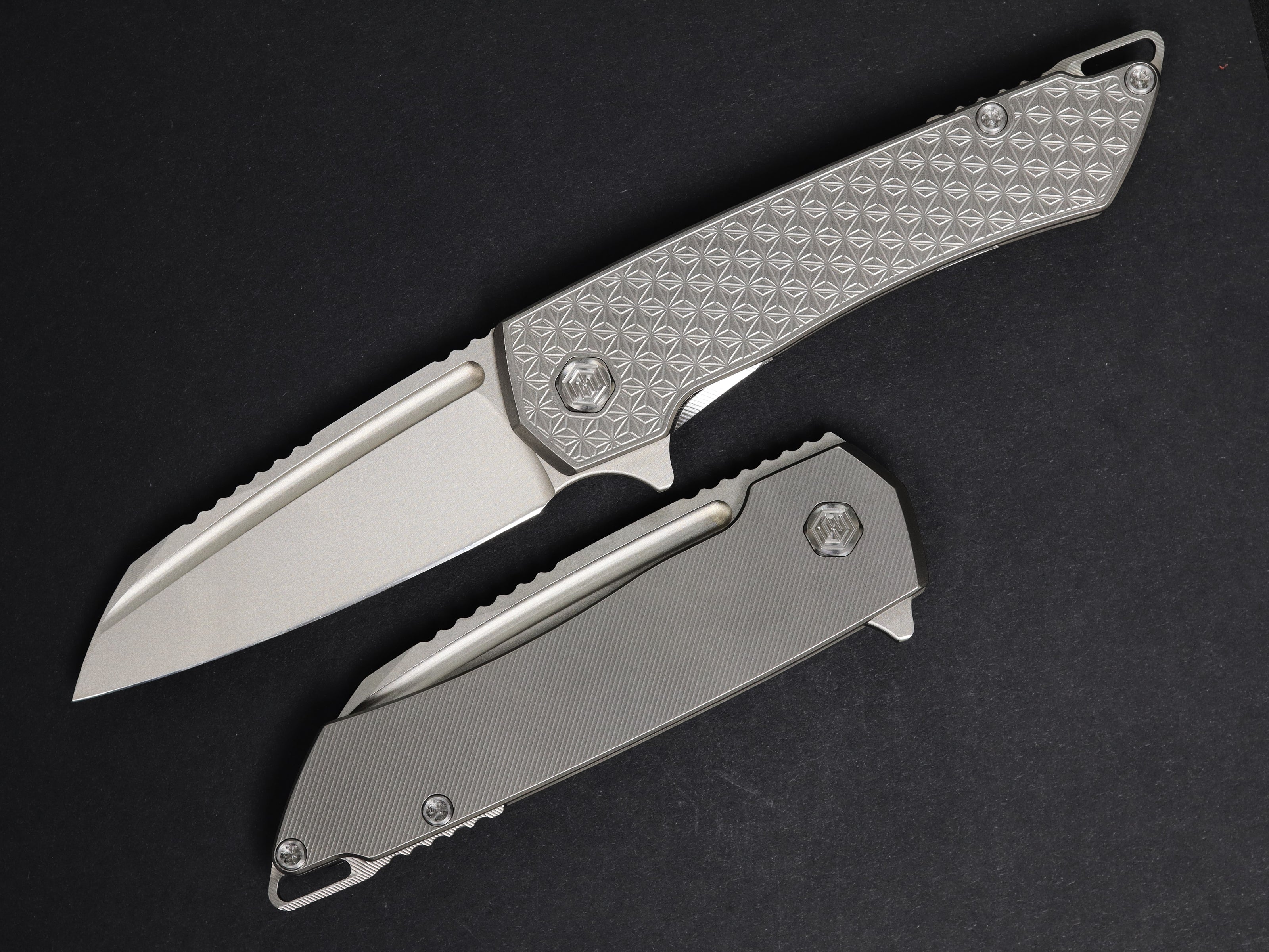 The Mojave is assembled with two slabs of titanium and a backspacer. This construction method allows us to flex our machining and design prowess.