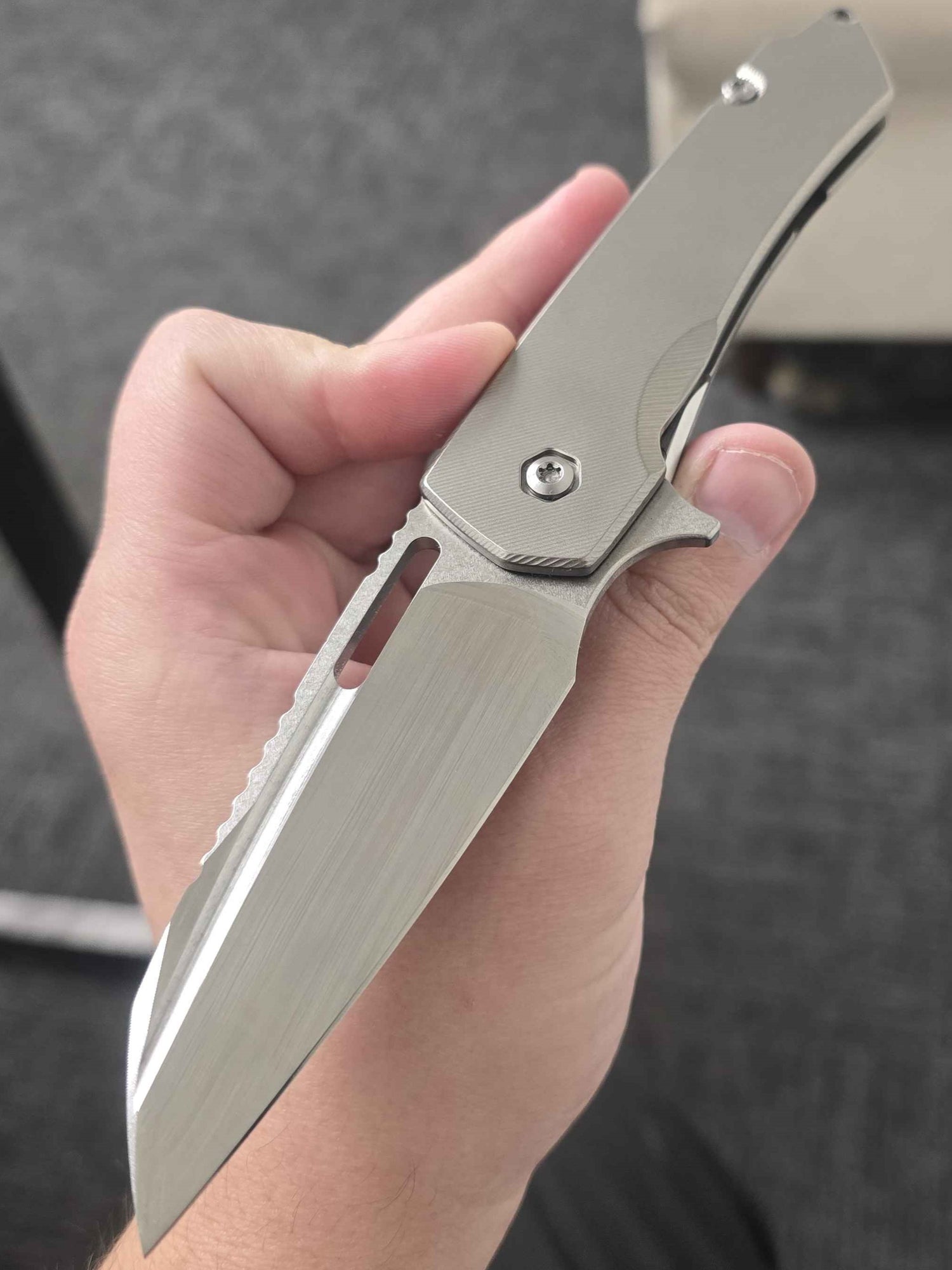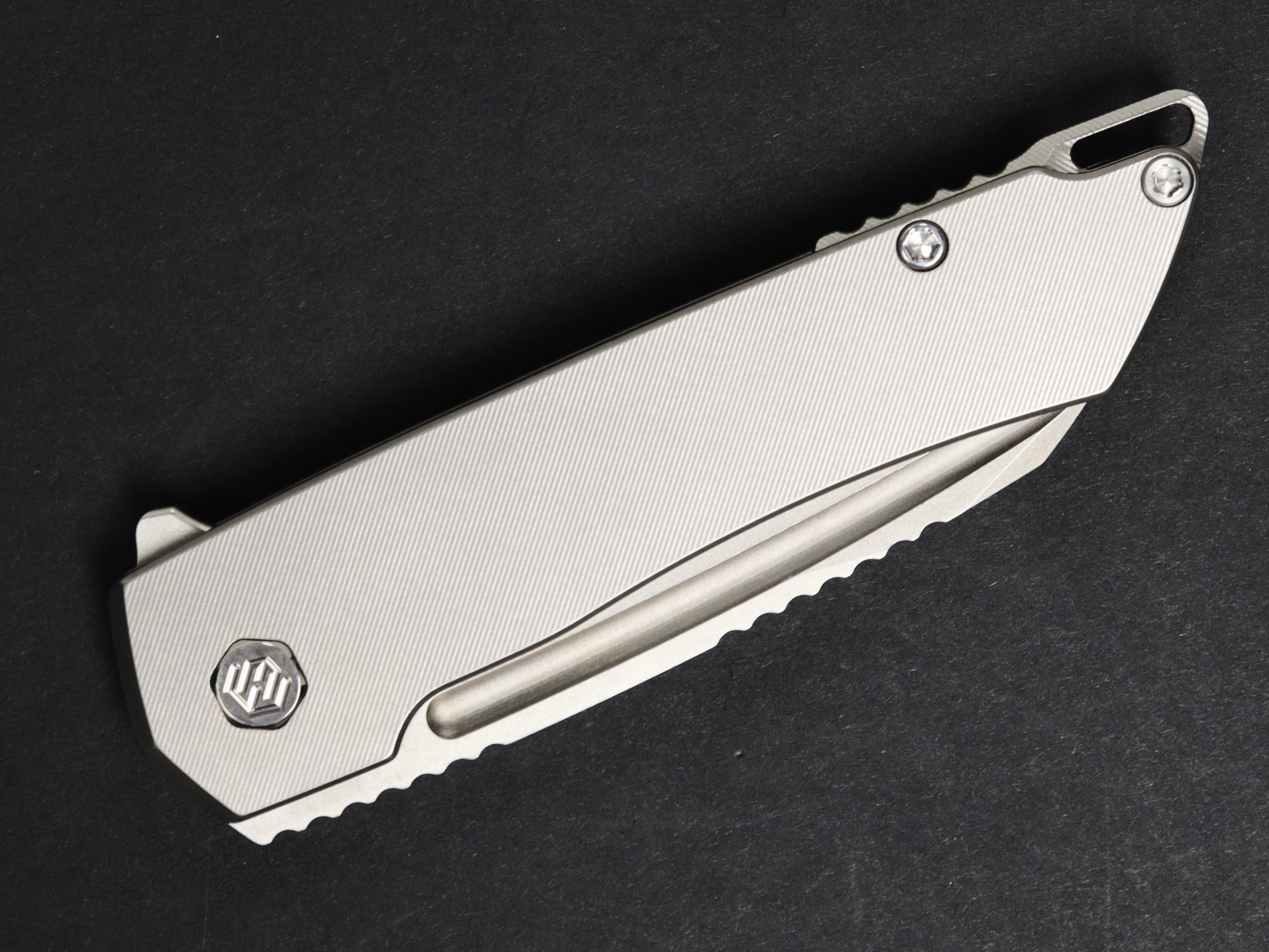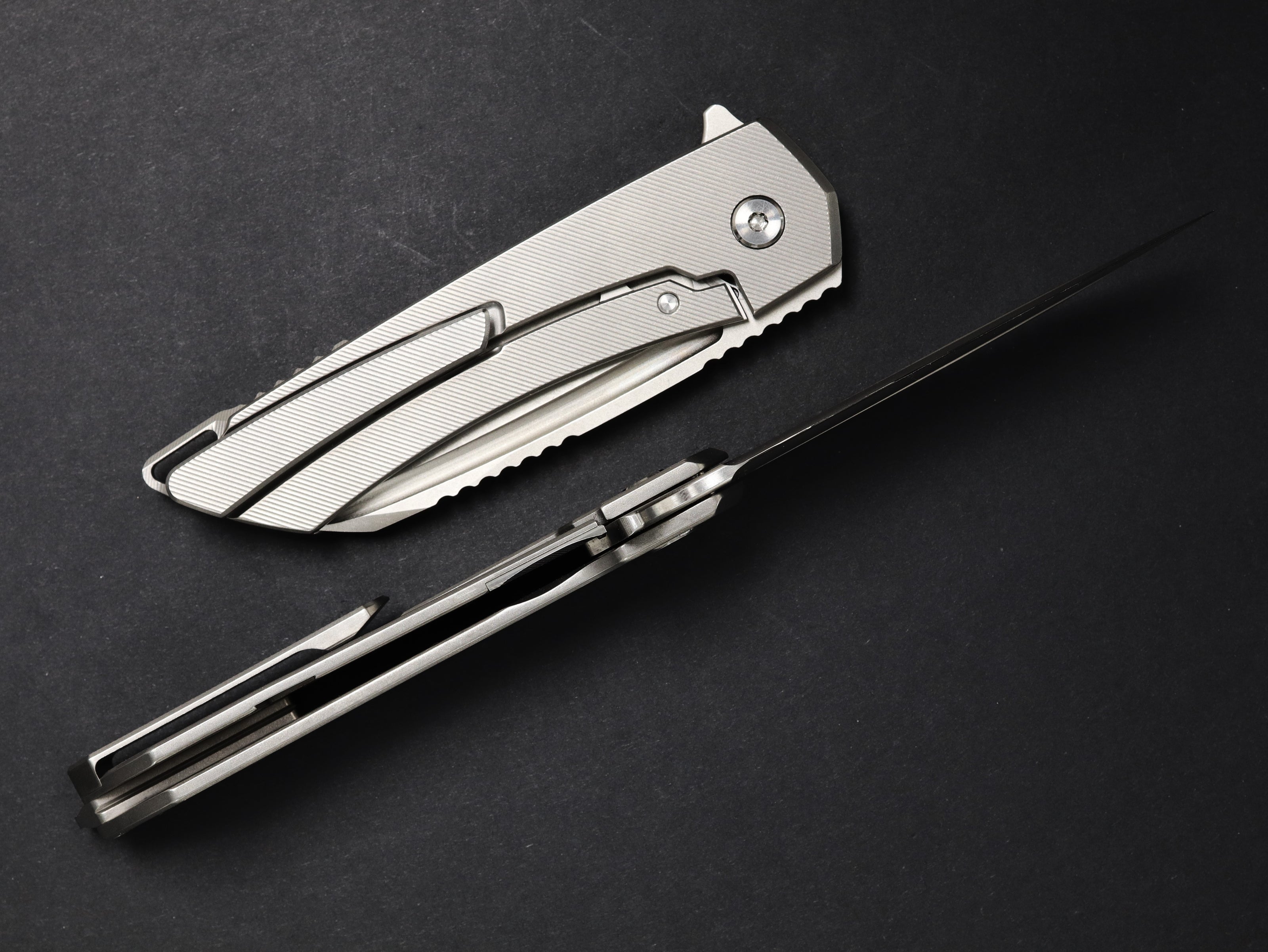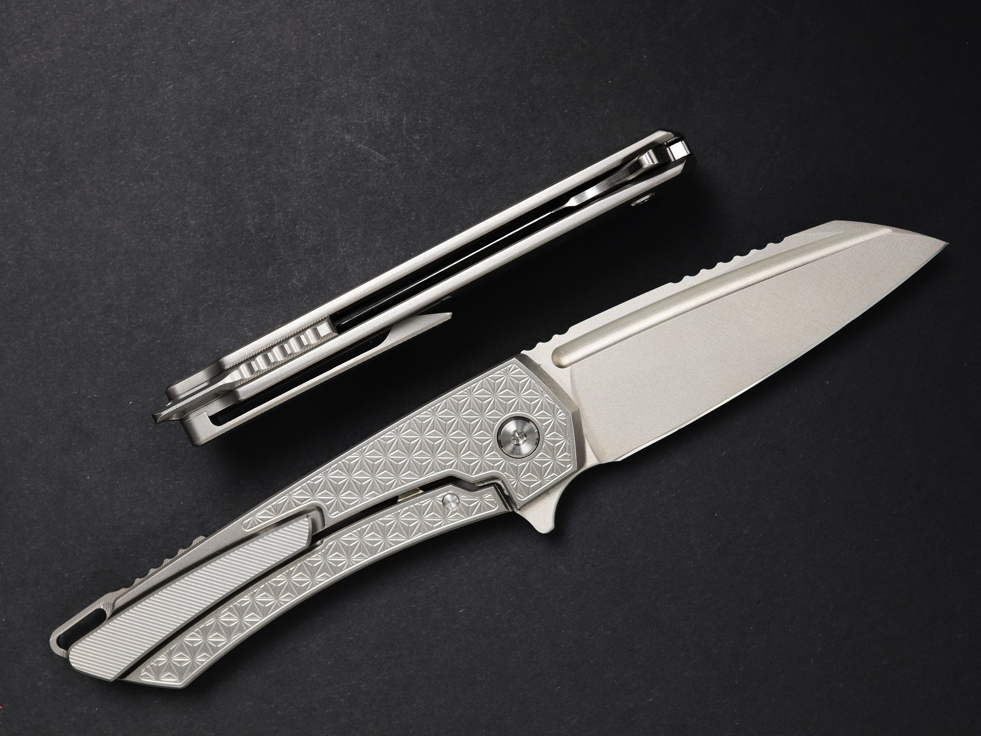 The Mojave is assembled with two slabs of titanium and a backspacer. This construction method allows us to flex our machining and design prowess.