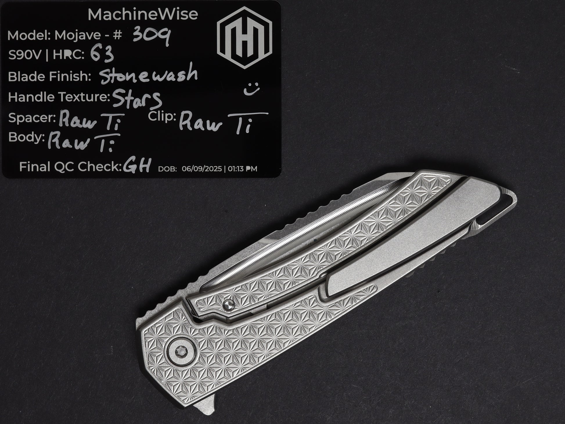 The Mojave is assembled with two slabs of titanium and a backspacer. This construction method allows us to flex our machining and design prowess.