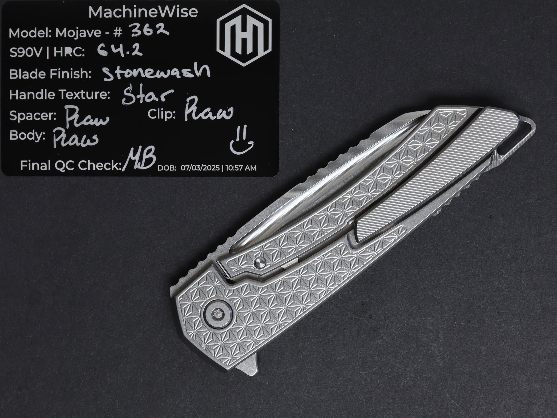 The Mojave is assembled with two slabs of titanium and a backspacer. This construction method allows us to flex our machining and design prowess.
