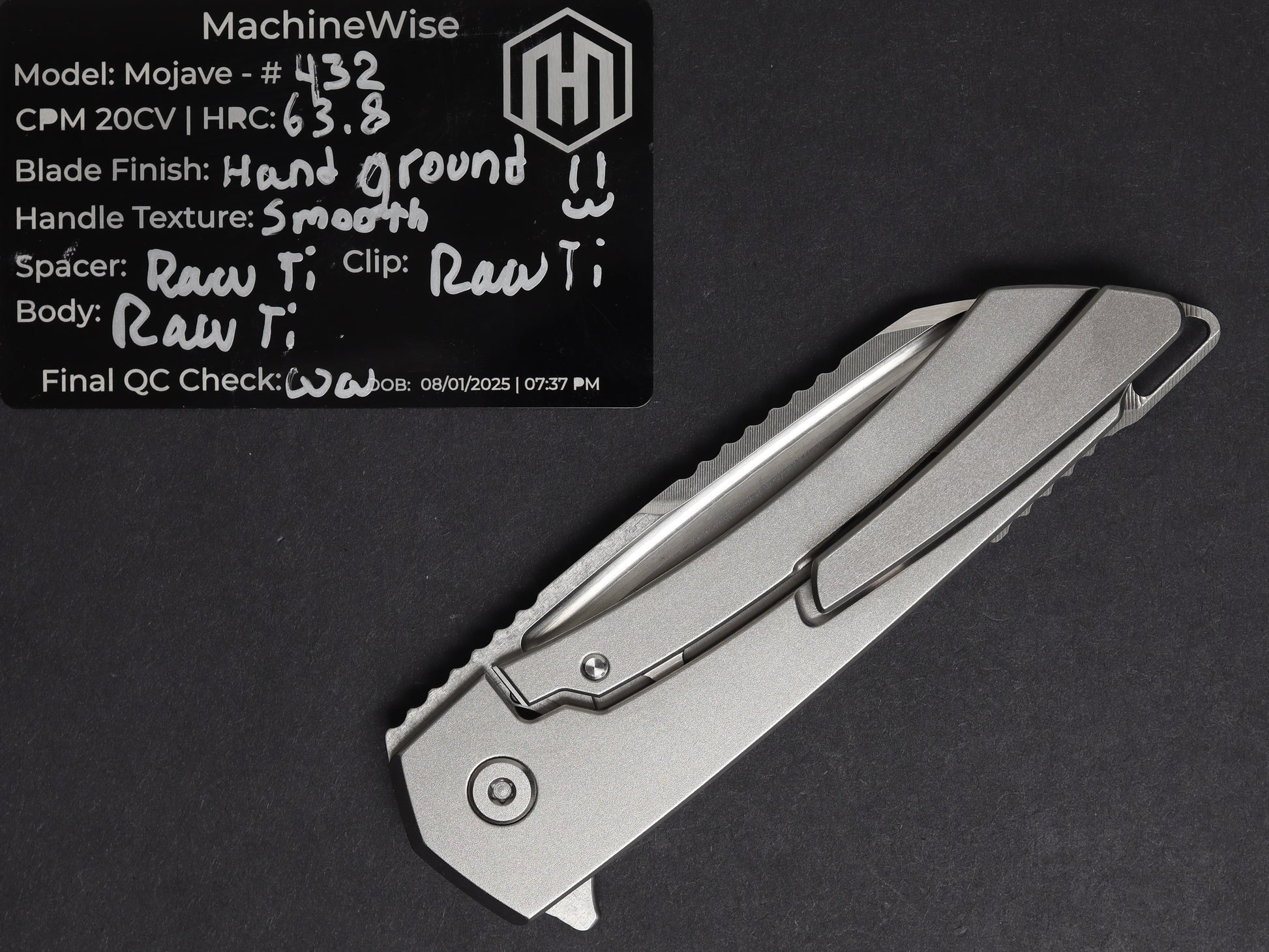 The Mojave is assembled with two slabs of titanium and a backspacer. This construction method allows us to flex our machining and design prowess.