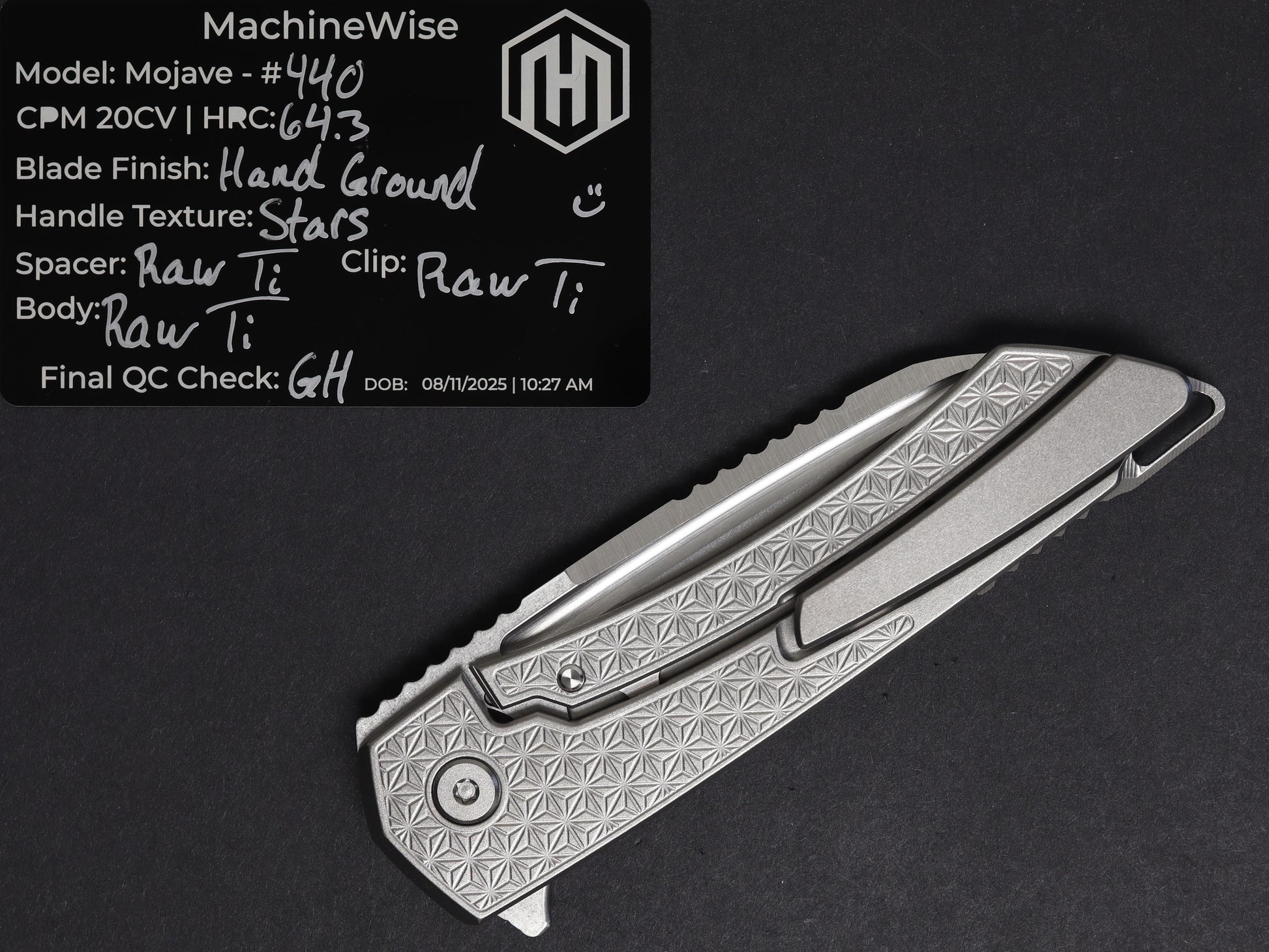 The Mojave is assembled with two slabs of titanium and a backspacer. This construction method allows us to flex our machining and design prowess.
