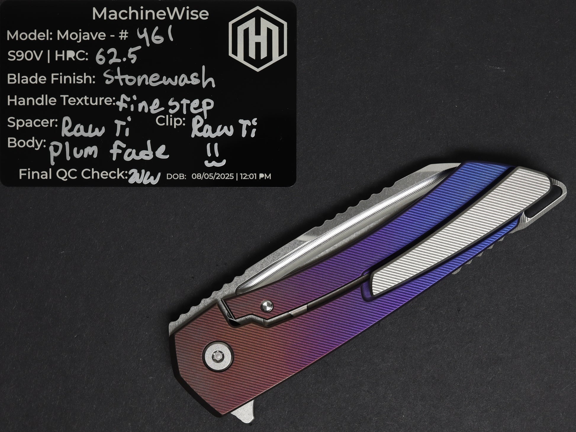 The Mojave is assembled with two slabs of titanium and a backspacer. This construction method allows us to flex our machining and design prowess.