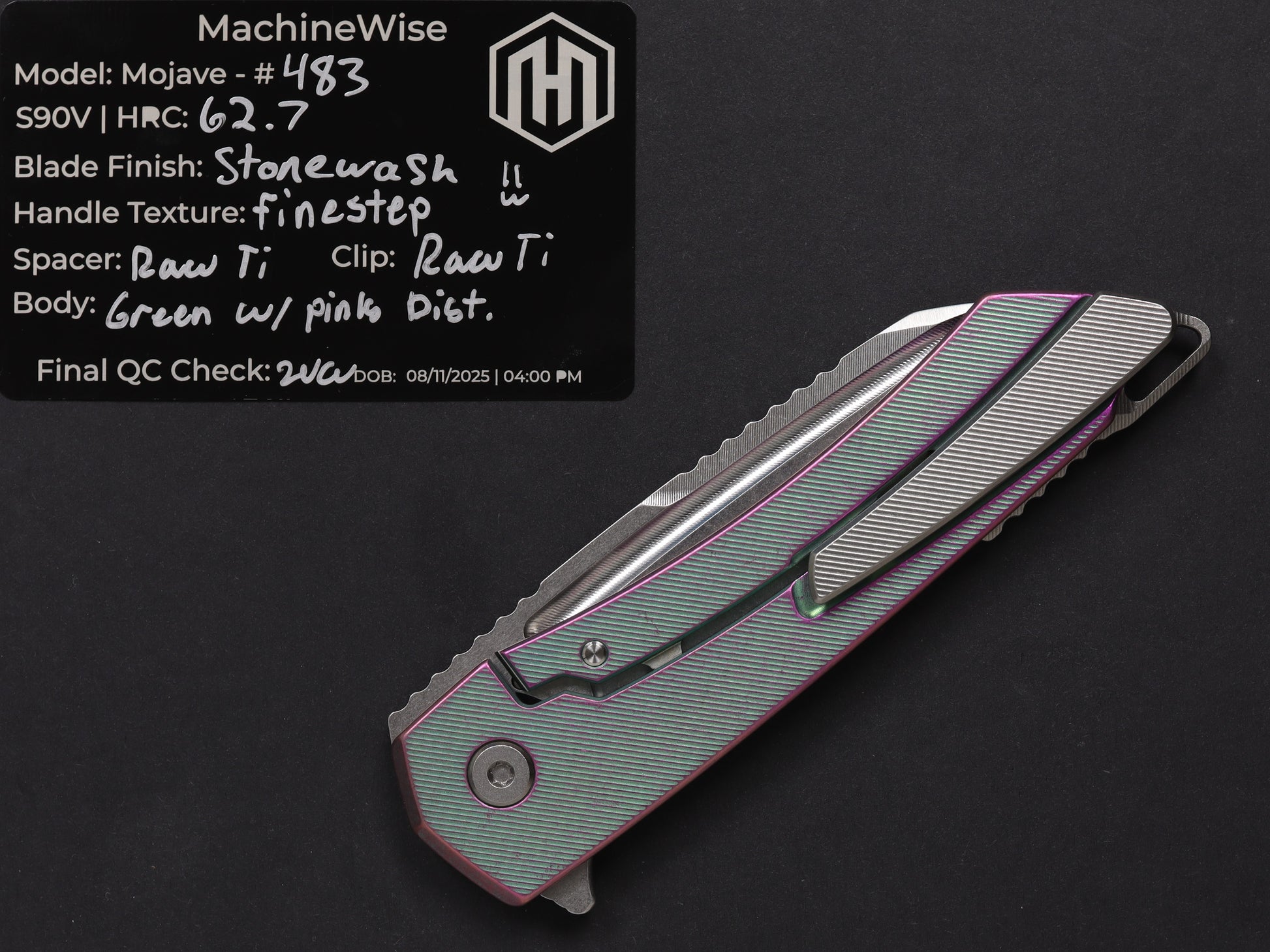 The Mojave is assembled with two slabs of titanium and a backspacer. This construction method allows us to flex our machining and design prowess.