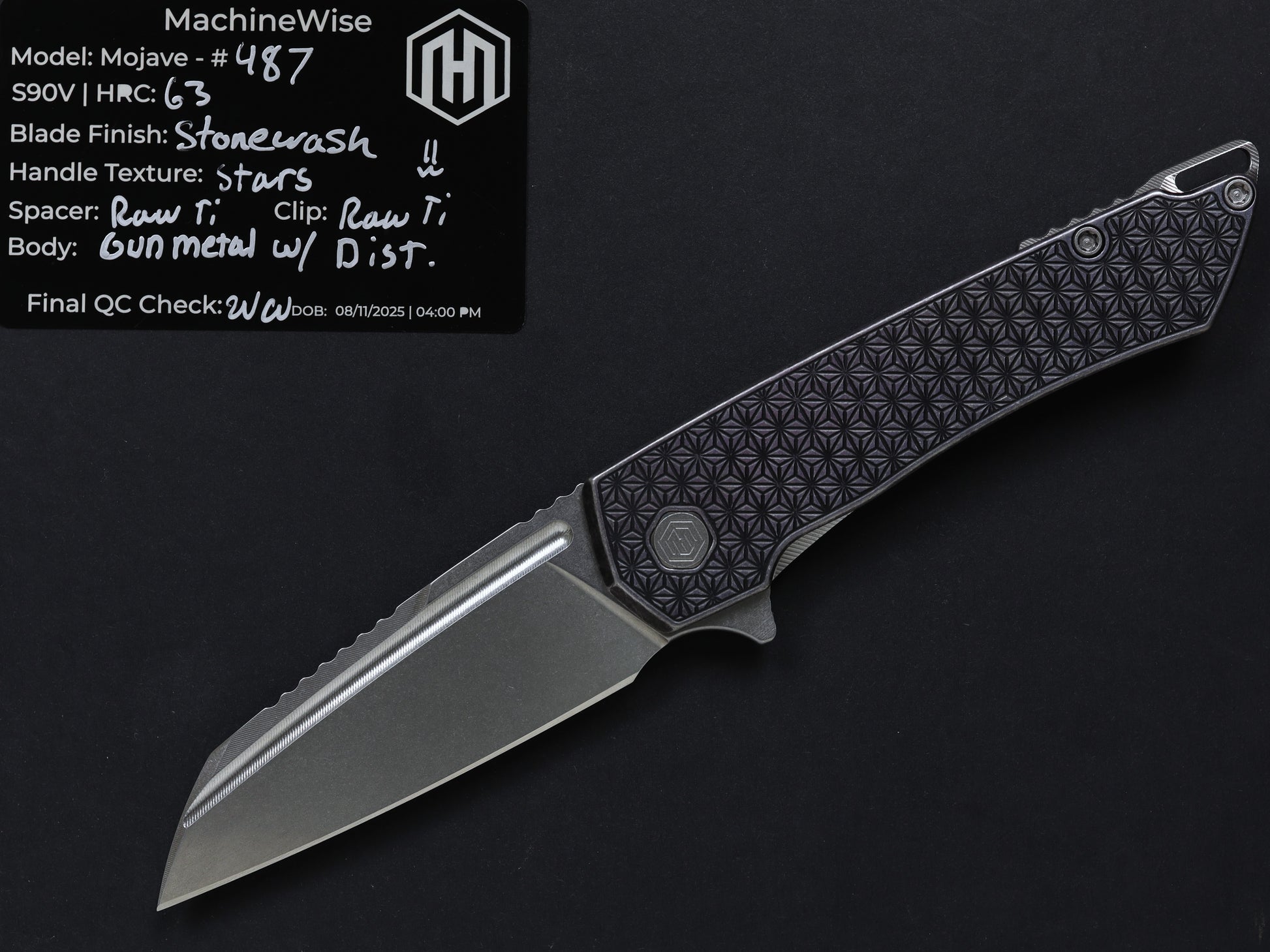 The Mojave is assembled with two slabs of titanium and a backspacer. This construction method allows us to flex our machining and design prowess.