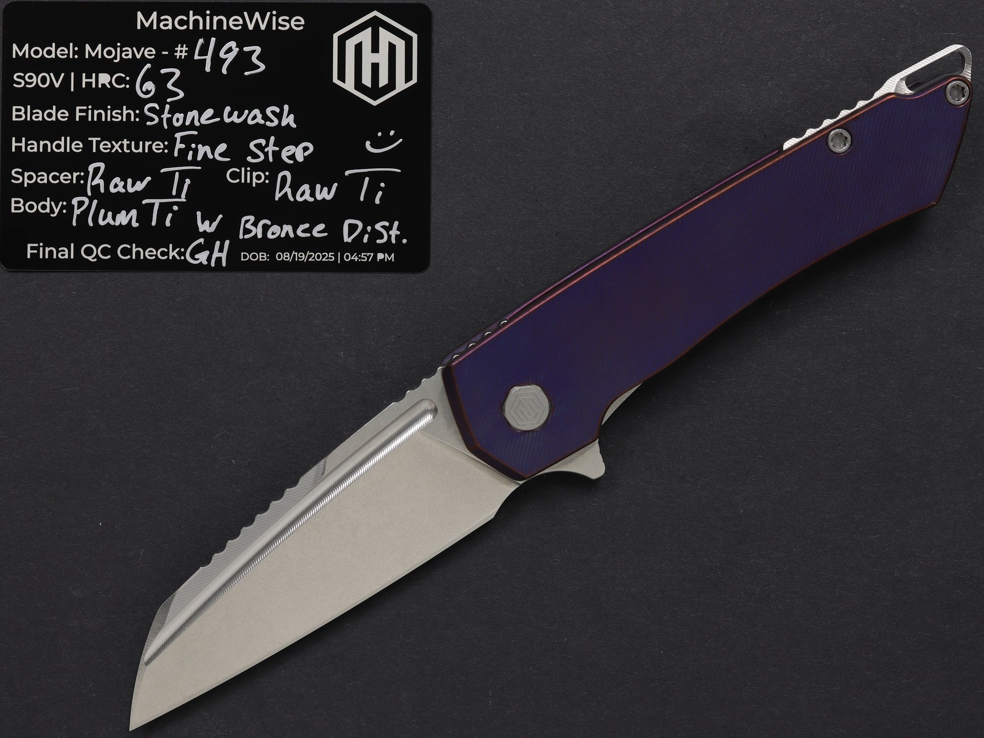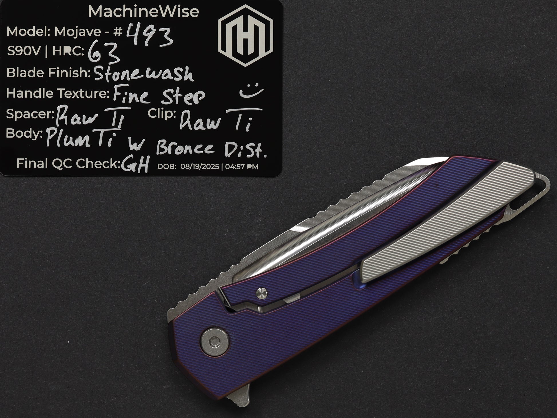 The Mojave is assembled with two slabs of titanium and a backspacer. This construction method allows us to flex our machining and design prowess.