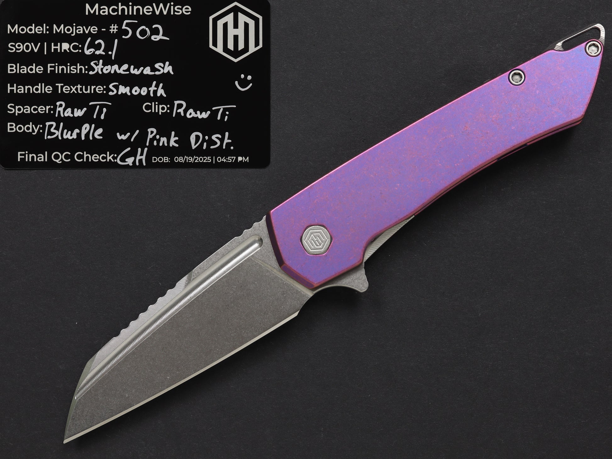 The Mojave is assembled with two slabs of titanium and a backspacer. This construction method allows us to flex our machining and design prowess.