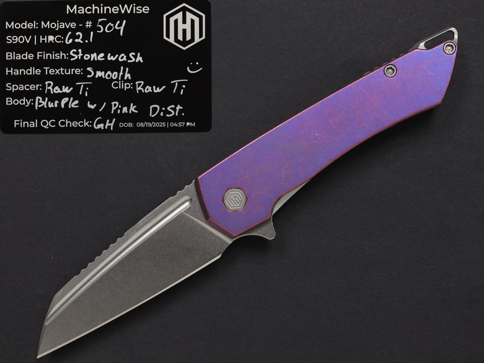 The Mojave is assembled with two slabs of titanium and a backspacer. This construction method allows us to flex our machining and design prowess.