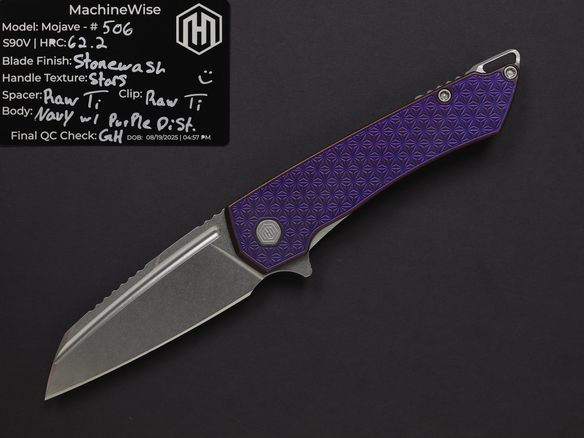 The Mojave is assembled with two slabs of titanium and a backspacer. This construction method allows us to flex our machining and design prowess.