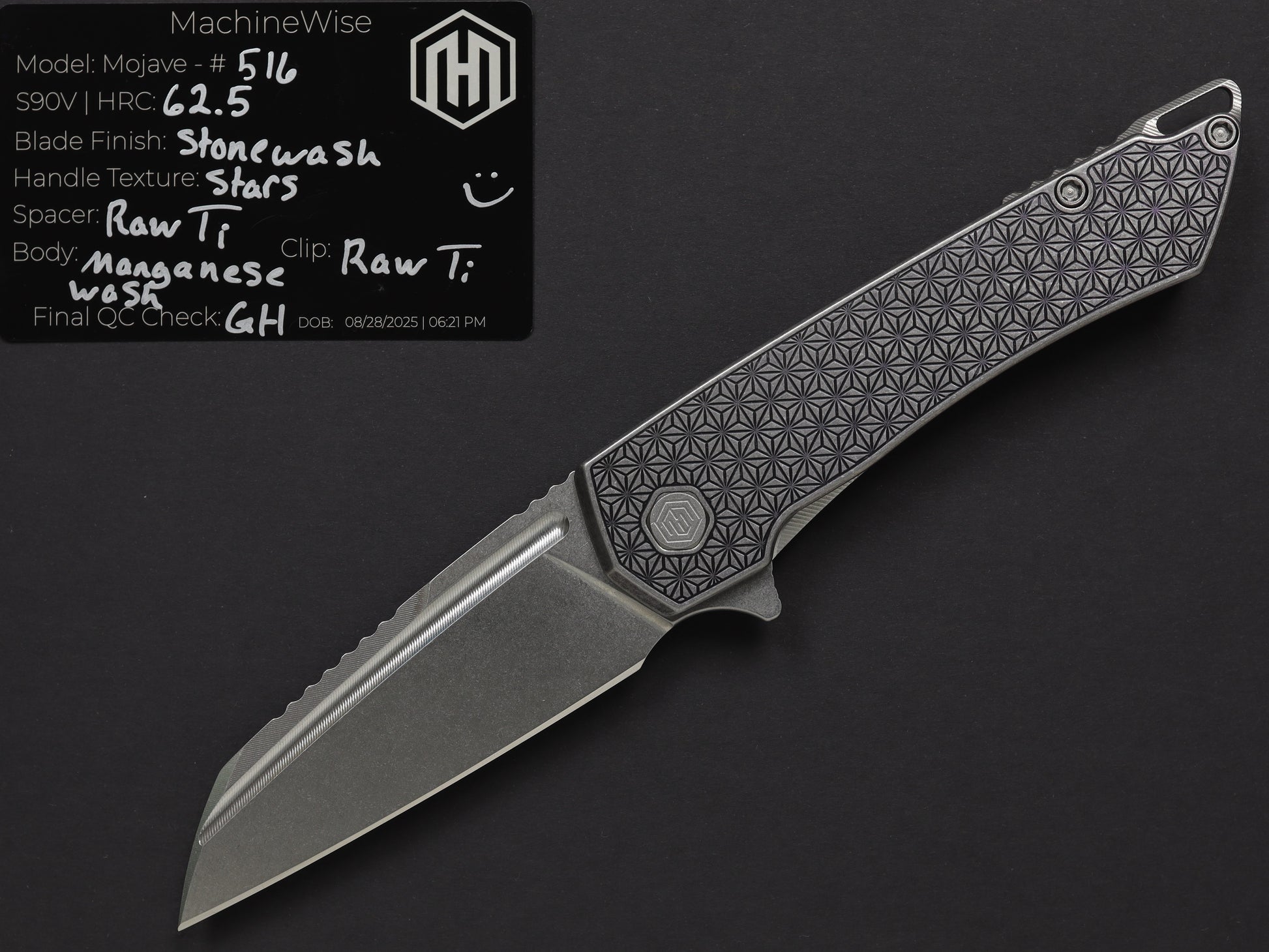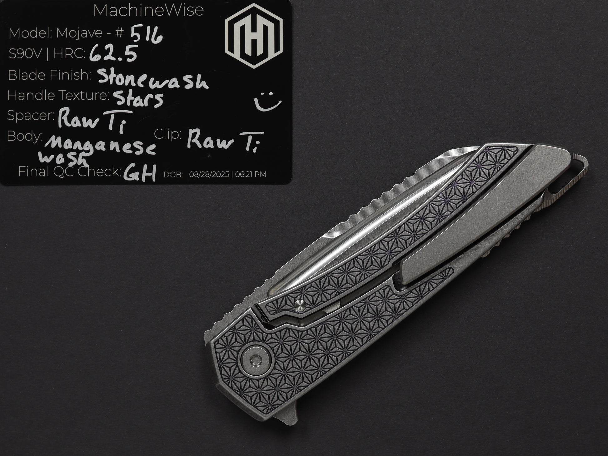 The Mojave is assembled with two slabs of titanium and a backspacer. This construction method allows us to flex our machining and design prowess.