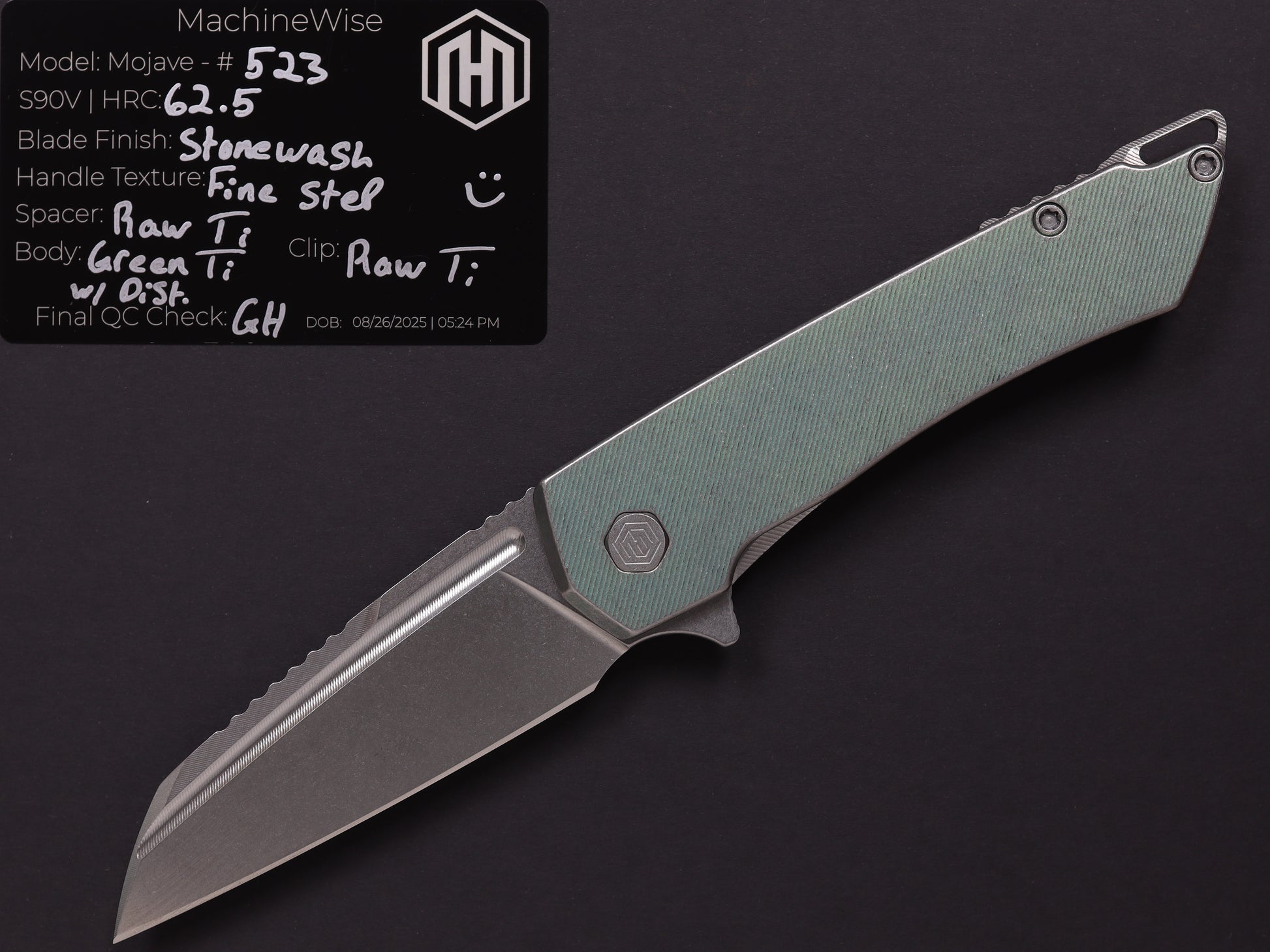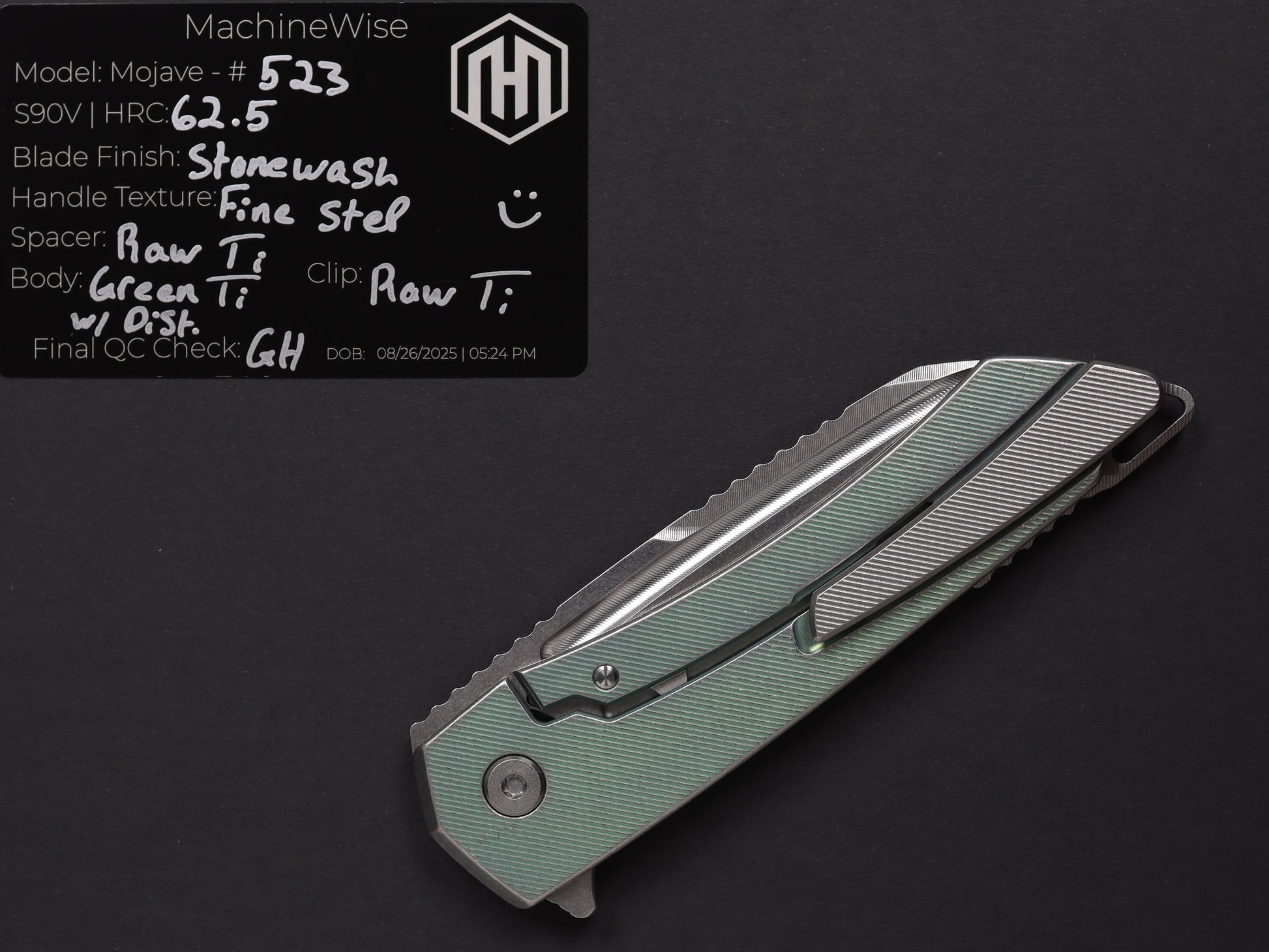 The Mojave is assembled with two slabs of titanium and a backspacer. This construction method allows us to flex our machining and design prowess.