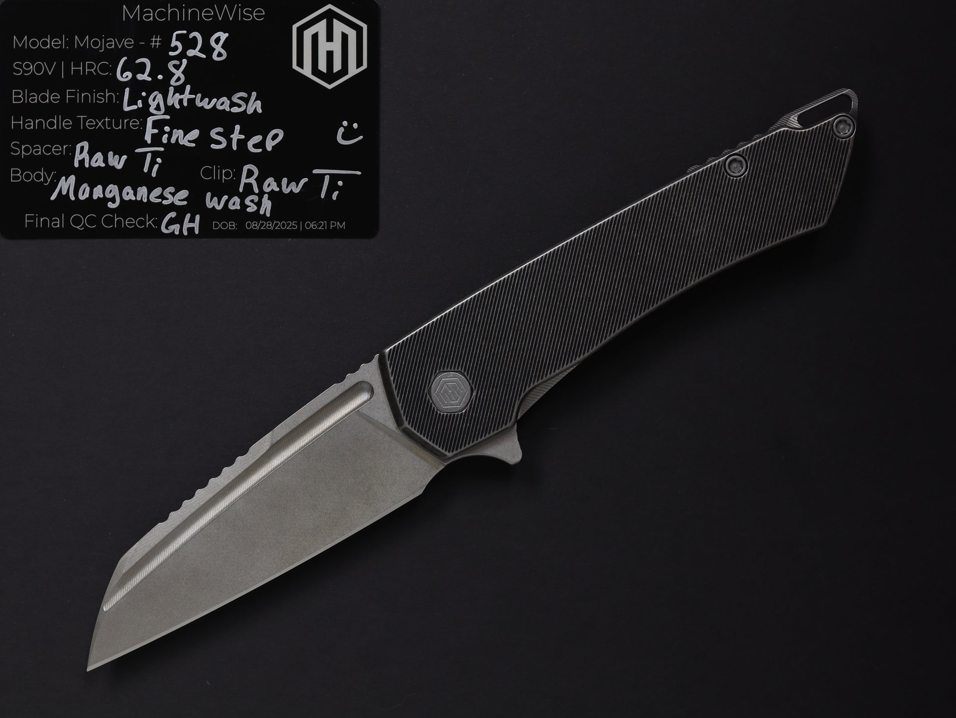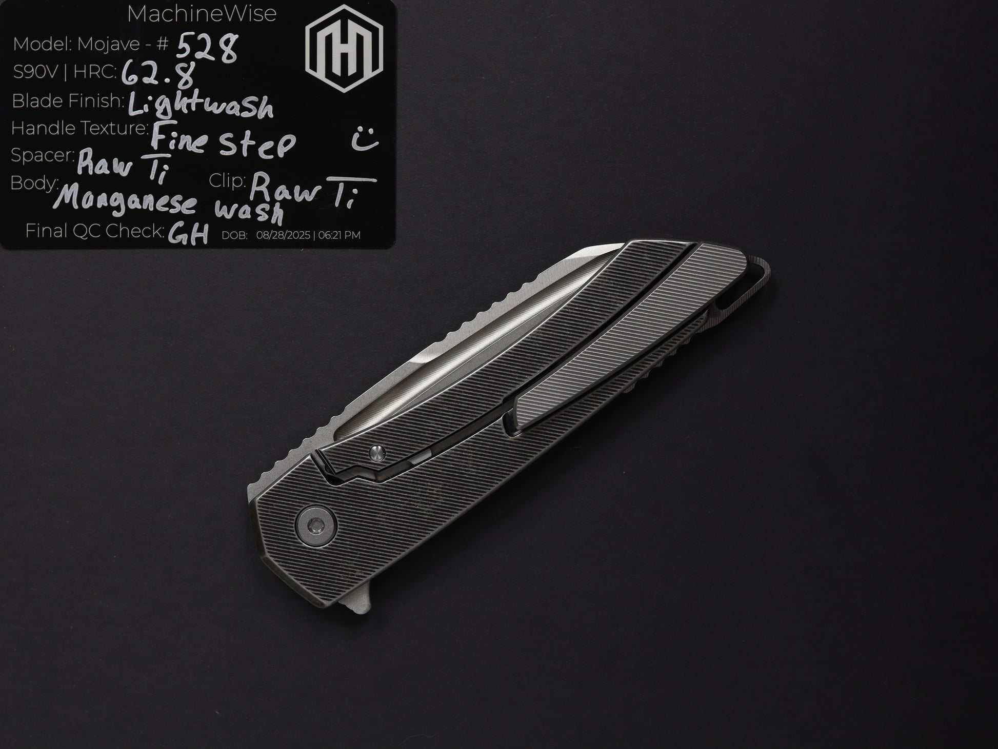 The Mojave is assembled with two slabs of titanium and a backspacer. This construction method allows us to flex our machining and design prowess.