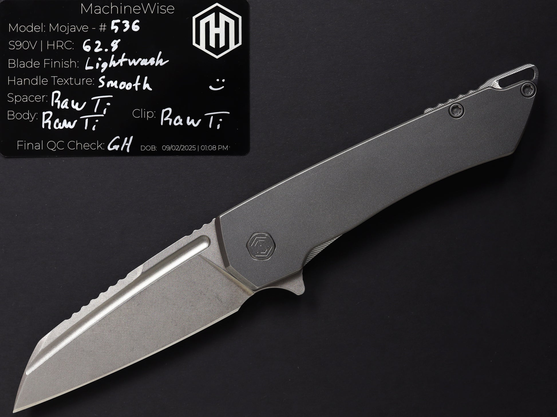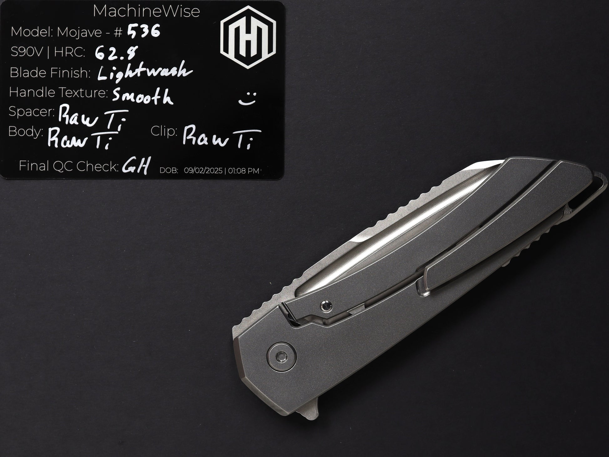 The Mojave is assembled with two slabs of titanium and a backspacer. This construction method allows us to flex our machining and design prowess.