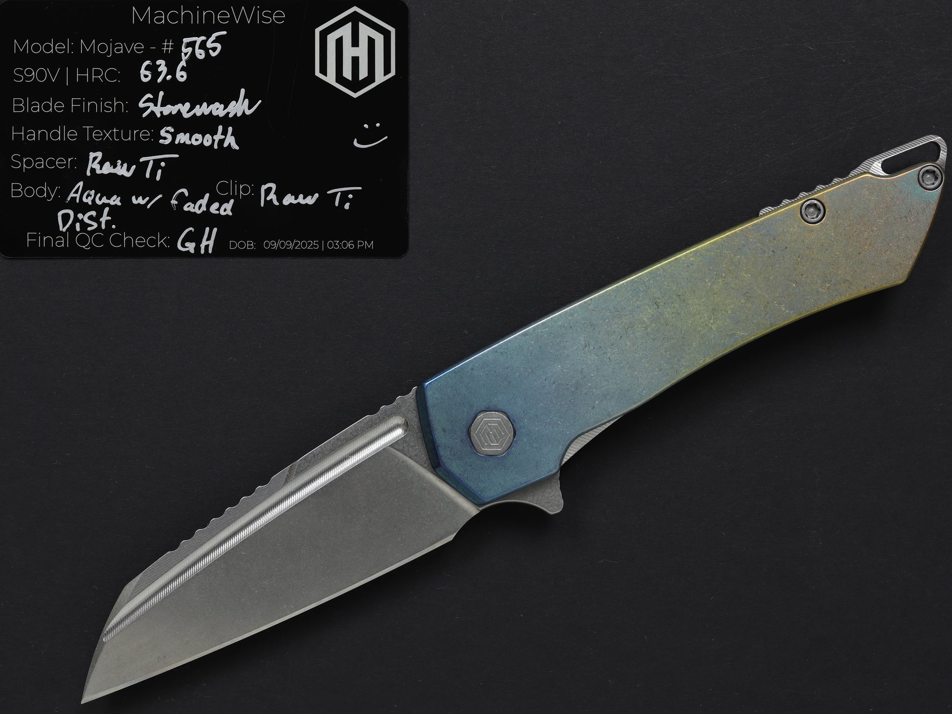 The Mojave is assembled with two slabs of titanium and a backspacer. This construction method allows us to flex our machining and design prowess.