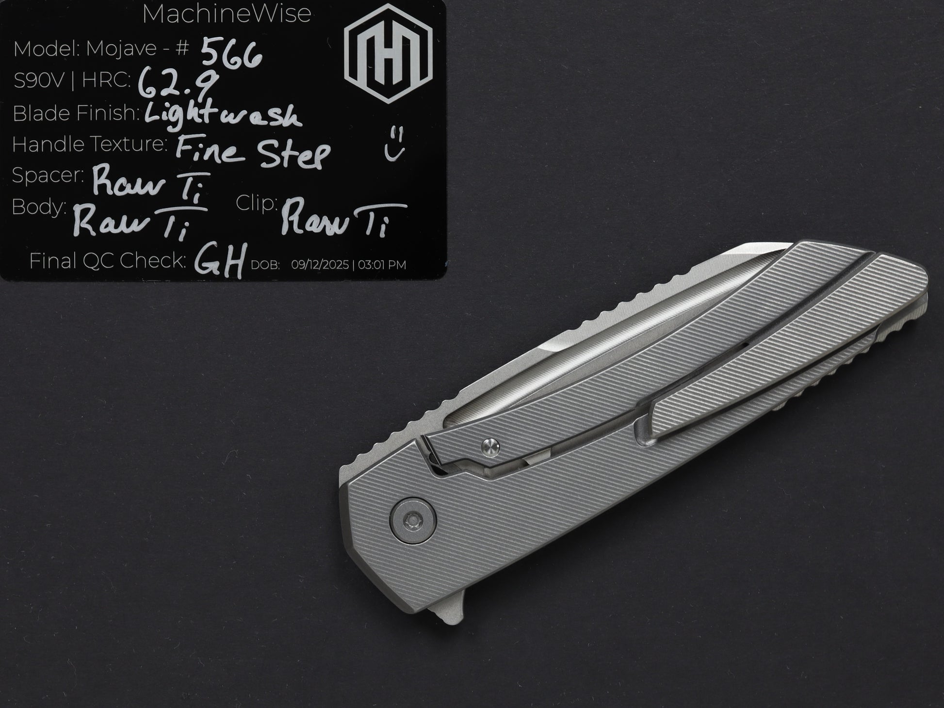 The Mojave is assembled with two slabs of titanium and a backspacer. This construction method allows us to flex our machining and design prowess.
