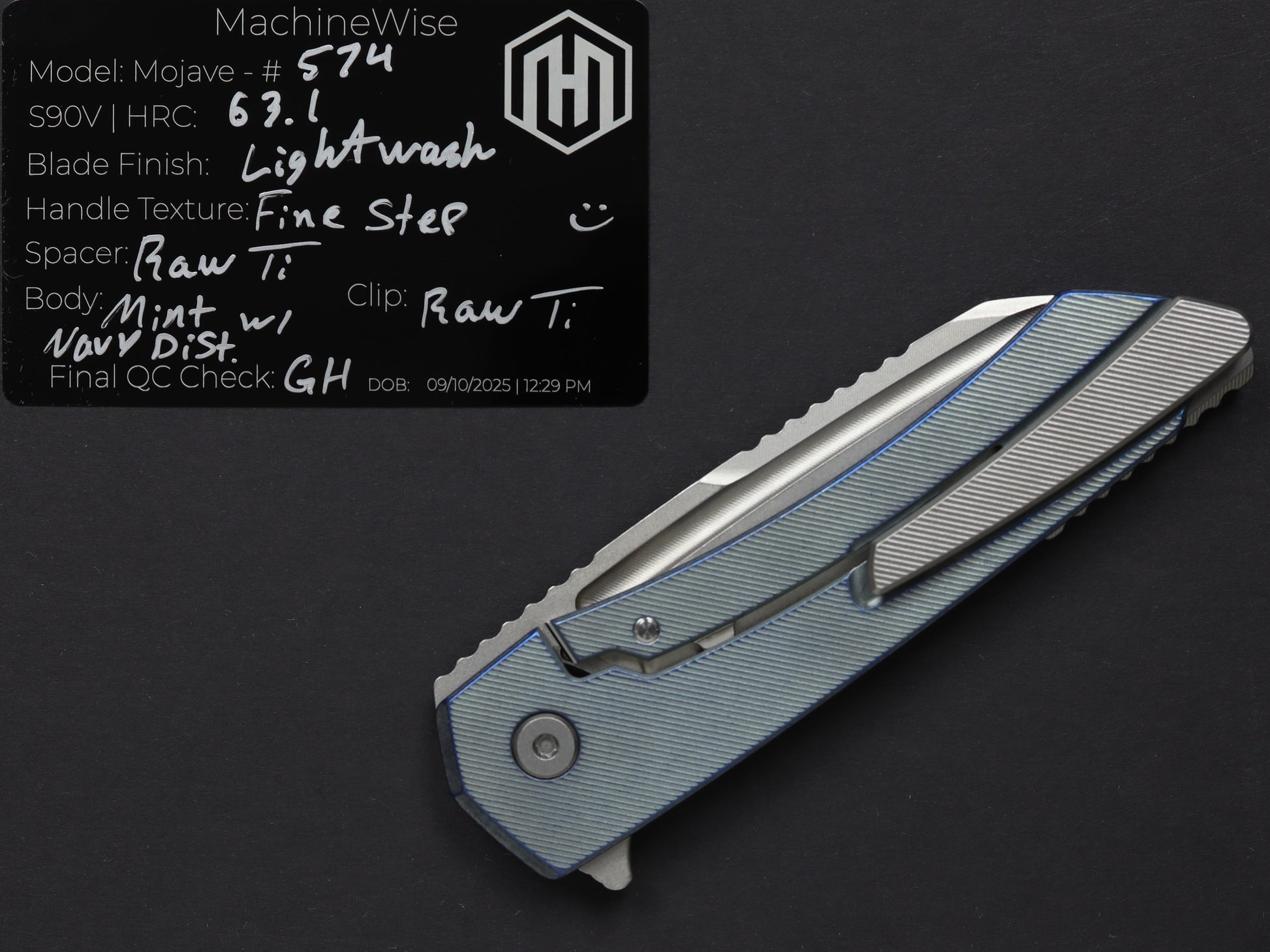 The Mojave is assembled with two slabs of titanium and a backspacer. This construction method allows us to flex our machining and design prowess.