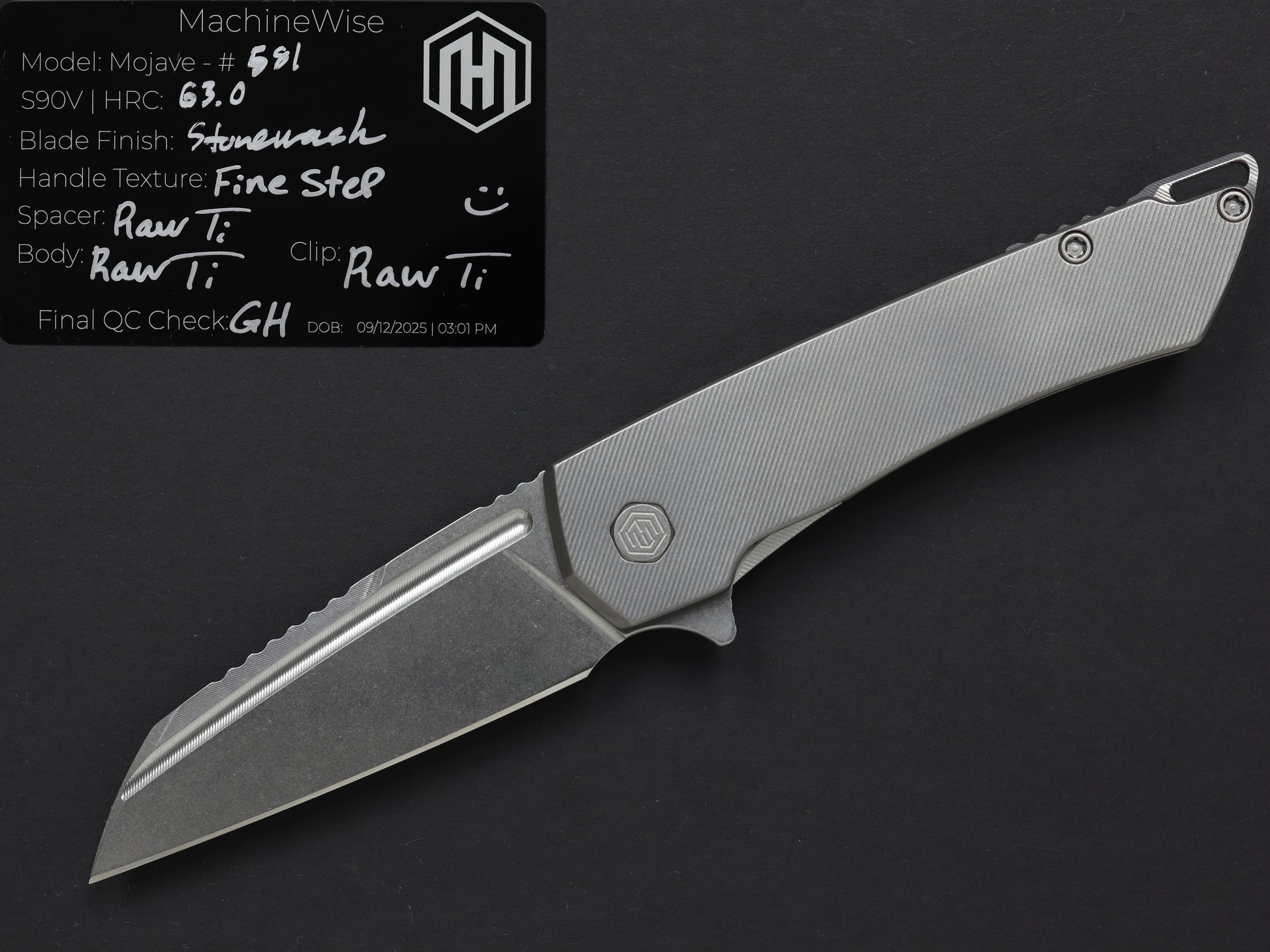 The Mojave is assembled with two slabs of titanium and a backspacer. This construction method allows us to flex our machining and design prowess.
