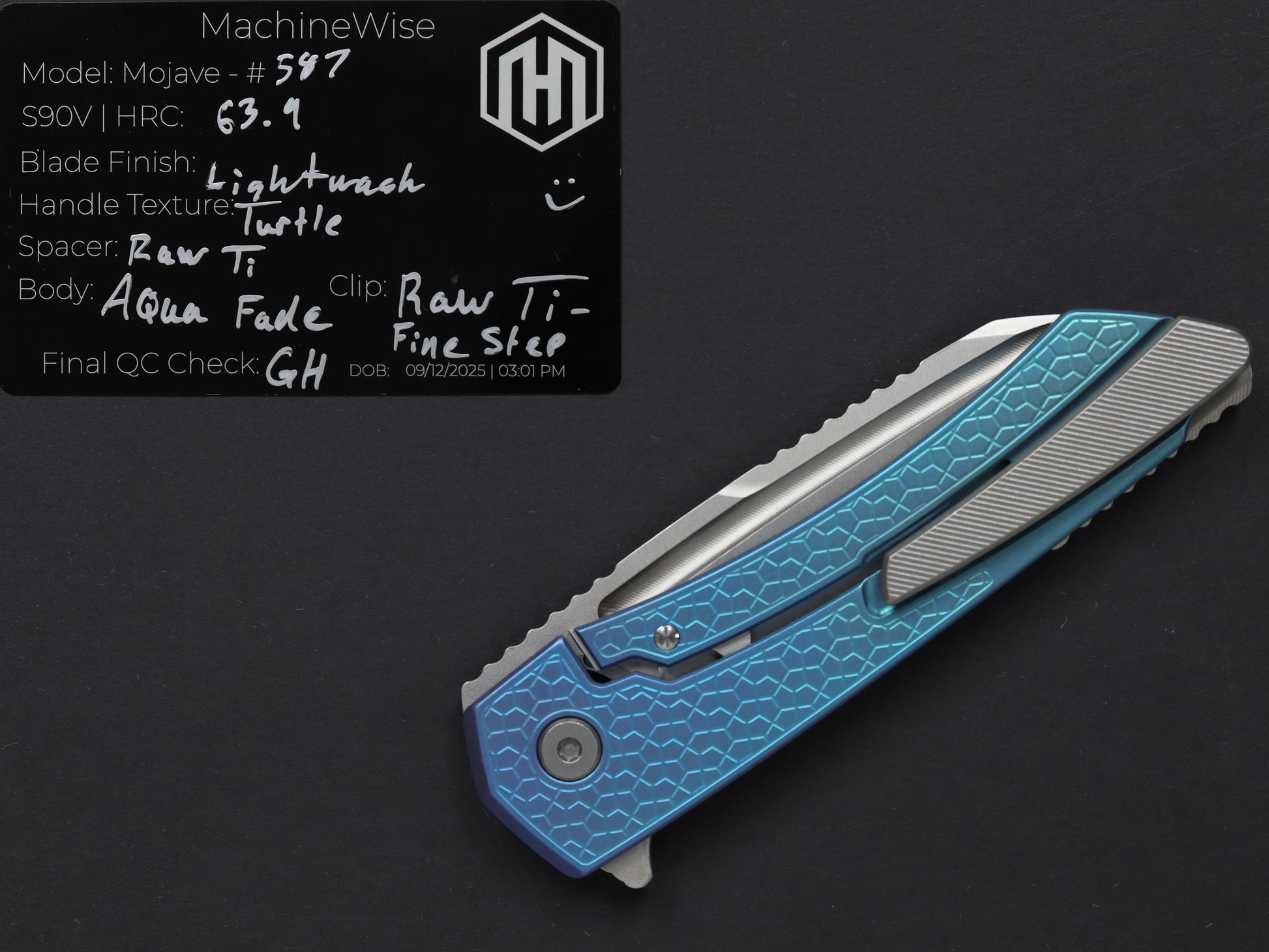 The Mojave is assembled with two slabs of titanium and a backspacer. This construction method allows us to flex our machining and design prowess.
