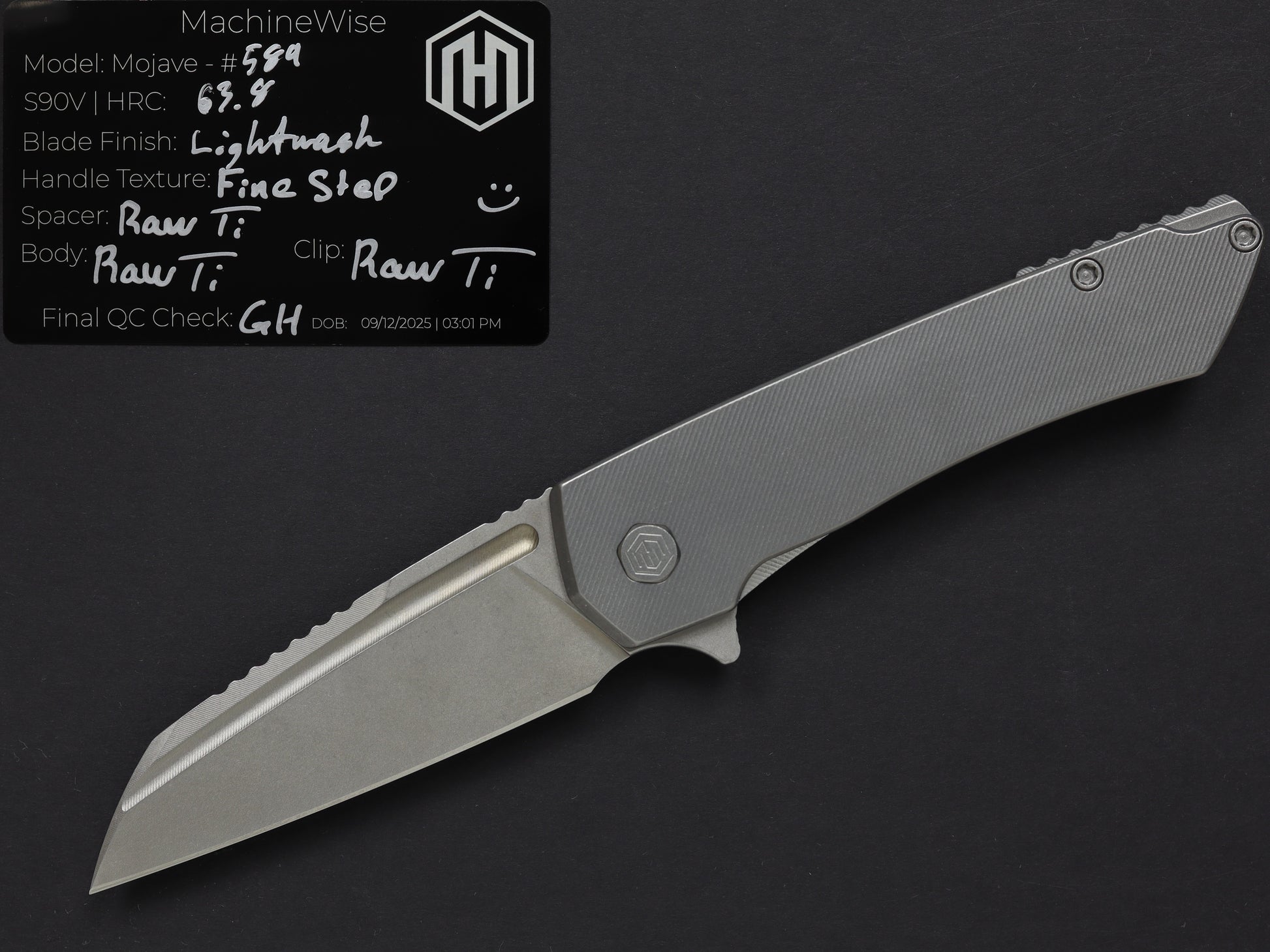 The Mojave is assembled with two slabs of titanium and a backspacer. This construction method allows us to flex our machining and design prowess.
