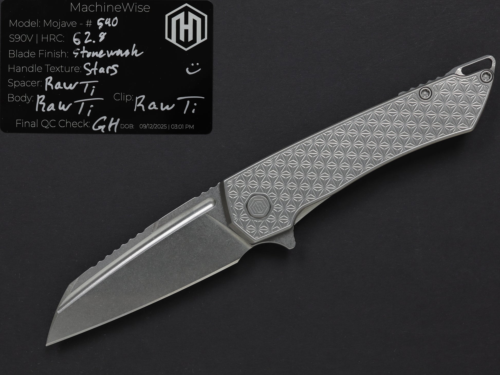 The Mojave is assembled with two slabs of titanium and a backspacer. This construction method allows us to flex our machining and design prowess.