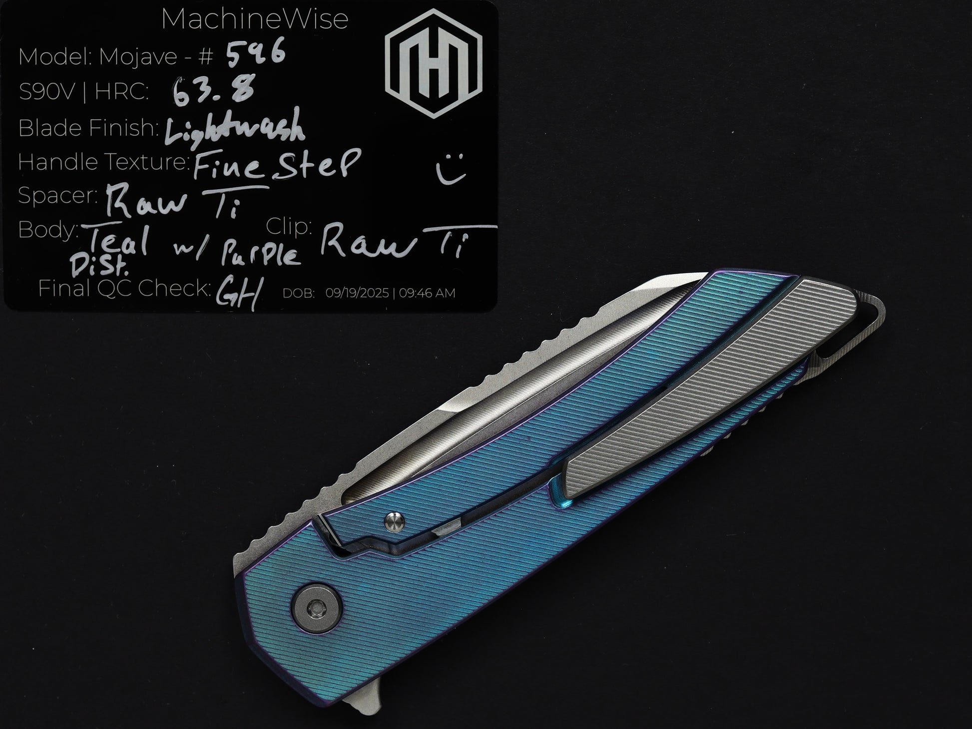 The Mojave is assembled with two slabs of titanium and a backspacer. This construction method allows us to flex our machining and design prowess.