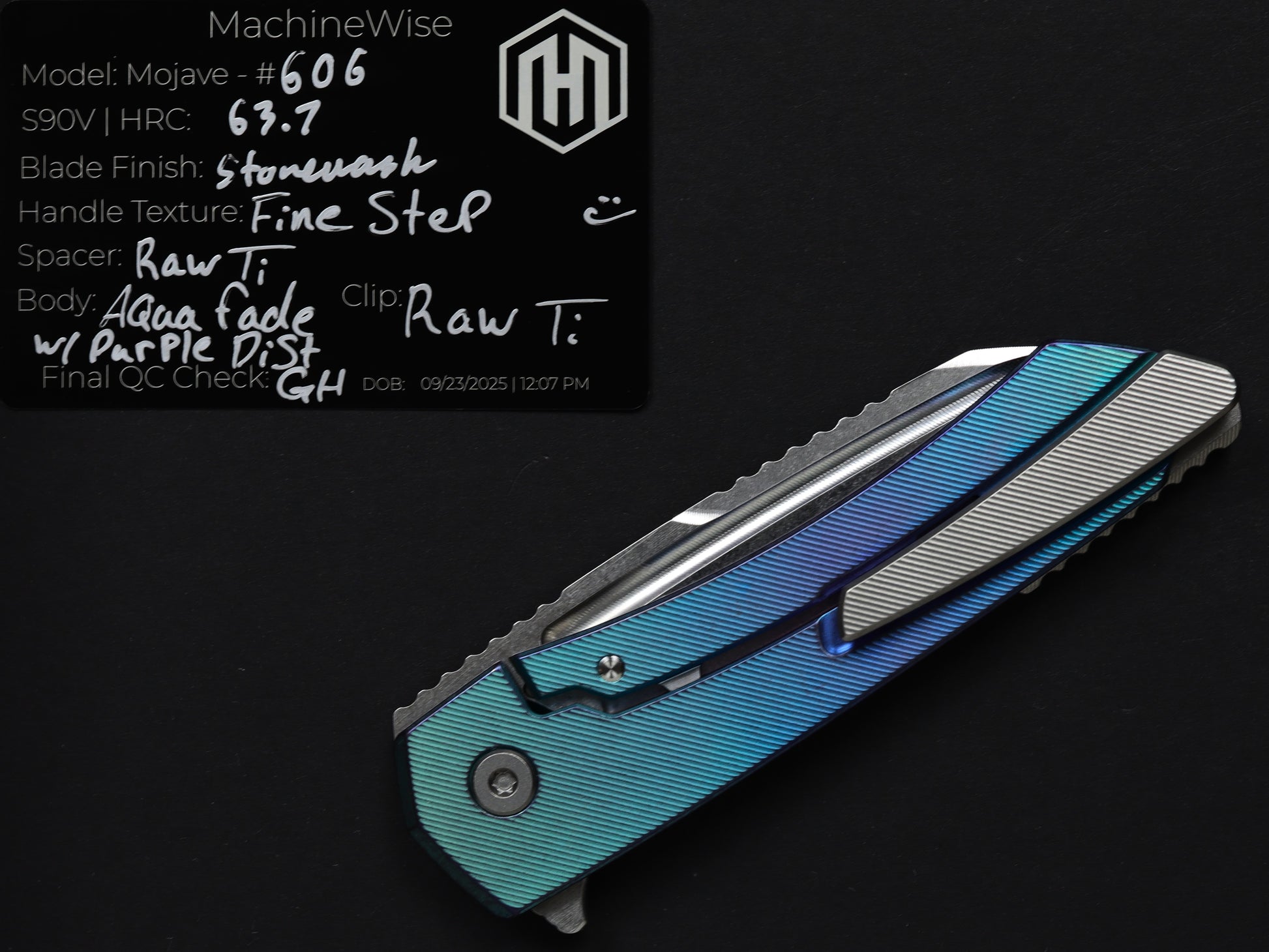 The Mojave is assembled with two slabs of titanium and a backspacer. This construction method allows us to flex our machining and design prowess.