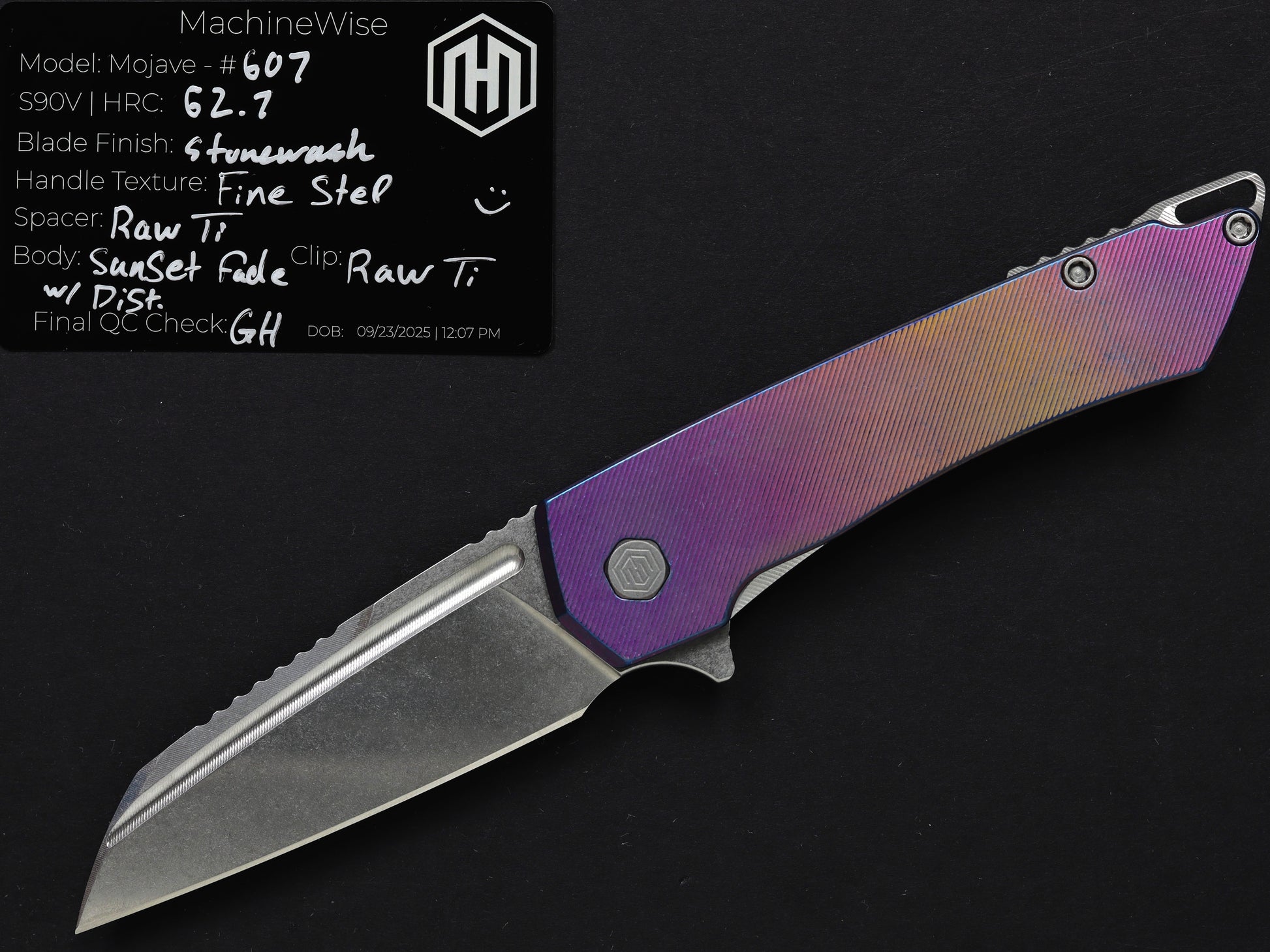The Mojave is assembled with two slabs of titanium and a backspacer. This construction method allows us to flex our machining and design prowess.