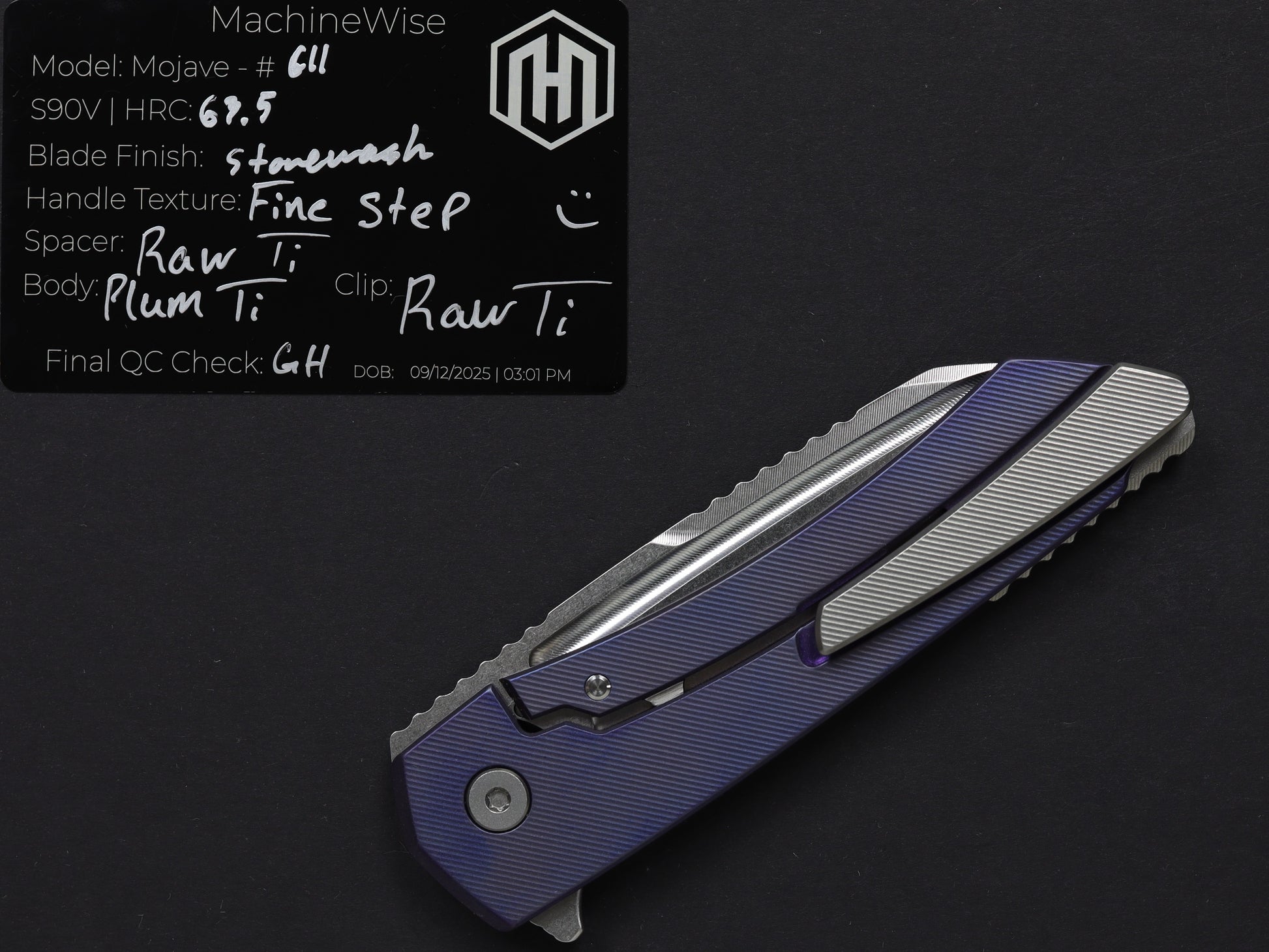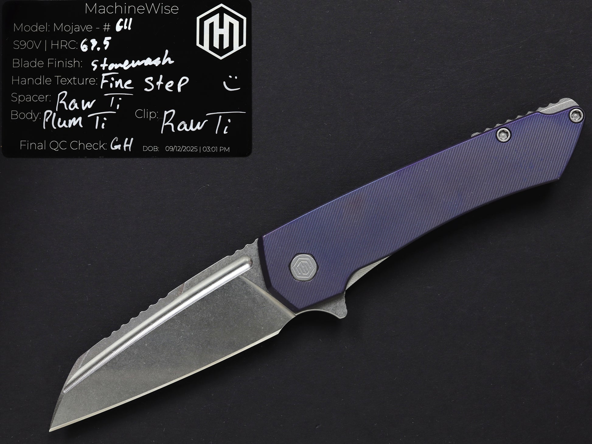 The Mojave is assembled with two slabs of titanium and a backspacer. This construction method allows us to flex our machining and design prowess.