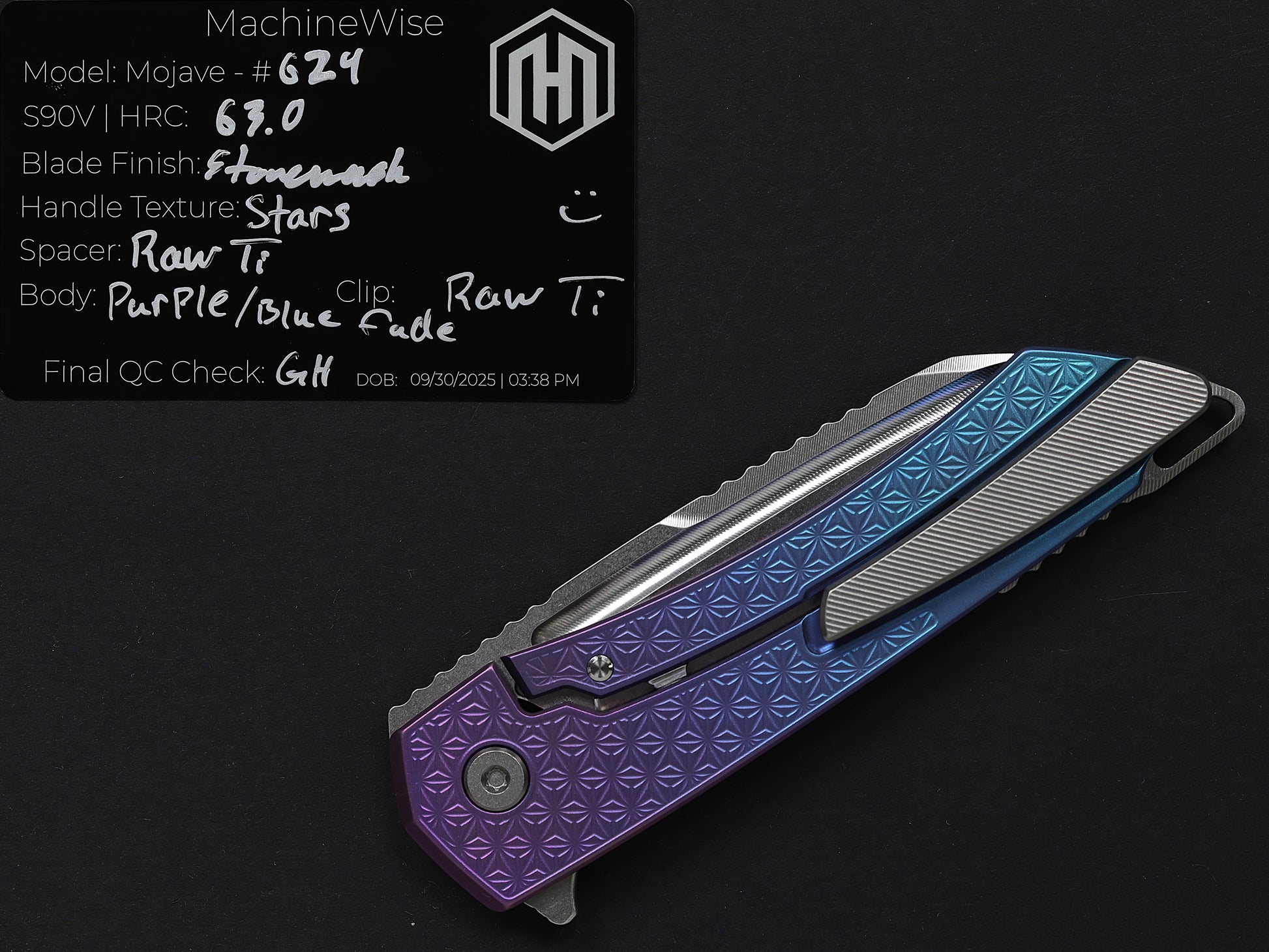 The Mojave is assembled with two slabs of titanium and a backspacer. This construction method allows us to flex our machining and design prowess.
