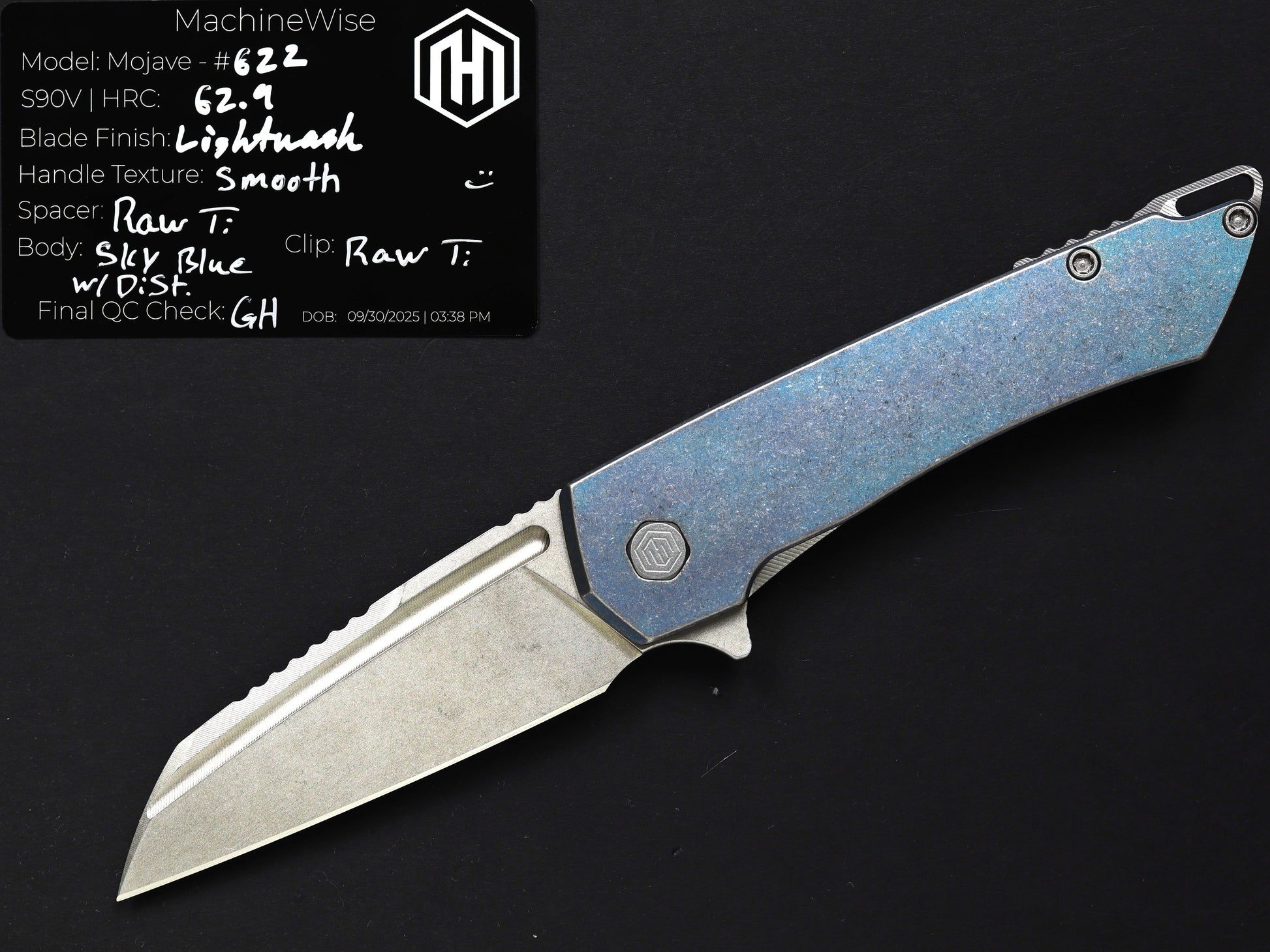 The Mojave is assembled with two slabs of titanium and a backspacer. This construction method allows us to flex our machining and design prowess.
