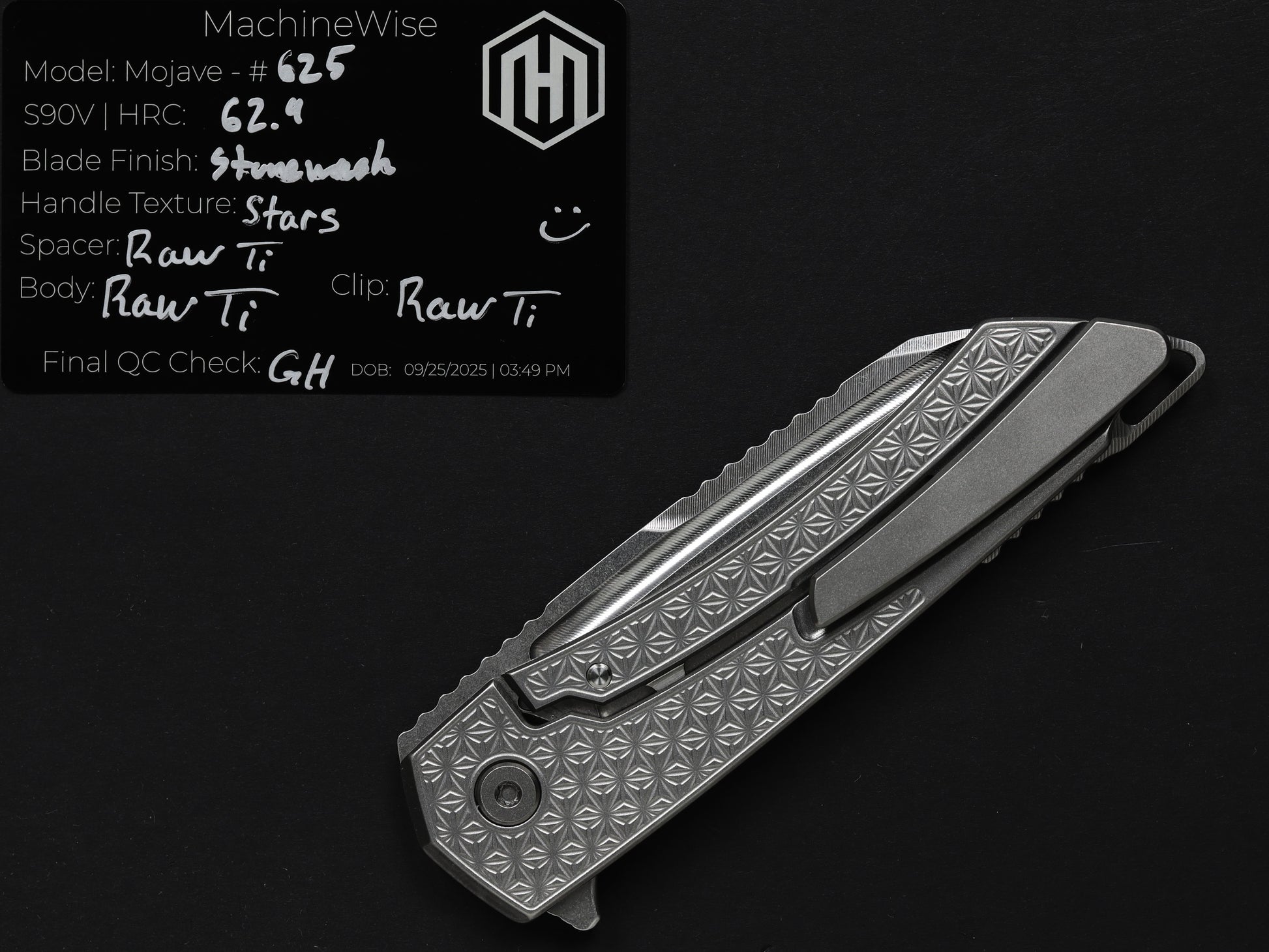 The Mojave is assembled with two slabs of titanium and a backspacer. This construction method allows us to flex our machining and design prowess.
