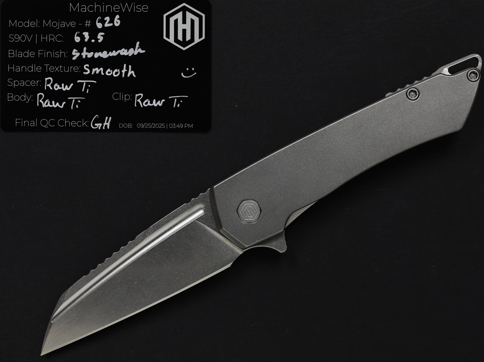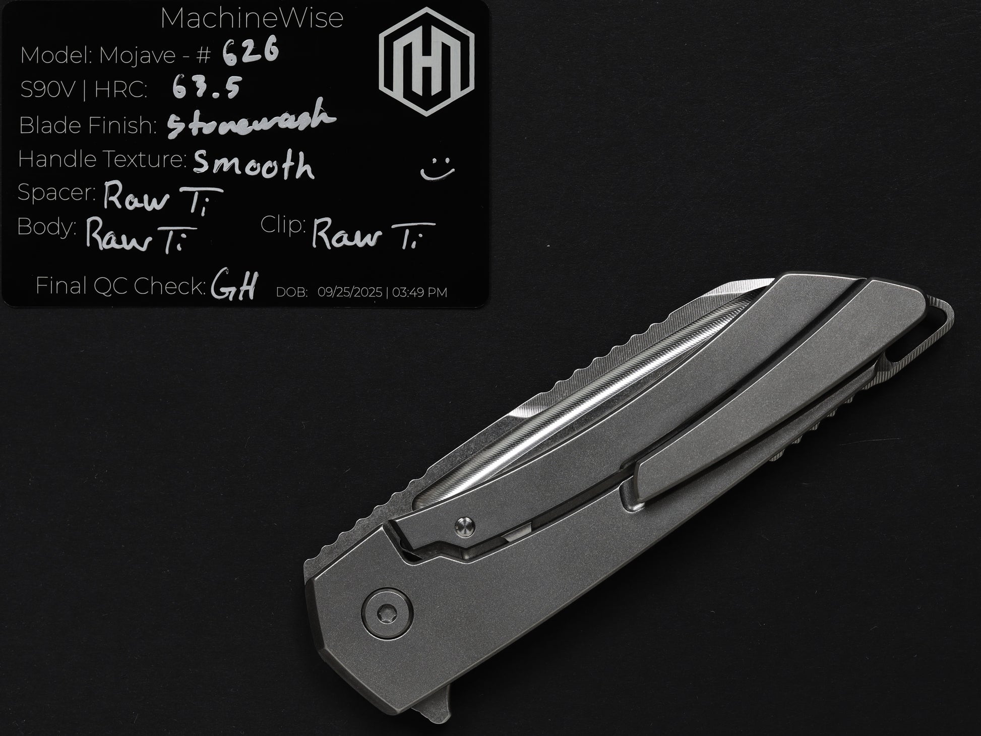 The Mojave is assembled with two slabs of titanium and a backspacer. This construction method allows us to flex our machining and design prowess.