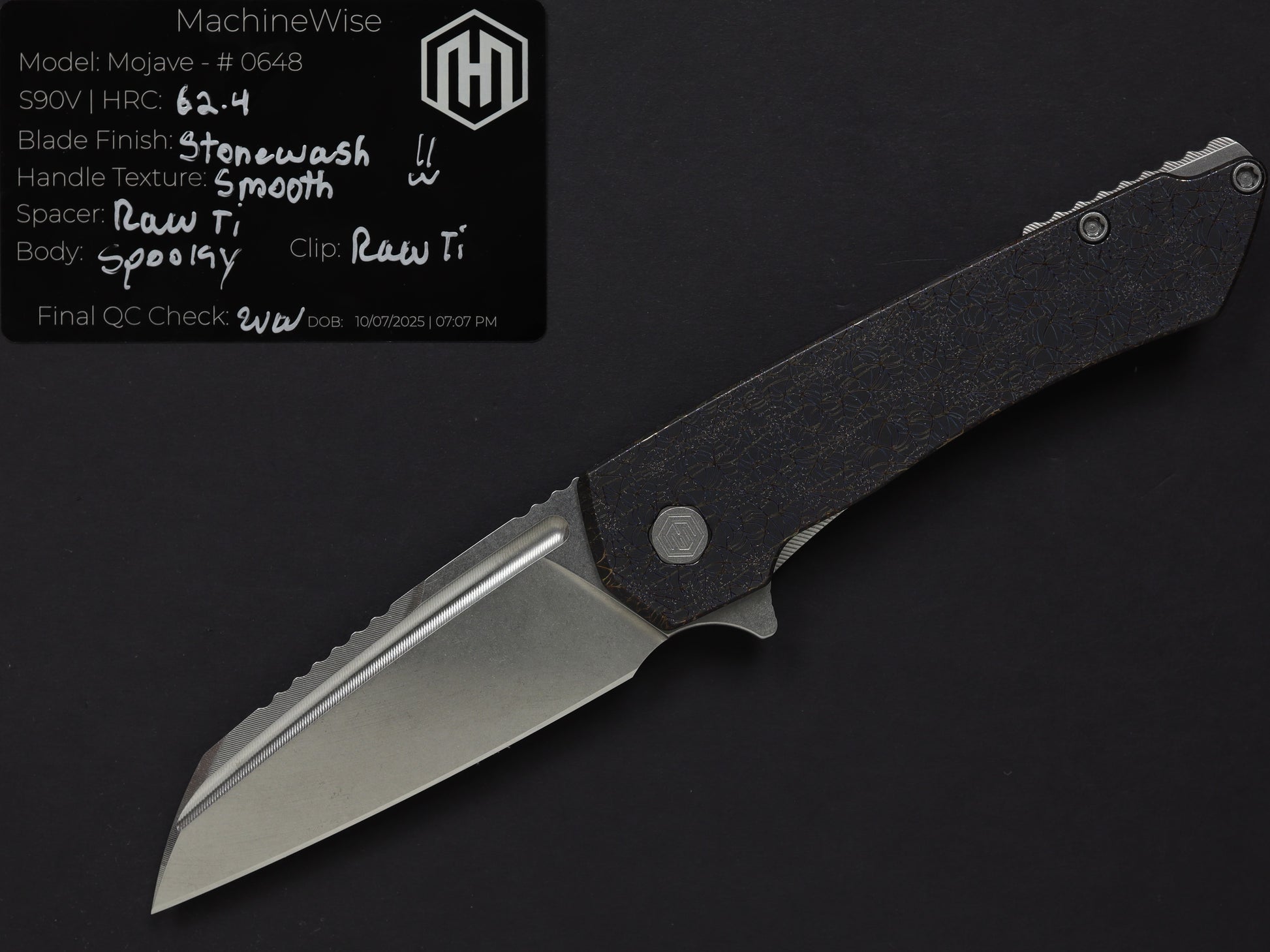The Mojave is assembled with two slabs of titanium and a backspacer. This construction method allows us to flex our machining and design prowess.