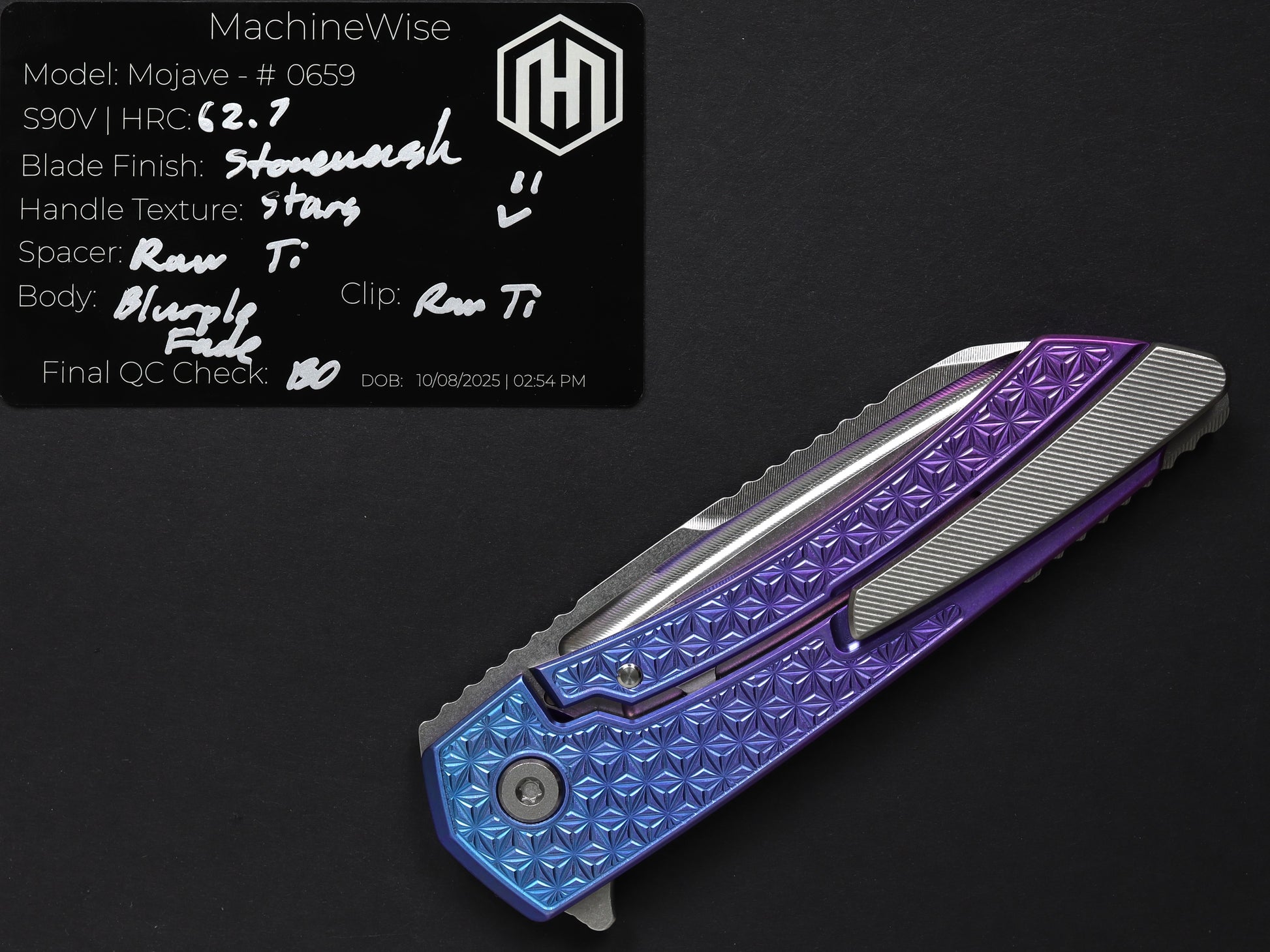The Mojave is assembled with two slabs of titanium and a backspacer. This construction method allows us to flex our machining and design prowess.