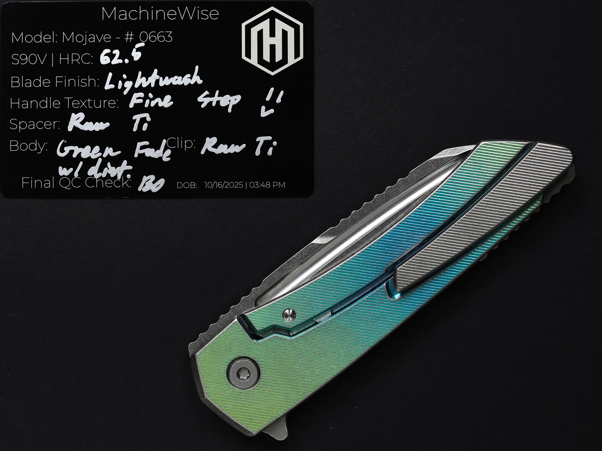 The Mojave is assembled with two slabs of titanium and a backspacer. This construction method allows us to flex our machining and design prowess.