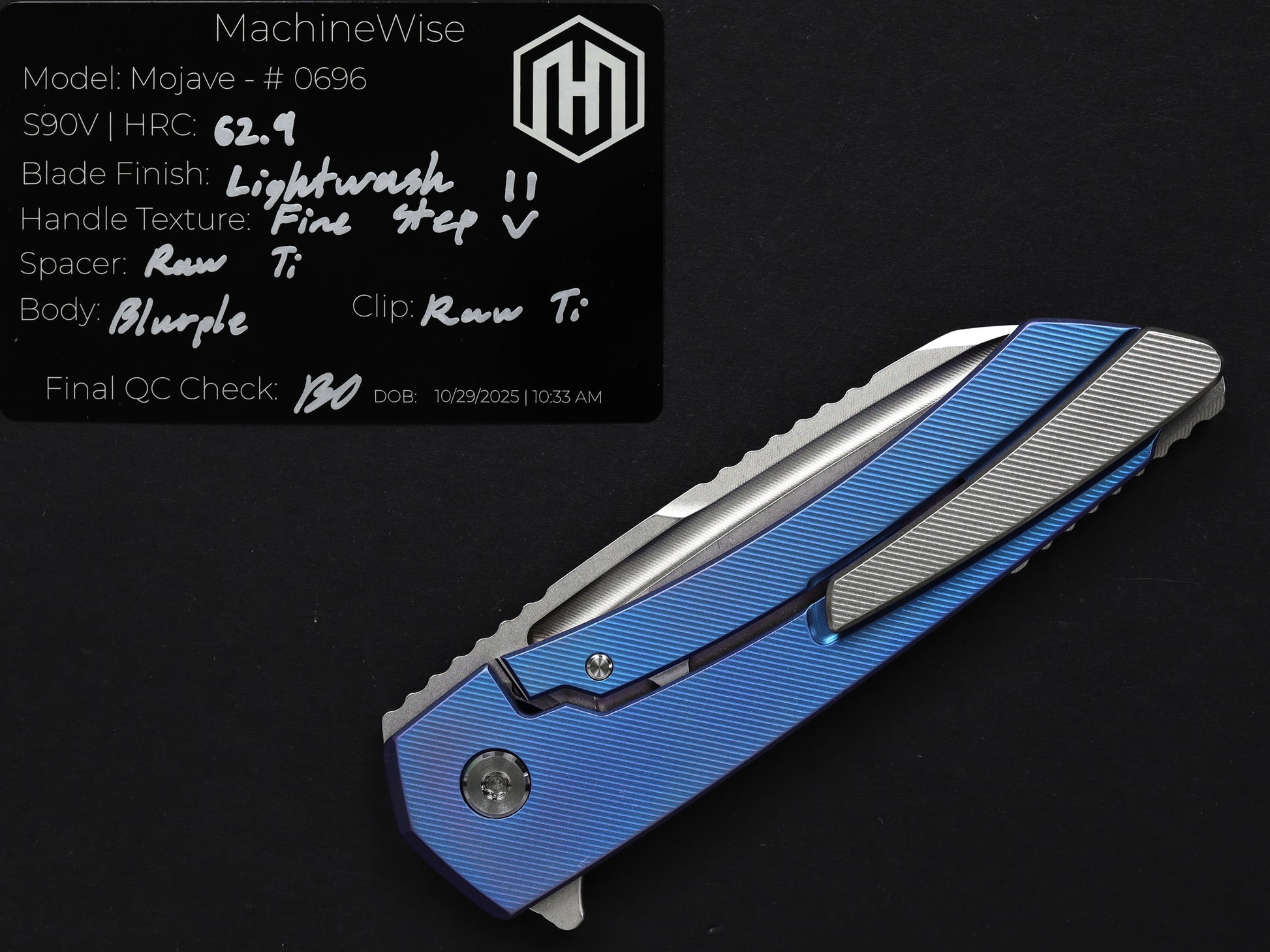 The Mojave is assembled with two slabs of titanium and a backspacer. This construction method allows us to flex our machining and design prowess.