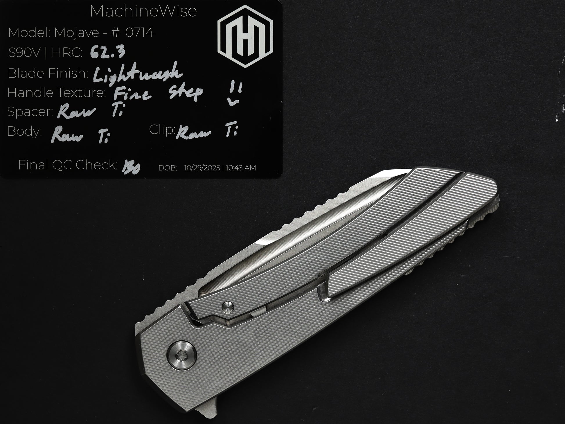 The Mojave is assembled with two slabs of titanium and a backspacer. This construction method allows us to flex our machining and design prowess.