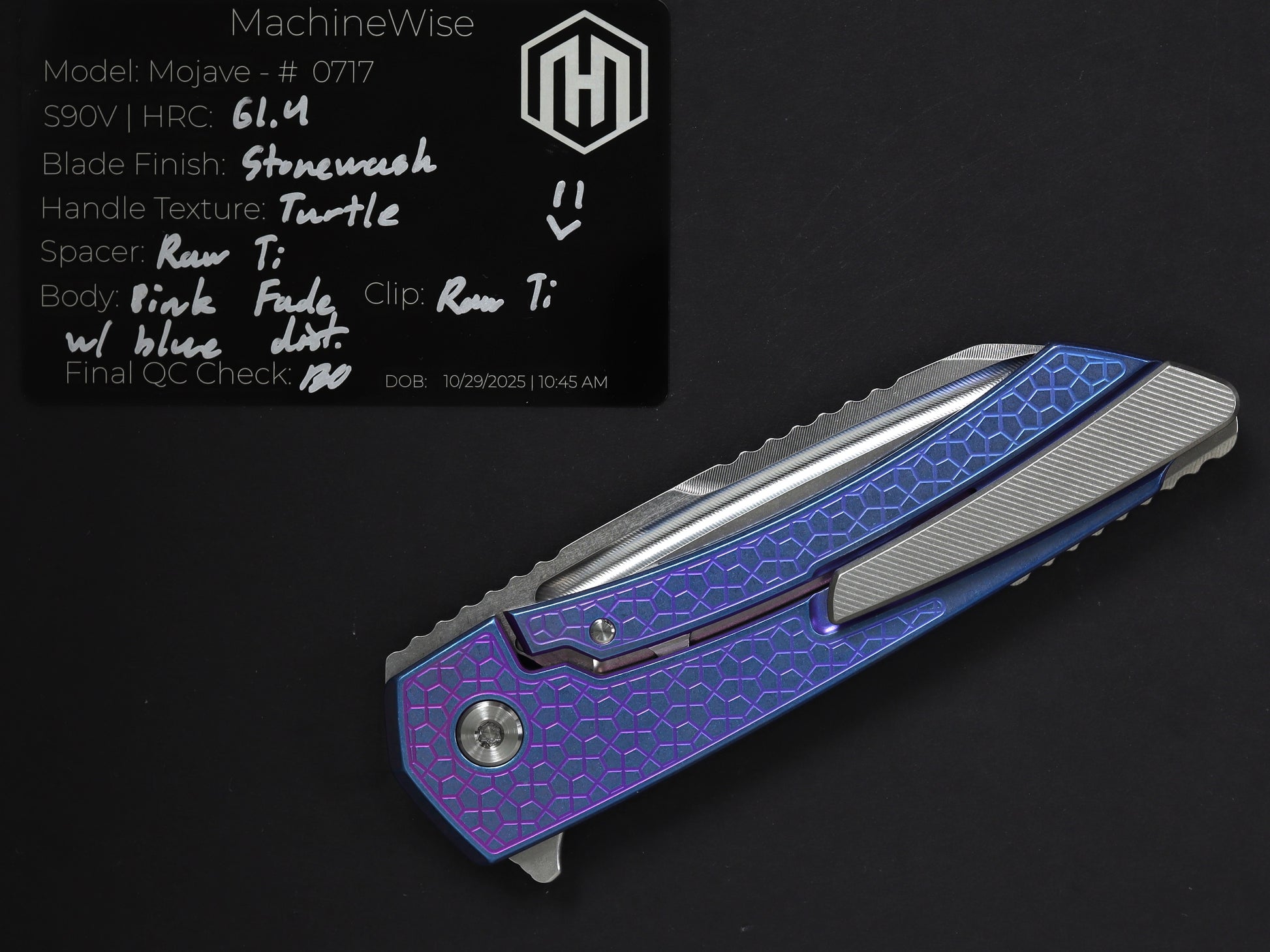 The Mojave is assembled with two slabs of titanium and a backspacer. This construction method allows us to flex our machining and design prowess.