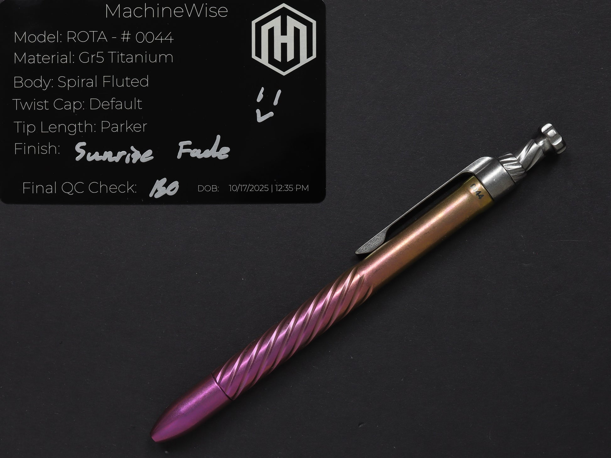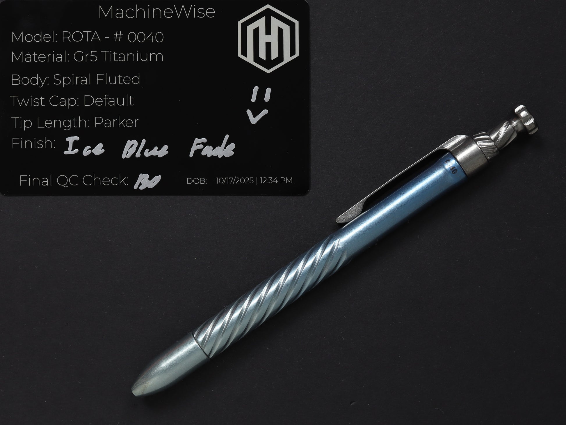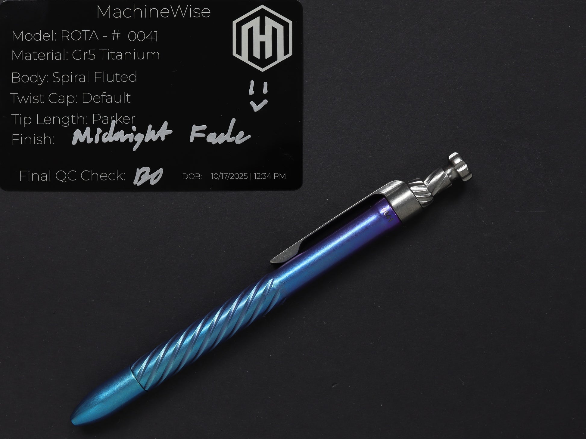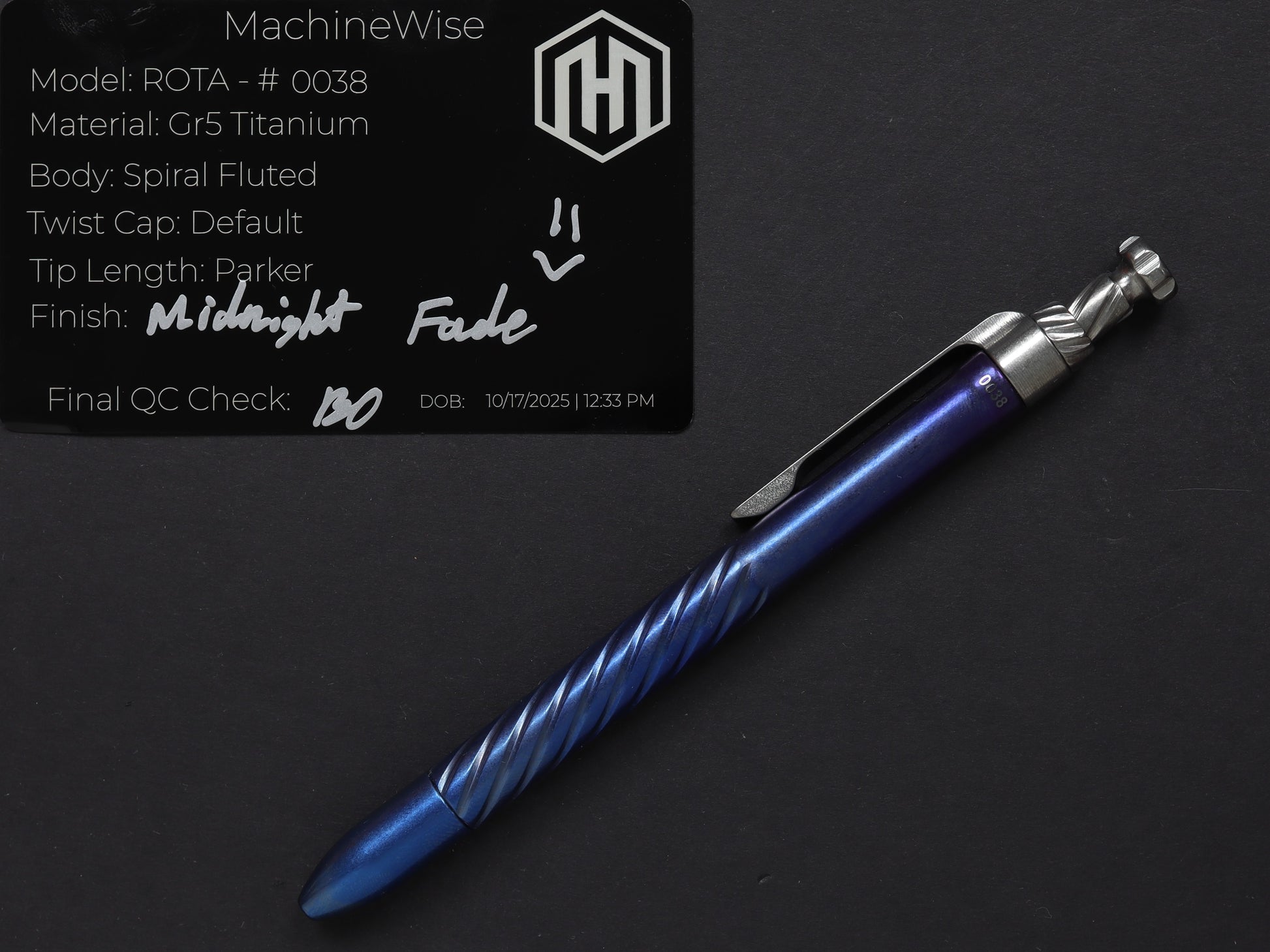 The ROTA is a machined titanium twist pen made inhouse at MachineWise. It employs a new take on our infinite twist mechanism where a quarter turn clockwise of the end knob deploys the pen. To retract a pen simply continue to turn the knob clockwise.