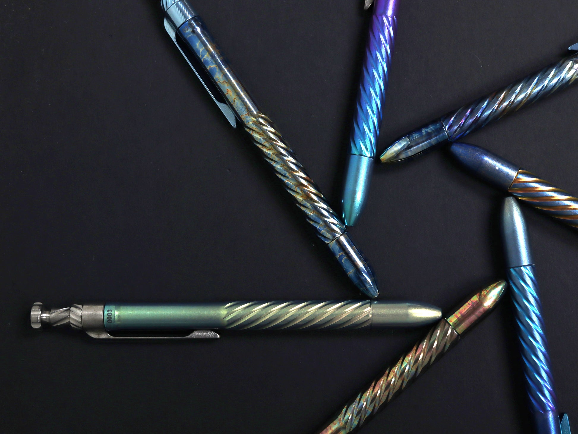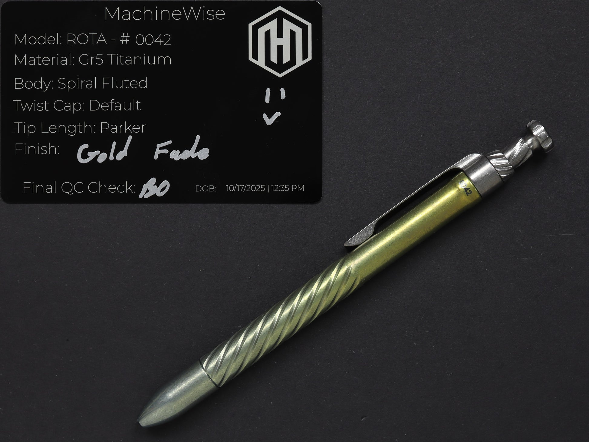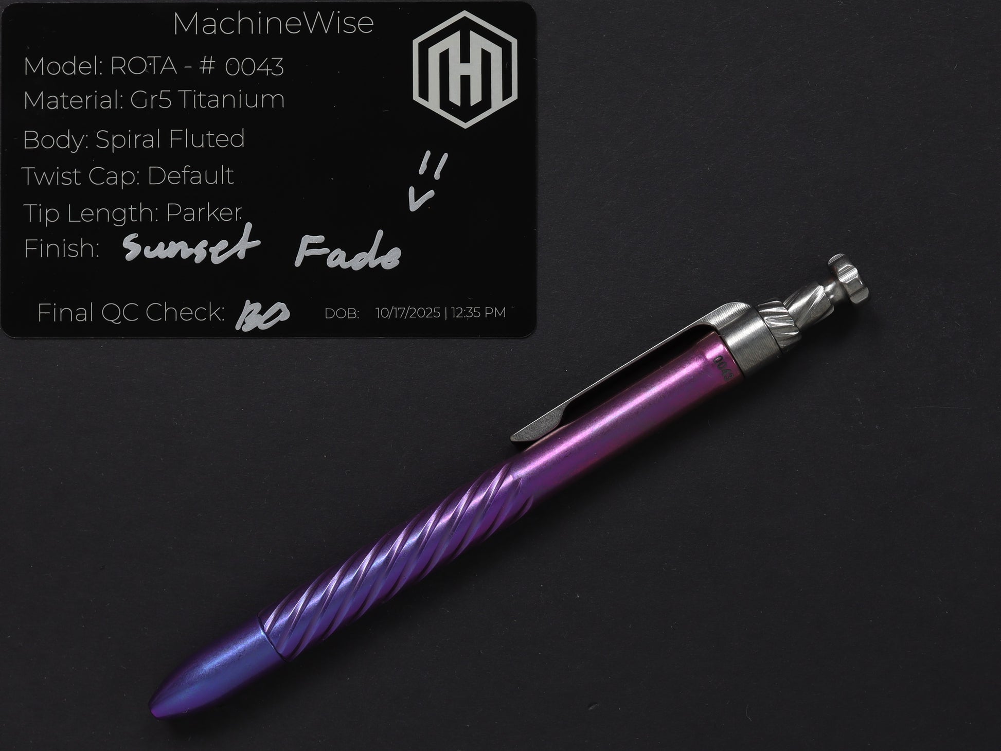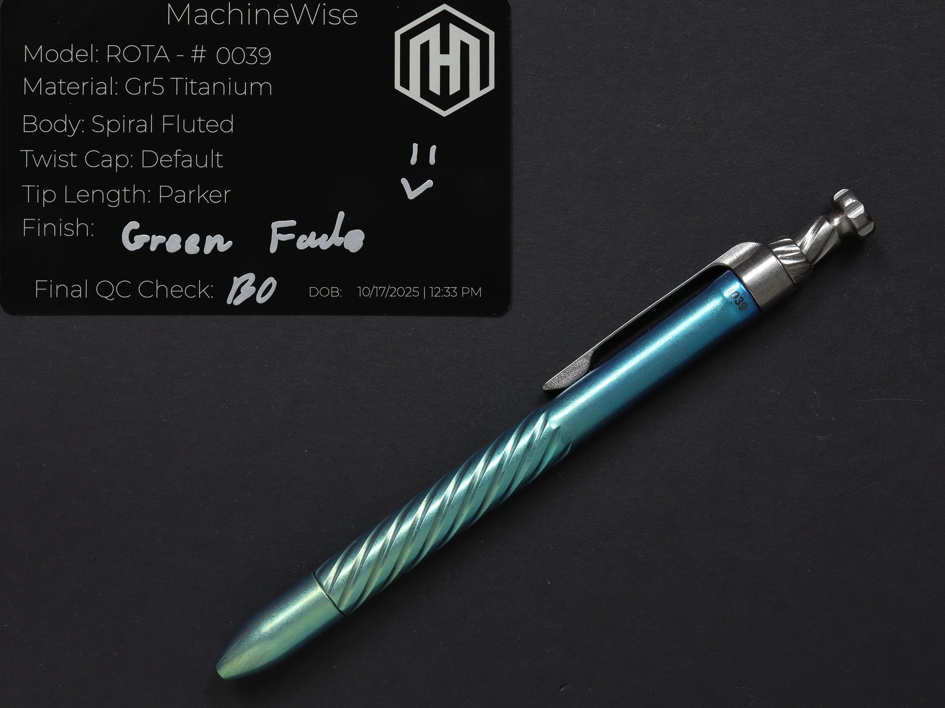 The ROTA is a machined titanium twist pen made inhouse at MachineWise. It employs a new take on our infinite twist mechanism where a quarter turn clockwise of the end knob deploys the pen. To retract a pen simply continue to turn the knob clockwise.