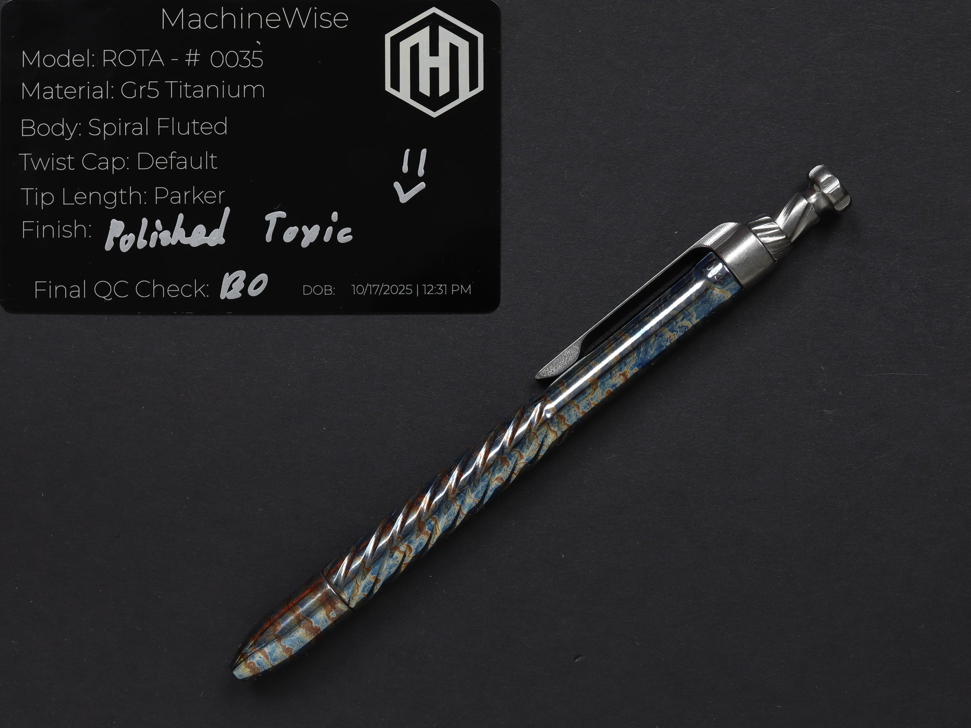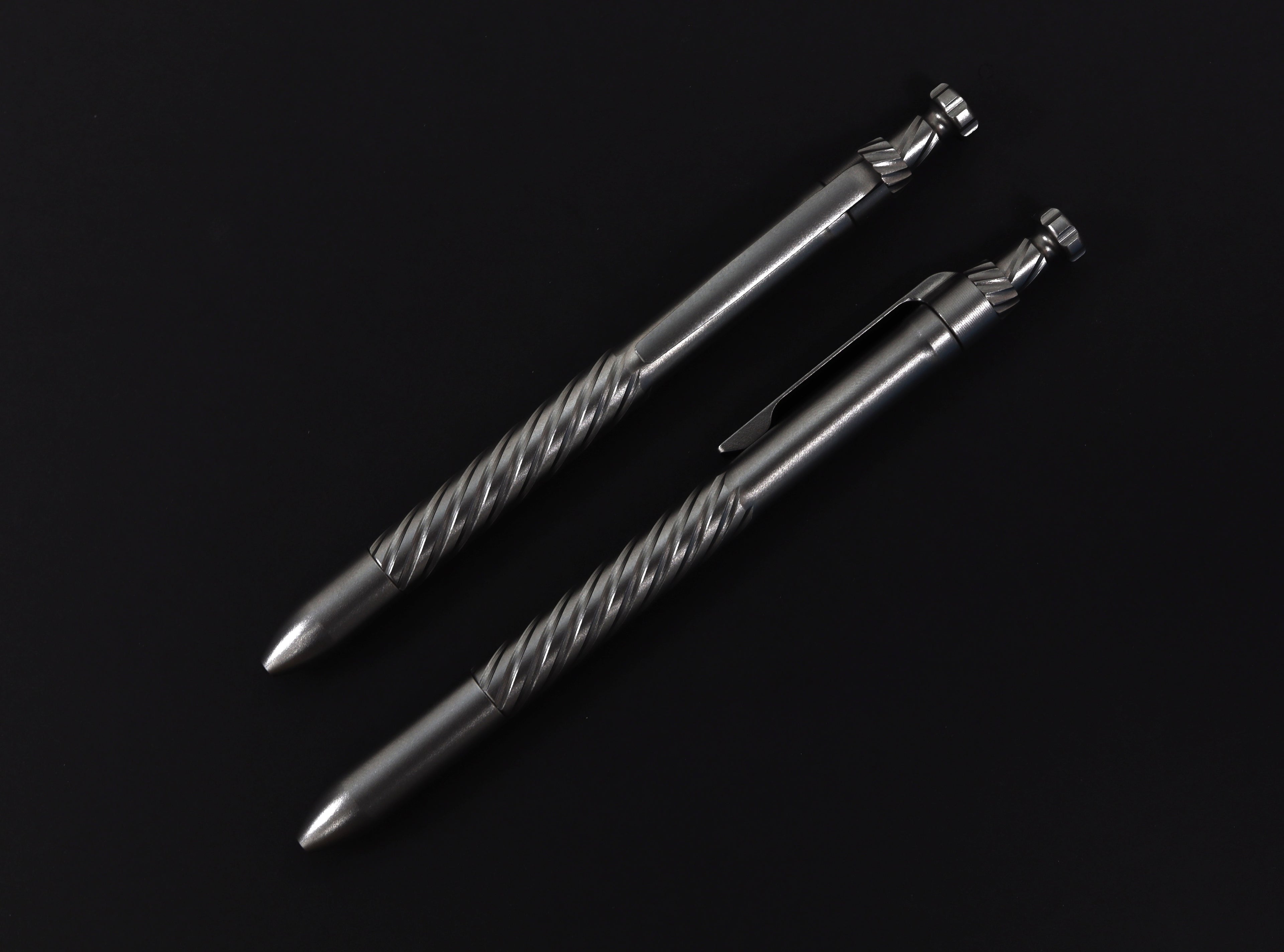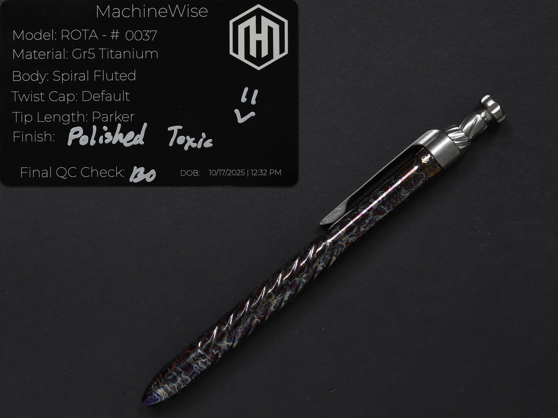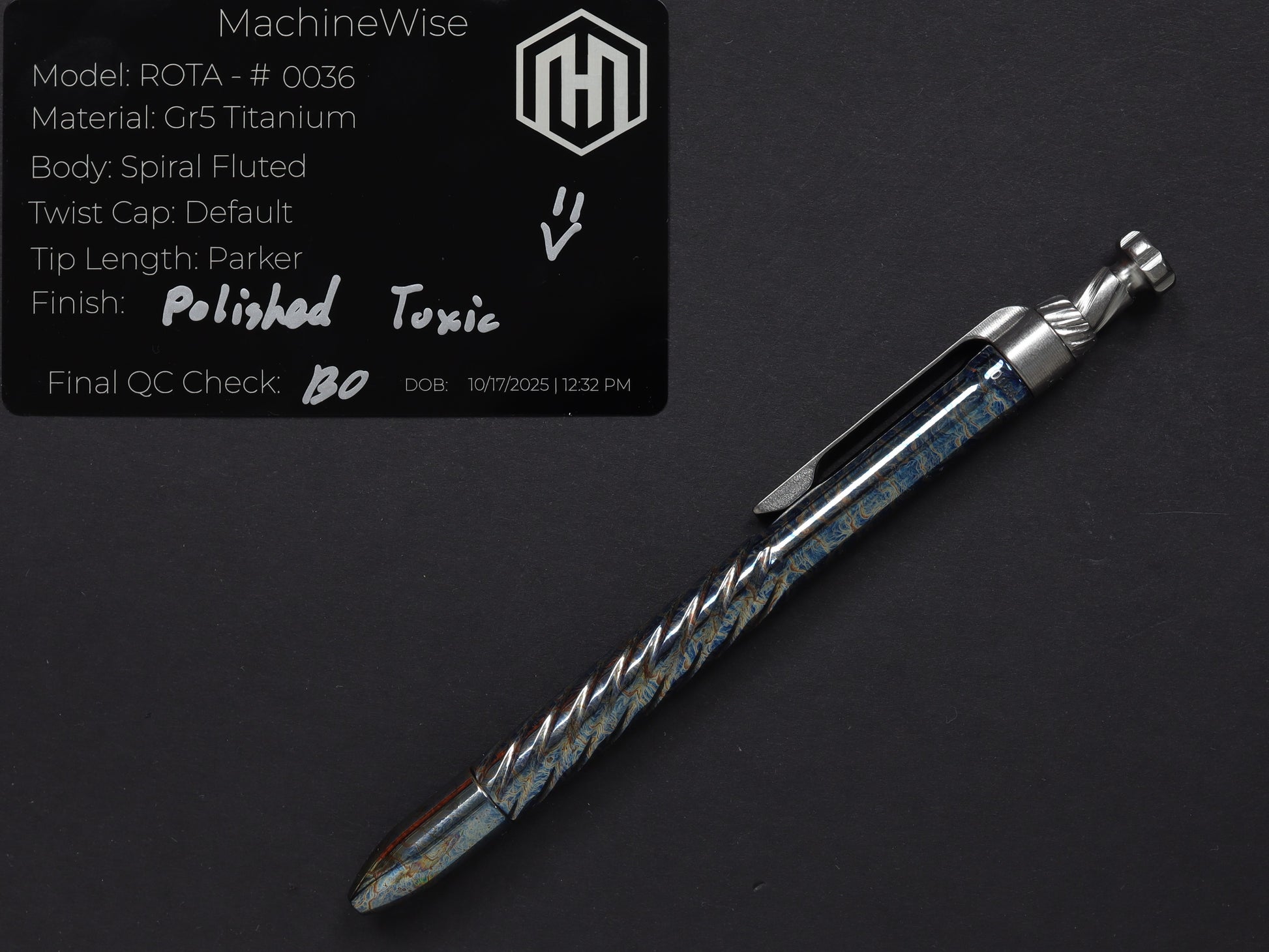 The ROTA is a machined titanium twist pen made inhouse at MachineWise. It employs a new take on our infinite twist mechanism where a quarter turn clockwise of the end knob deploys the pen. To retract a pen simply continue to turn the knob clockwise.